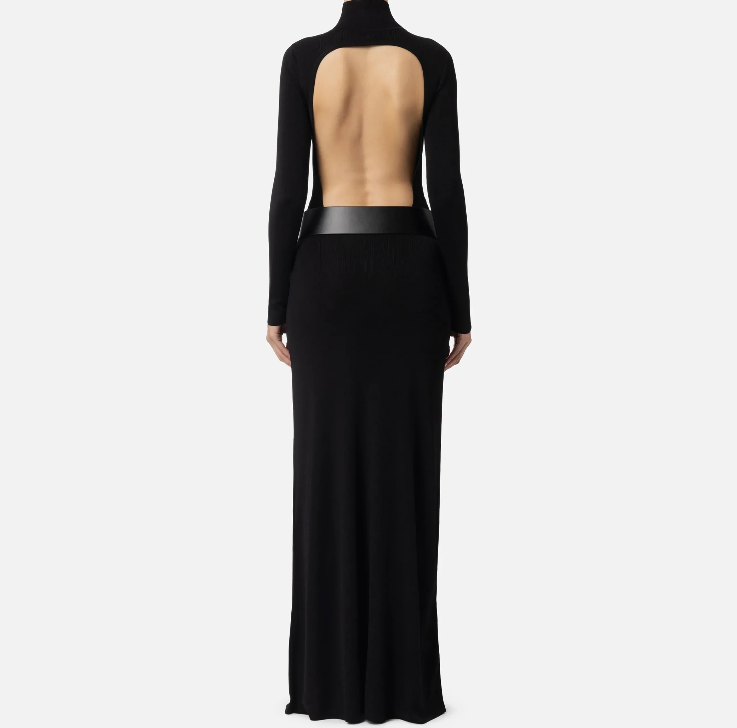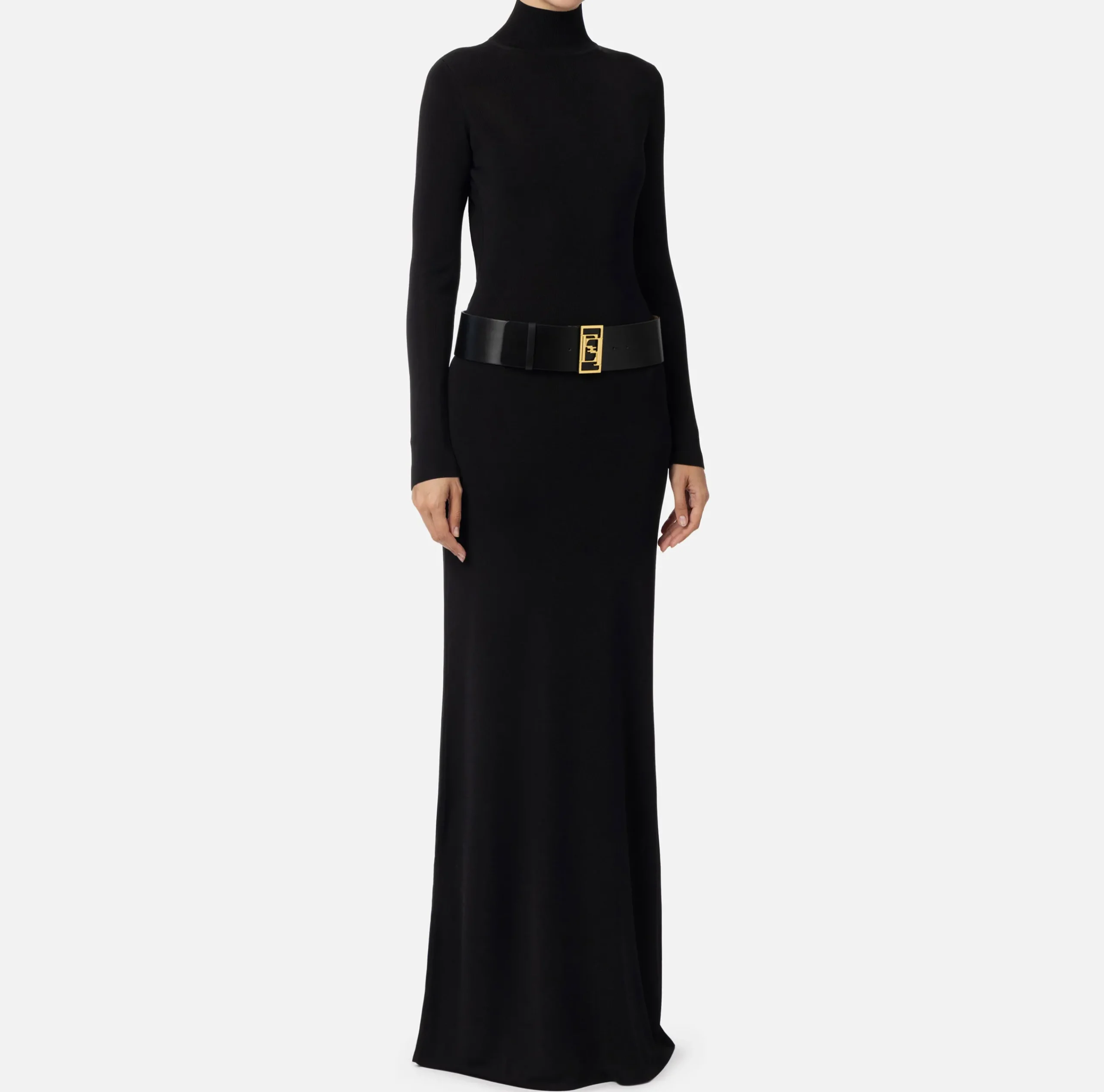 Abito red carpet in viscosa lucida a maniche lunghe con collo alto e scollatura sulla schiena. Il punto vita è enfatizzato da una cintura a vita bassa in materiale sintetico effetto pelle con logo in metallo dorato.