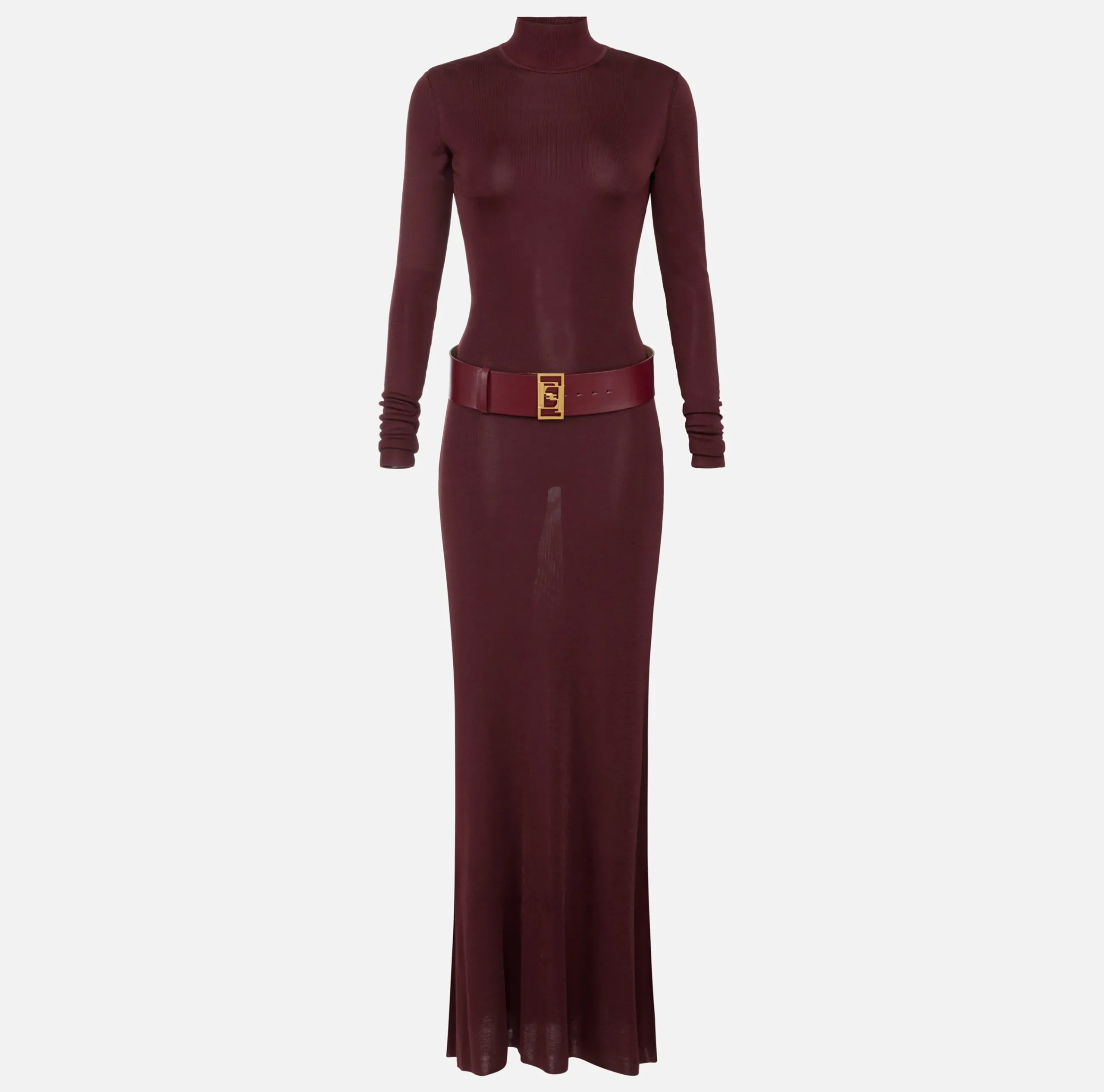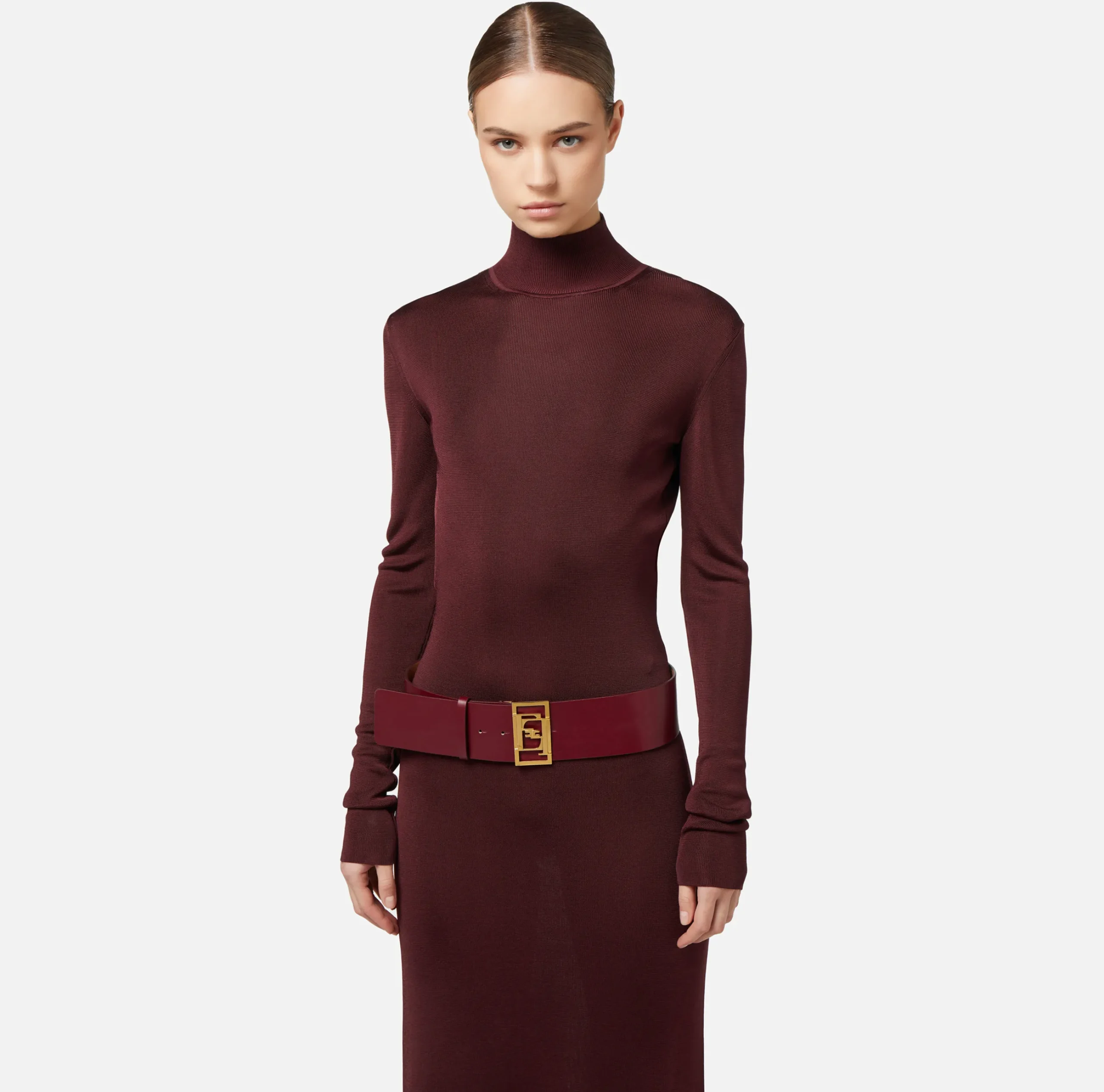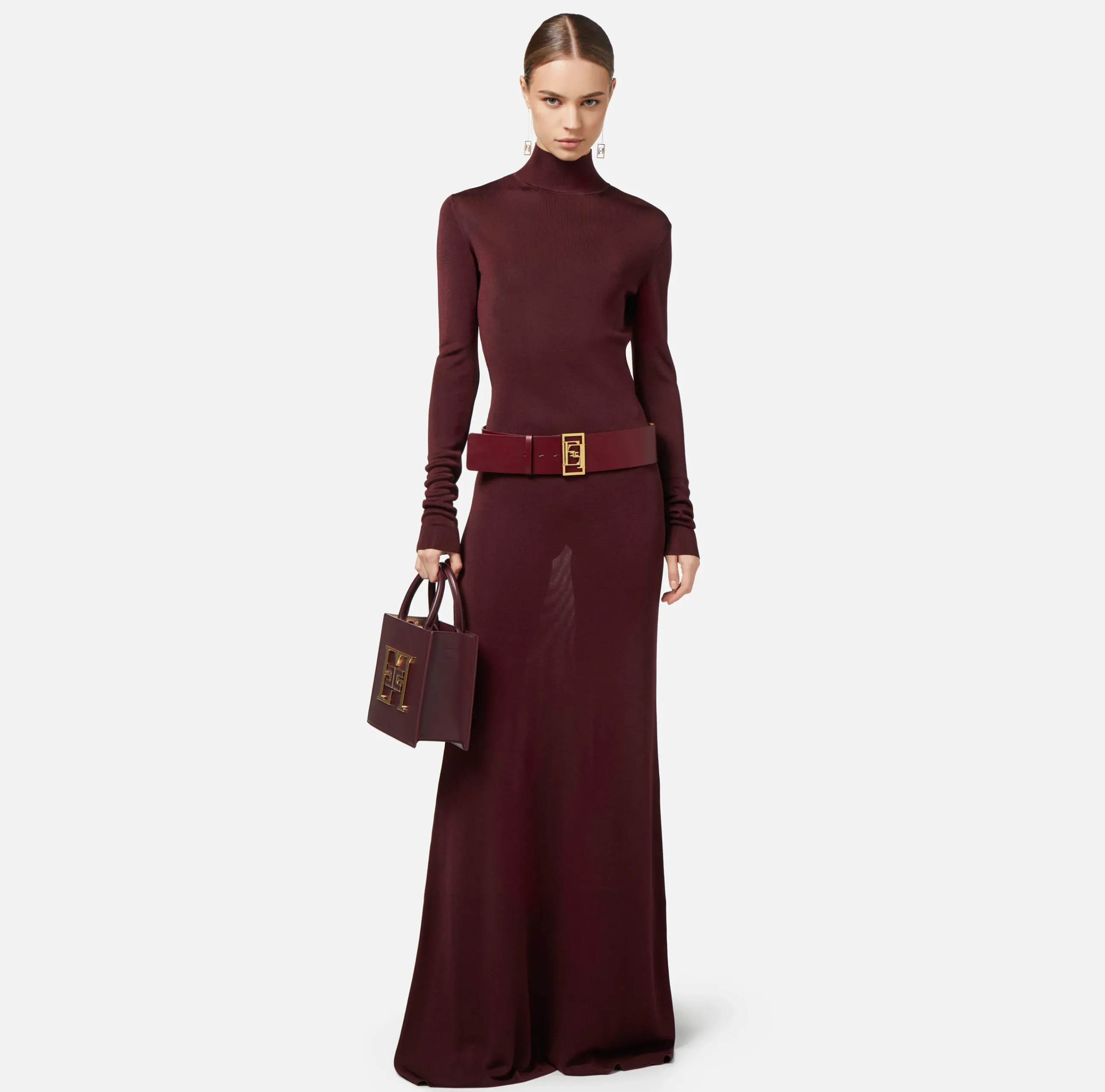 Abito red carpet in viscosa lucida a maniche lunghe con collo alto e scollatura sulla schiena. Il punto vita è enfatizzato da una cintura a vita bassa in materiale sintetico effetto pelle con logo in metallo dorato.