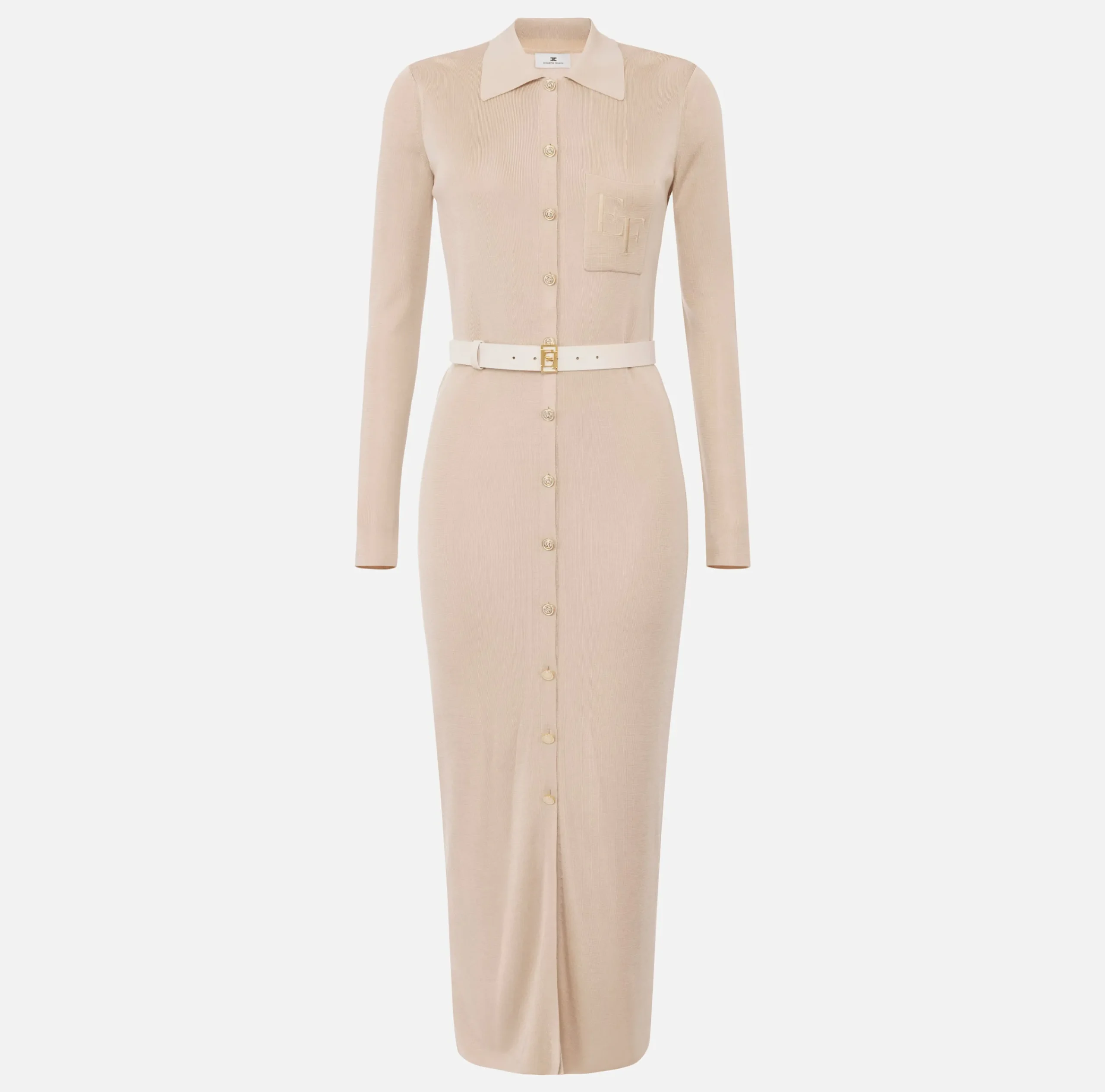 Abiti In Maglia|Abiti|Elisabetta Franchi Abito lungo in viscosa lucida con ricamo logo e cintura Lattice