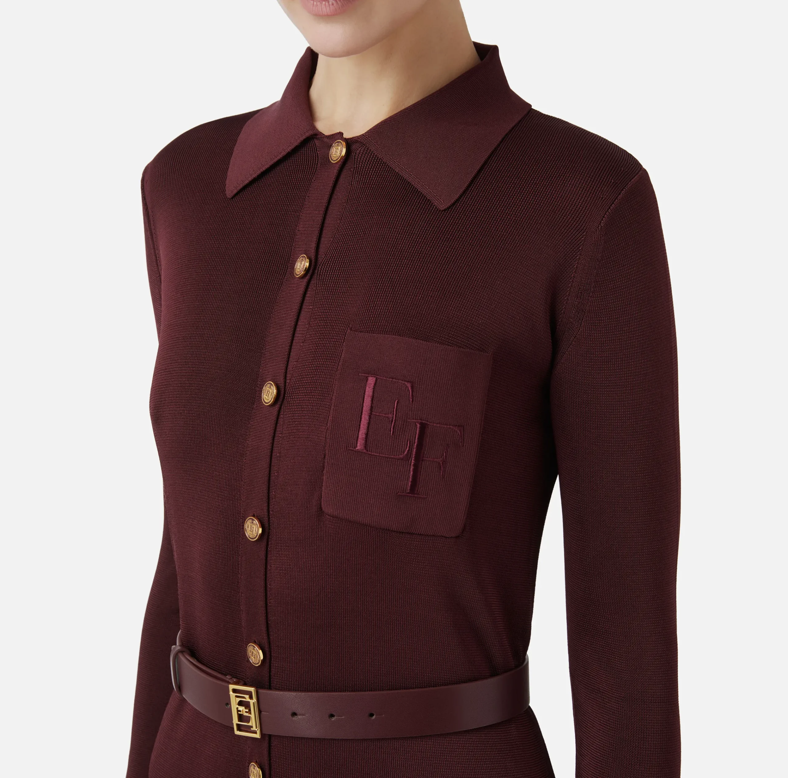 Abiti In Maglia|Abiti|Elisabetta Franchi Abito lungo in viscosa lucida con ricamo logo e cintura RougeNoir