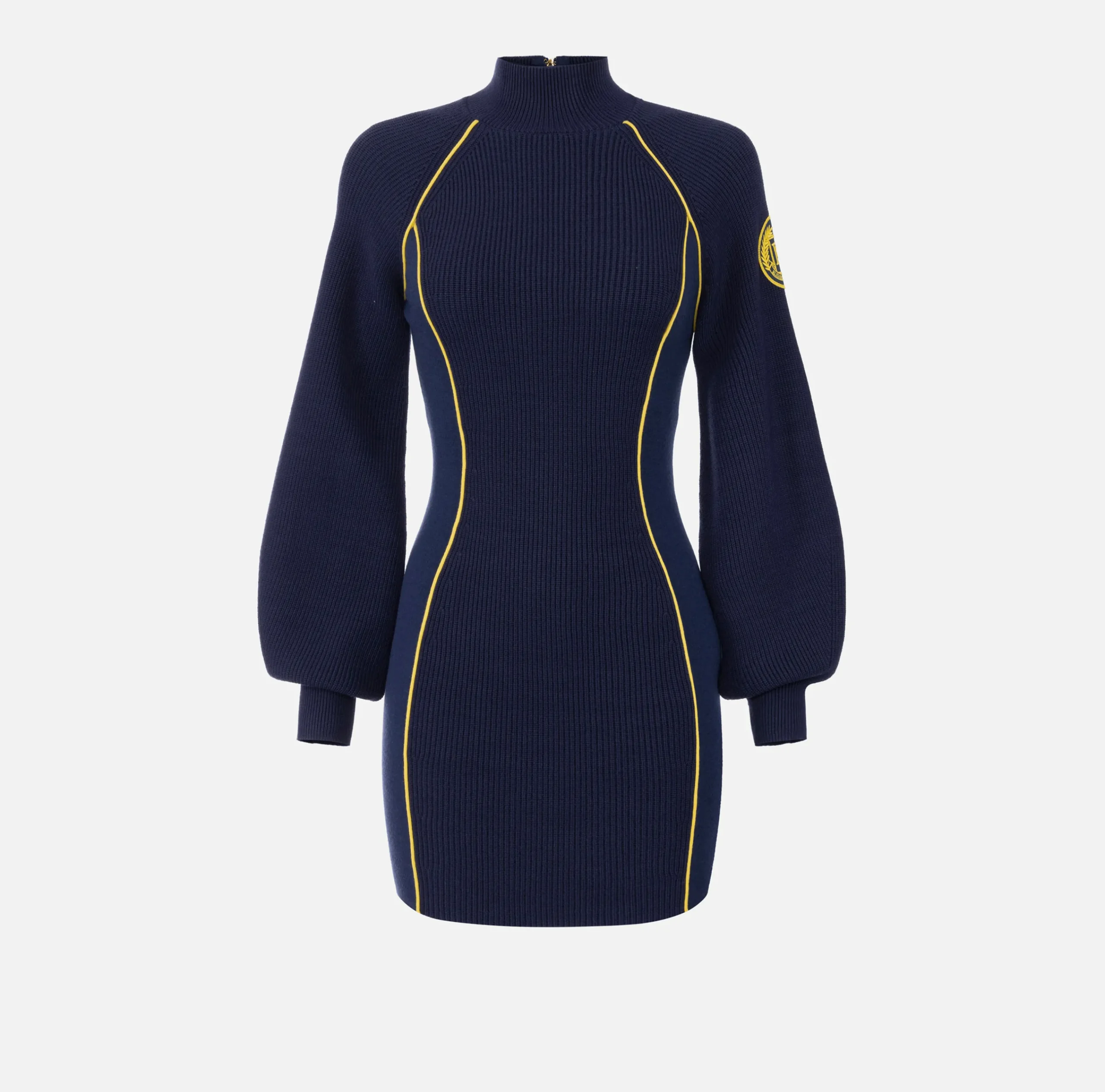 Miniabito in viscosa punto pannocchia con collo alto e maniche raglan. È caratterizzato da patch logo ricamato sul braccio e bande in punto stoffa nei fianchi con profili in contrasto colore.