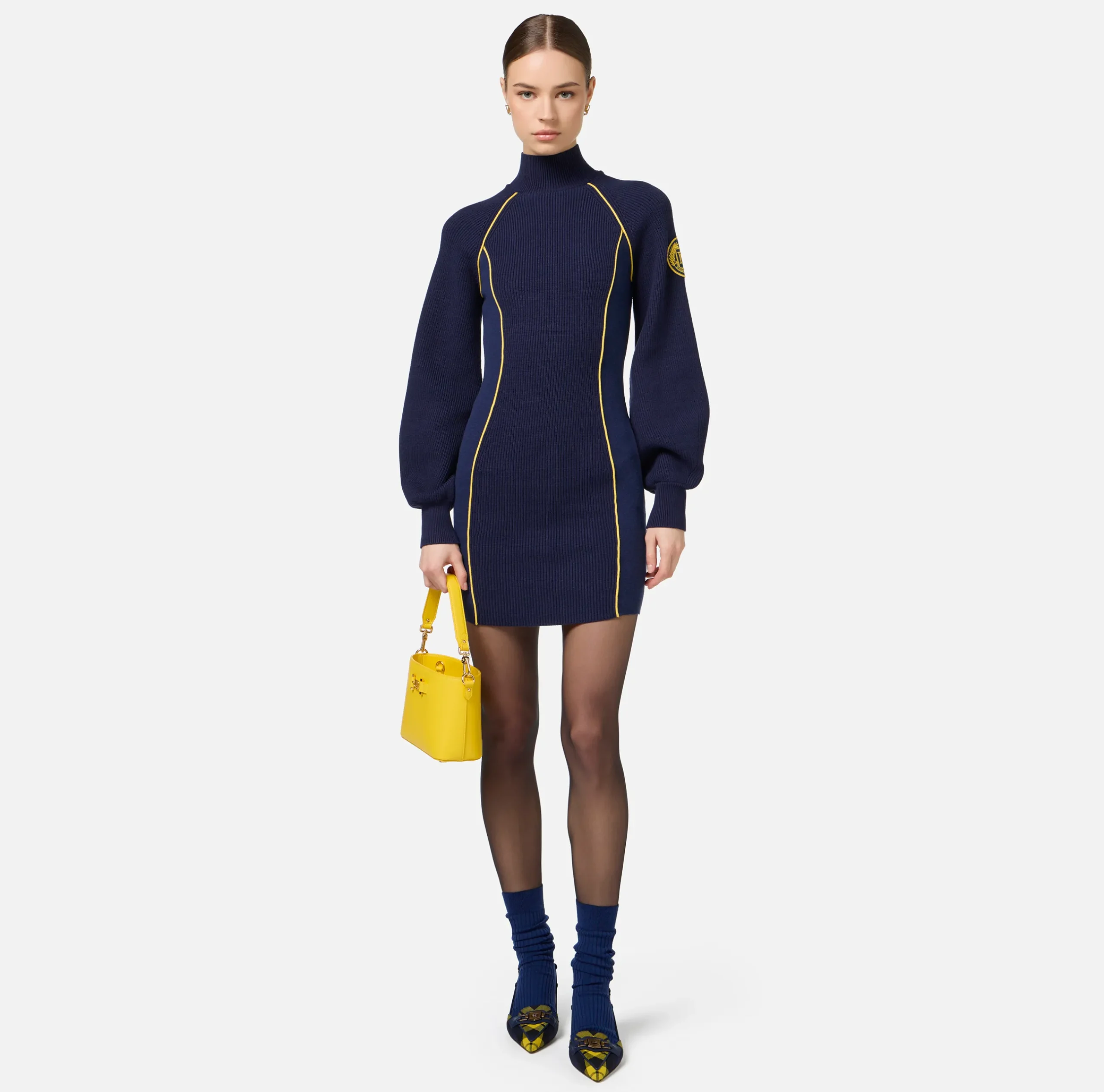 Abiti In Maglia|Mini Abiti|Elisabetta Franchi Miniabito in viscosa con patch logo Navy/Mimosa