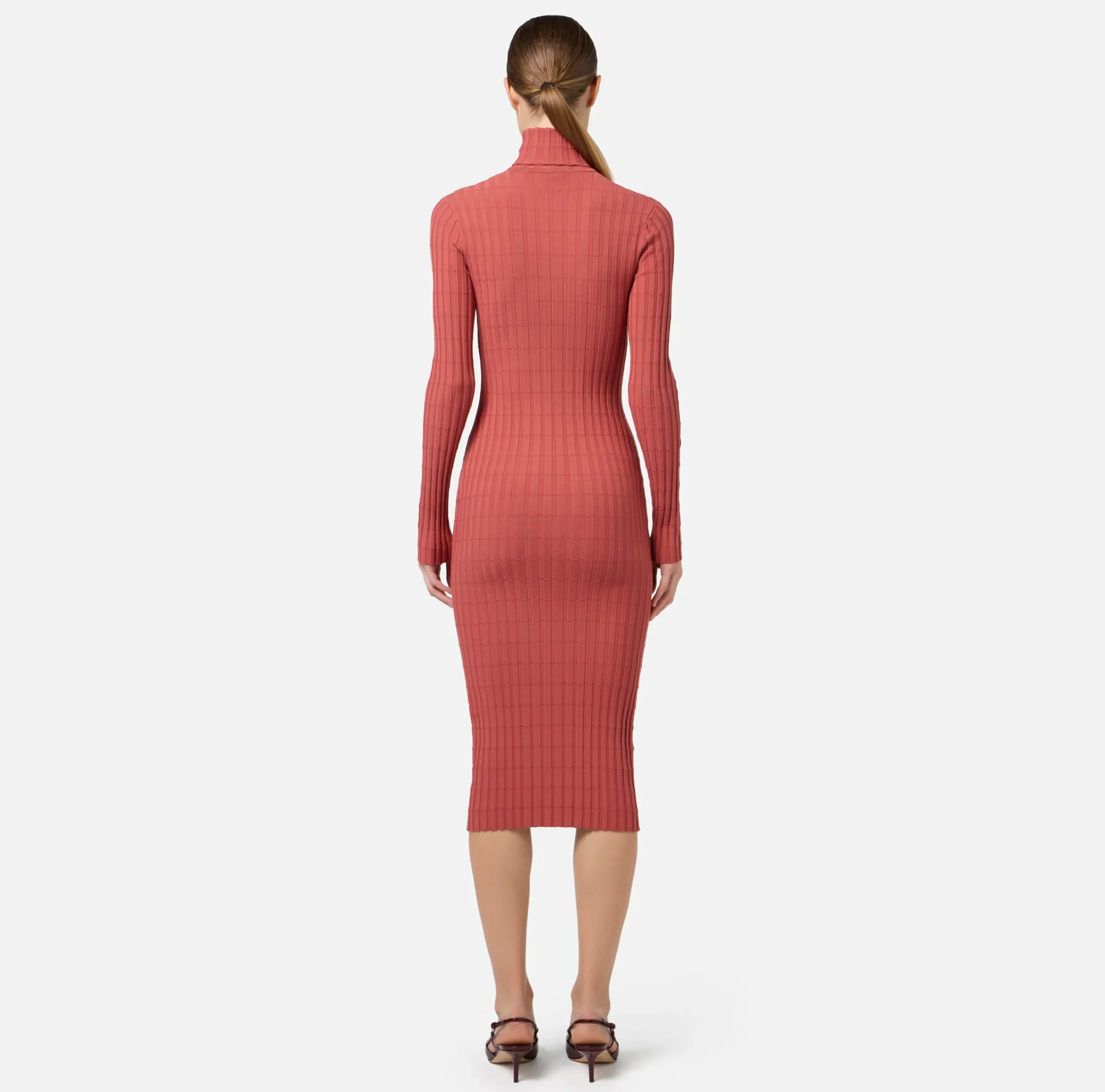 Abito midi a coste con maniche lunghe, scollo a V e dolcevita. È caratterizzato da finta abbottonatura in metallo dorato.