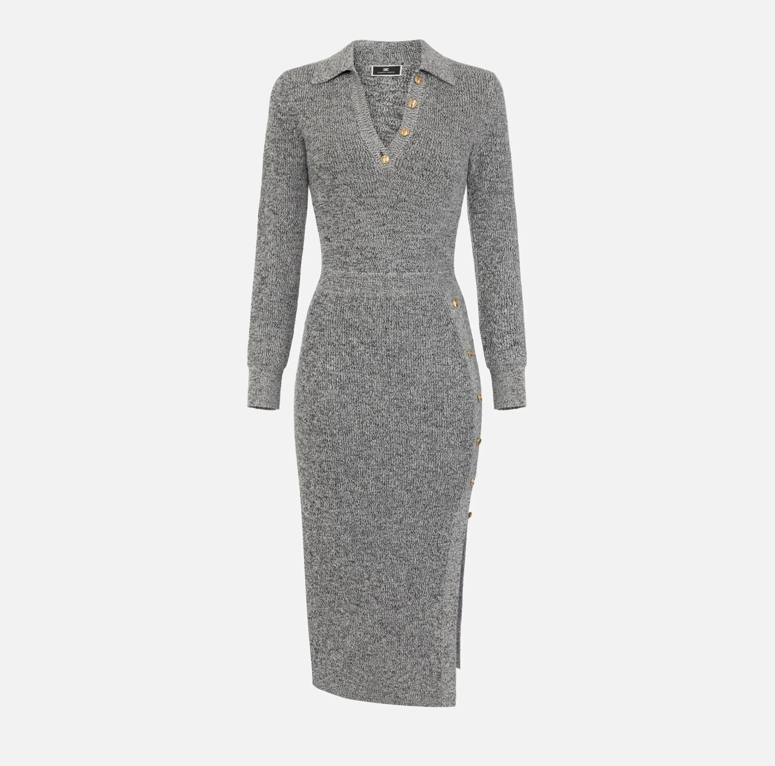 Abito midi in lana mouliné punto pannocchia con collo a polo. È caratterizzato da patch logo ricamato sul seno e bottoni in metallo dorato su spacco laterale e scollo.