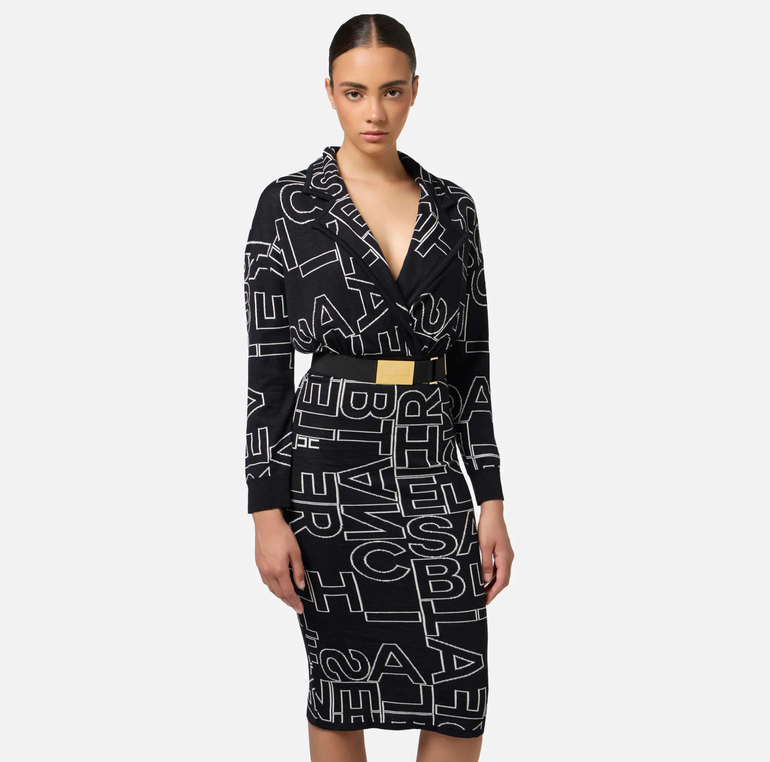 Abito midi in misto lana lettering all over a maniche lunghe. È caratterizzato da revers a lancia, spalle scese e cintura in elastico con placca logo in metallo dorato.