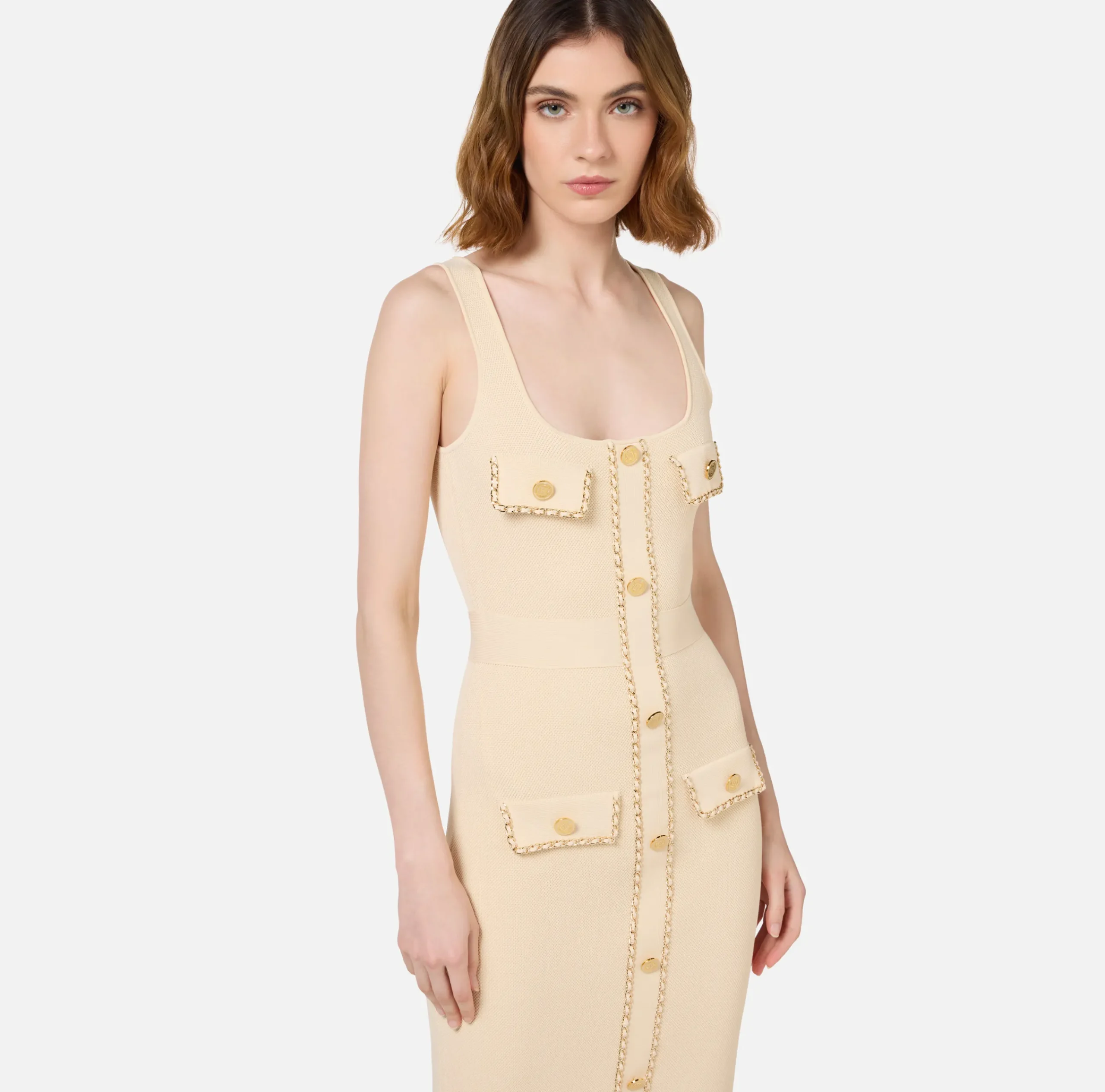 Abiti Midi|Abiti In Maglia|Elisabetta Franchi Abito midi in viscosa con catena Crema