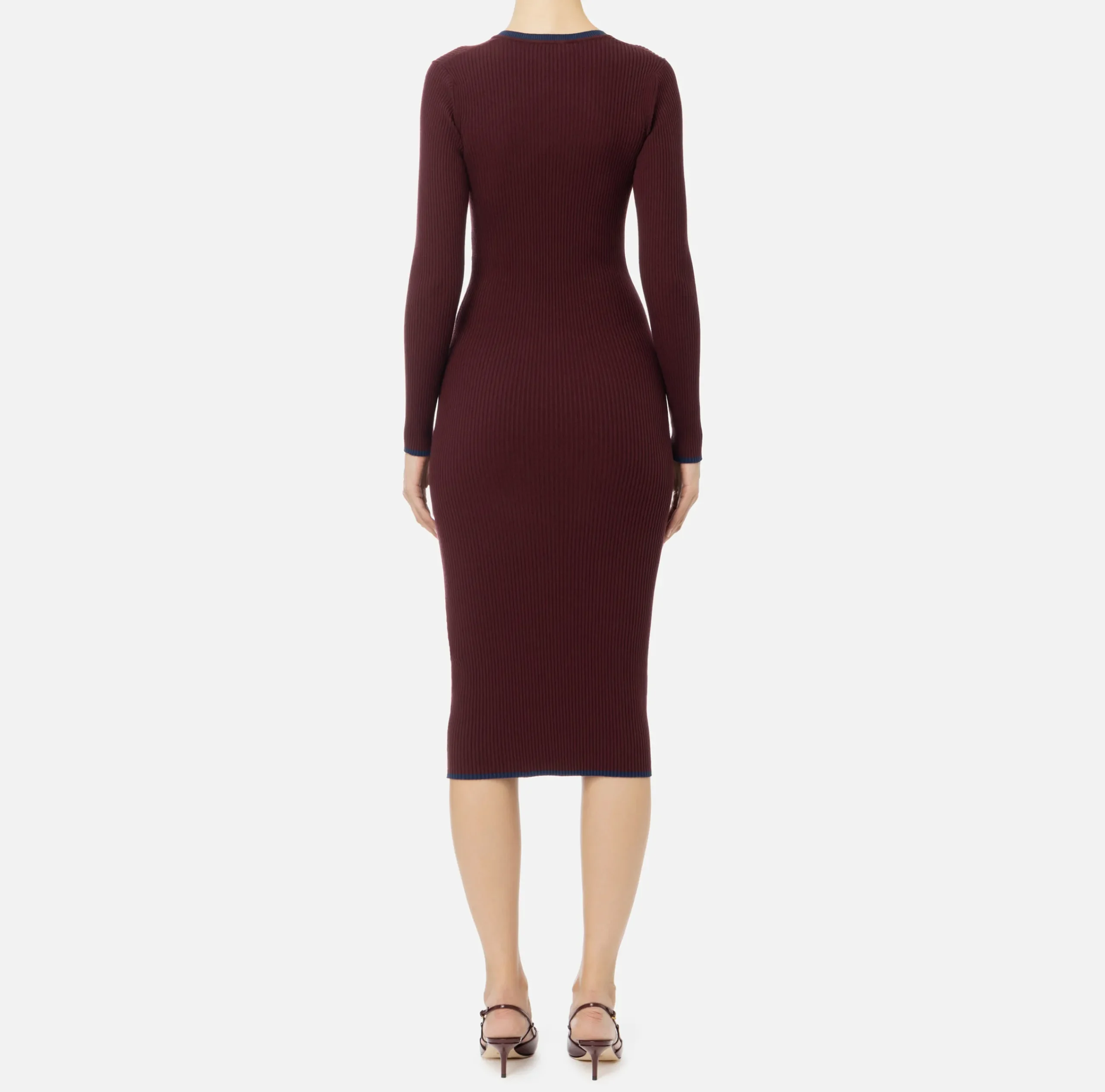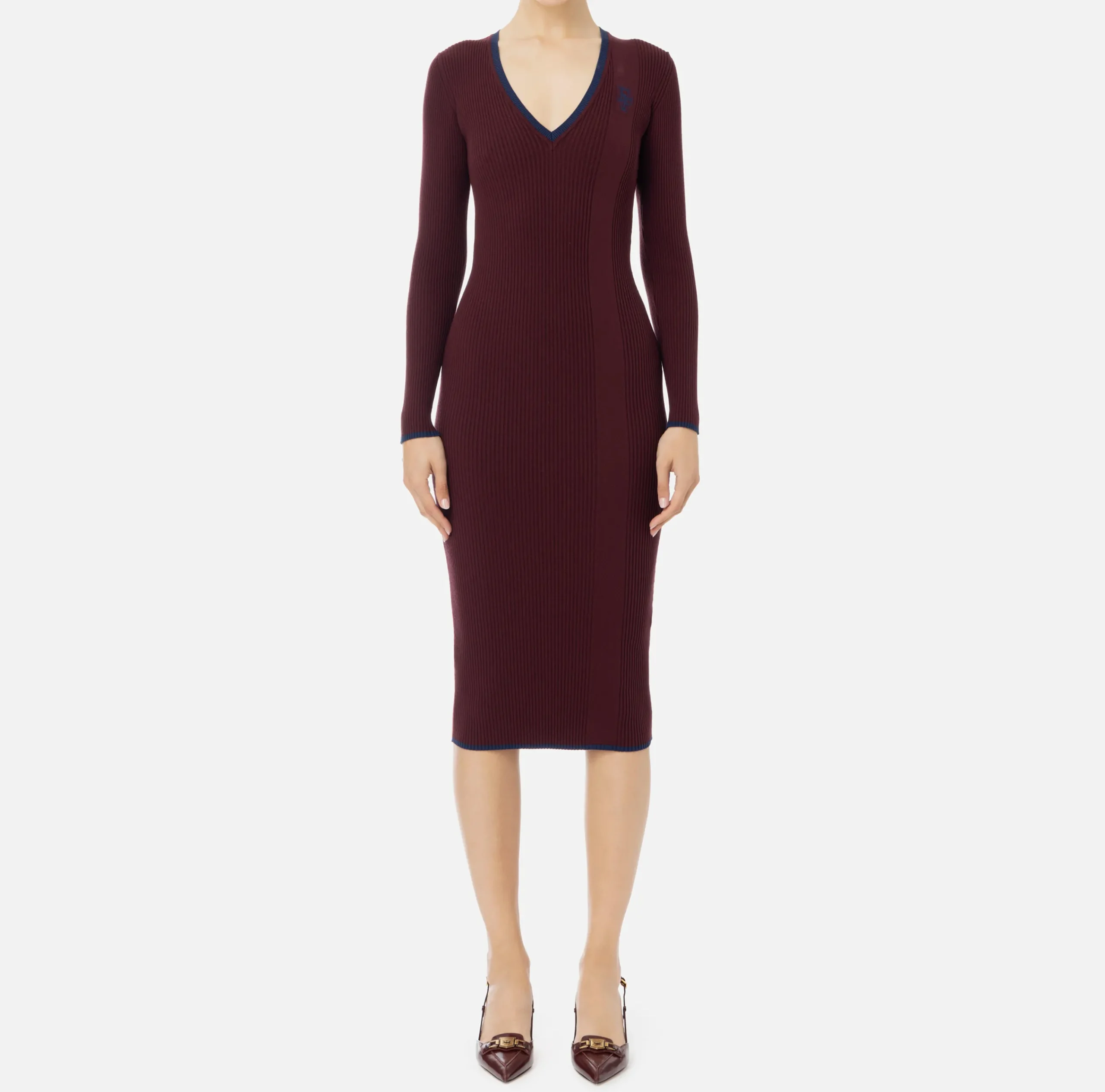 Abito midi in misto viscosa a costine a maniche lunghe con scollo a V. È caratterizzata da profili e logo intarsiato in contrasto colore.