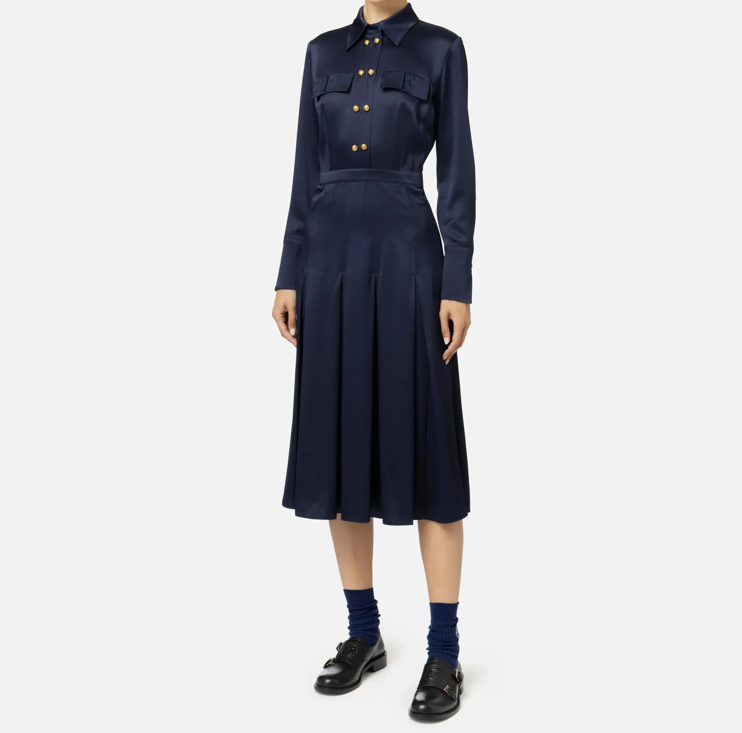 Abito chemisier in crêpe con maniche a 3/4 e gonna midi a pieghe larghe. È caratterizzato da motivo di tasche con patte ricamate in tono e doppio cannoncino decorato con bottoni in metallo dorato.