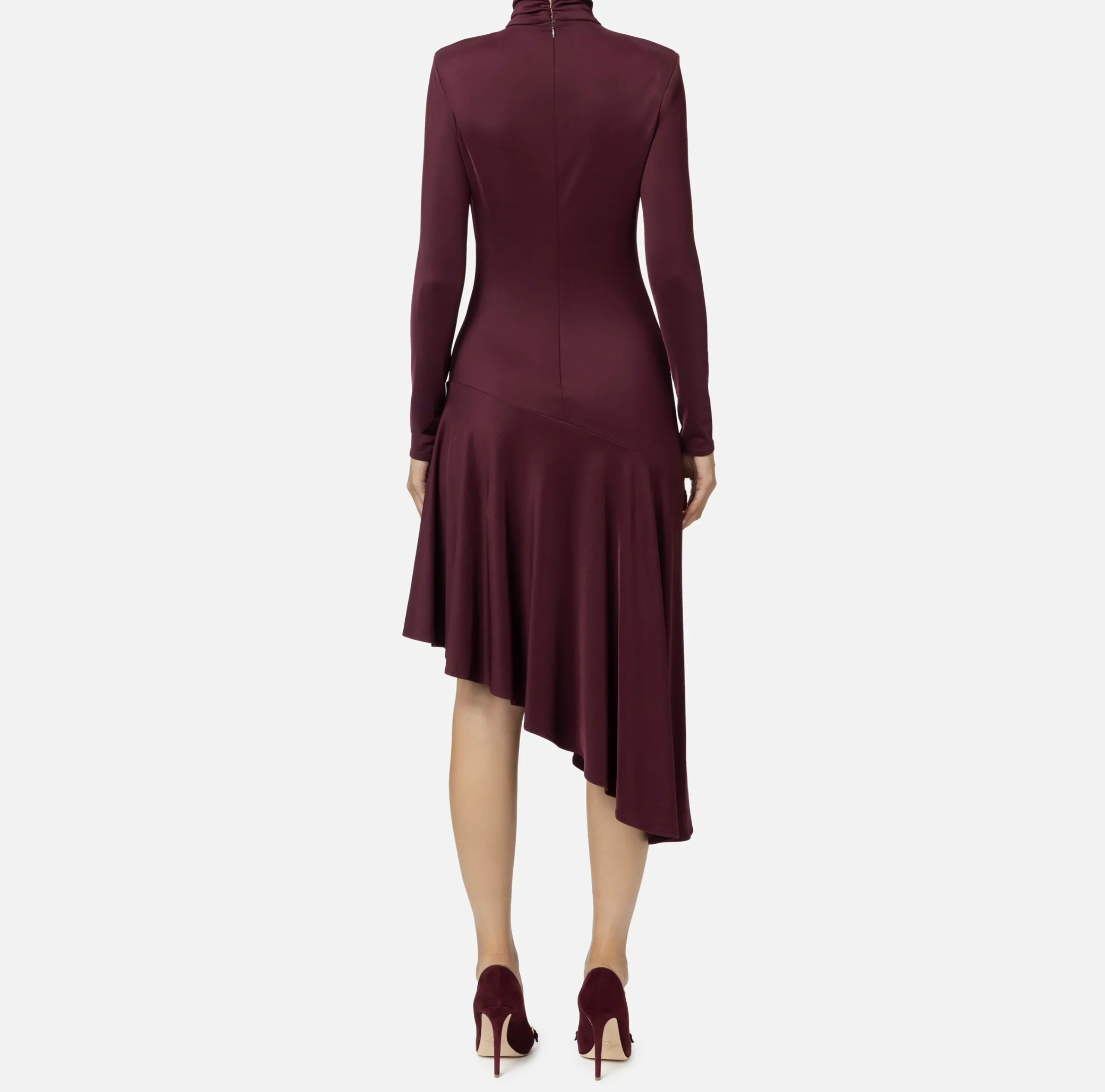 Abito midi in jersey fluido a maniche lunghe con profondo scollo a V e collo alto rifinito da un accessorio in metallo dorato e strass. È caratterizzato da gonna asimmetrica con balza che rende il fondo svasato.