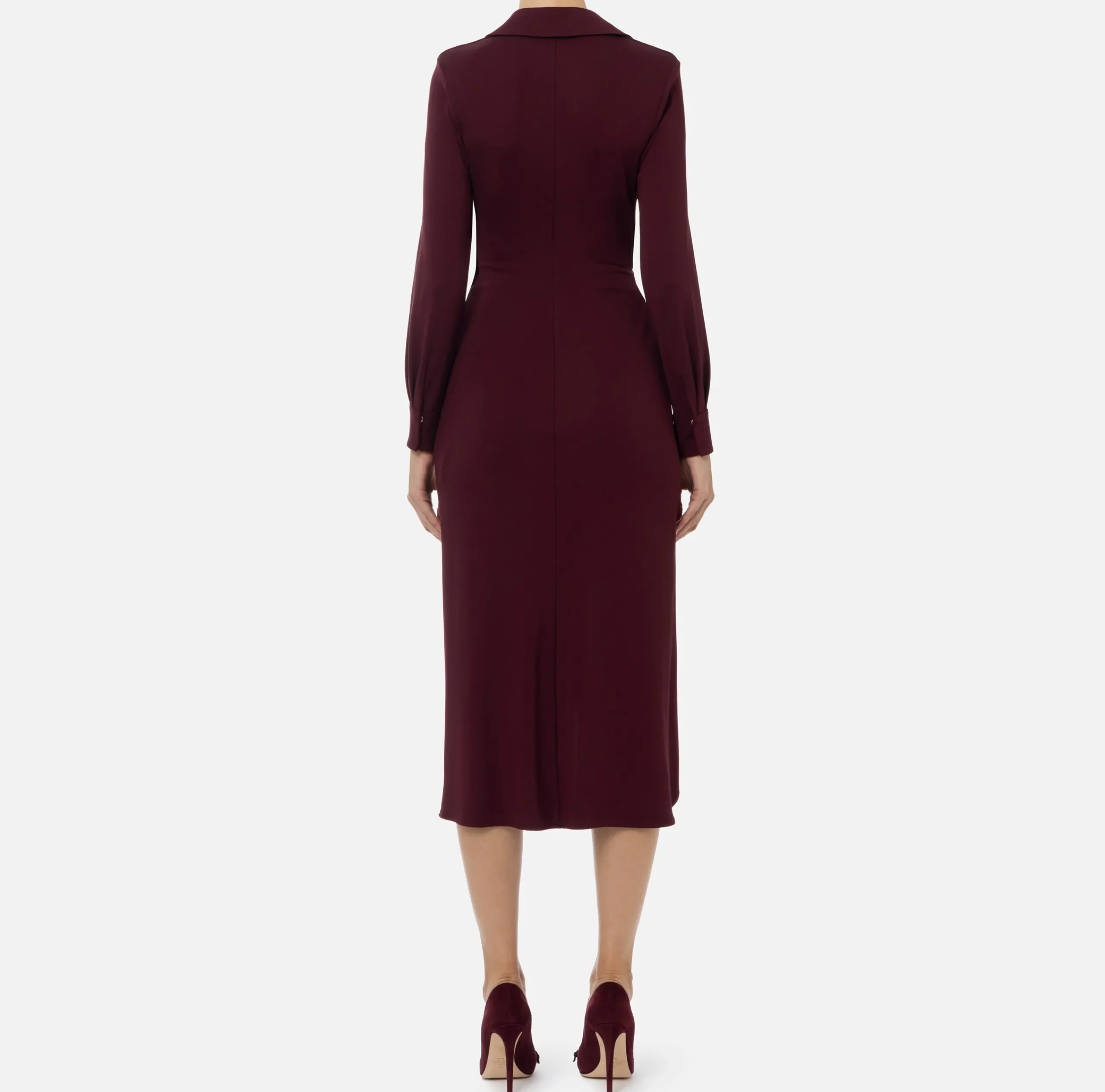Abito midi in jersey opaco con colletto a camicia e maniche lunghe con polsini. Il punto vita è enfatizzato da moschettone laterale che genera un drappeggio e asimmetria alla gonna.
