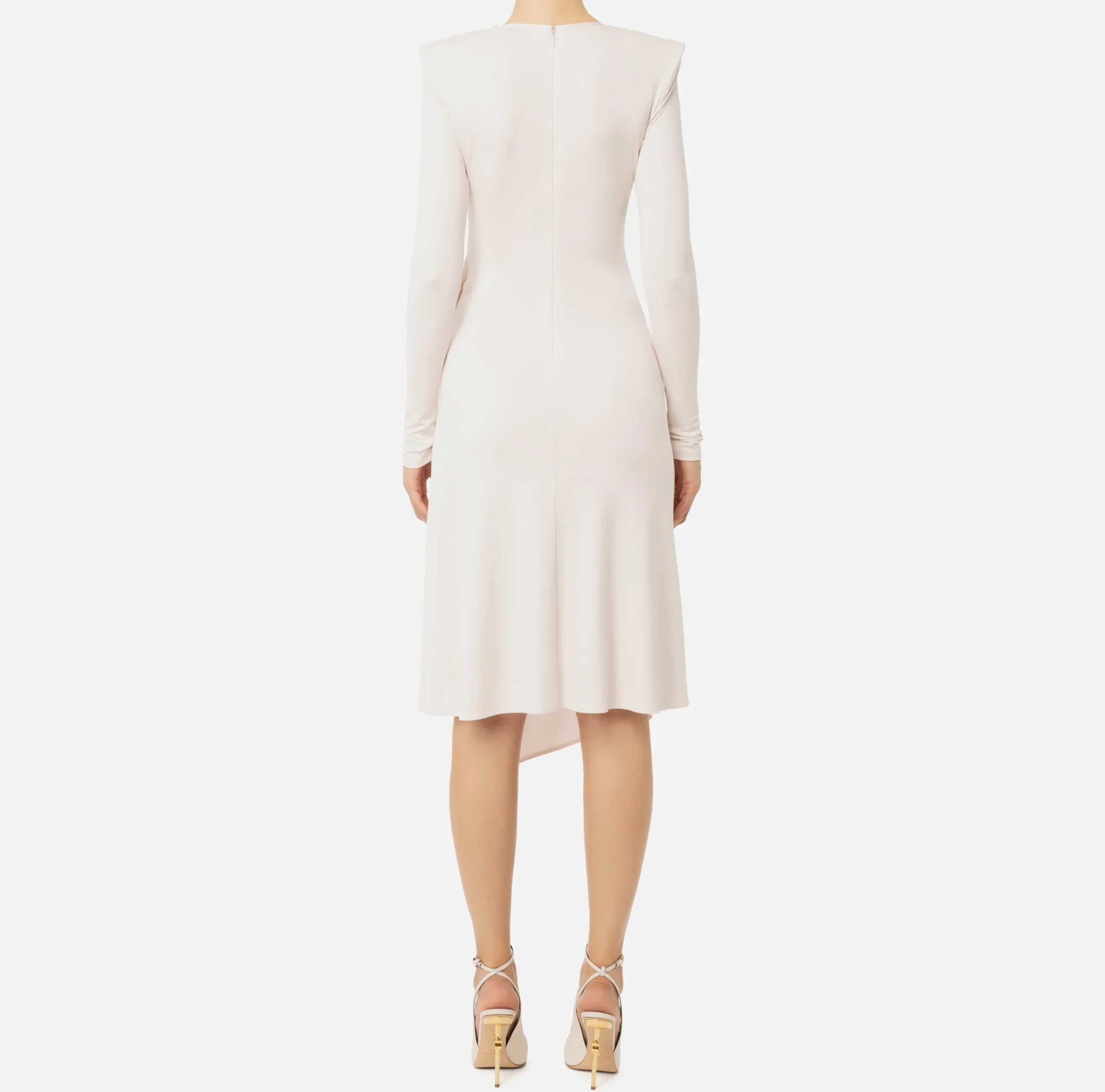 Abito midi in jersey opaco con maniche lunghe e scollo a V. Il punto vita è enfatizzato da drappeggio laterale che genera asimmetria alla gonna.