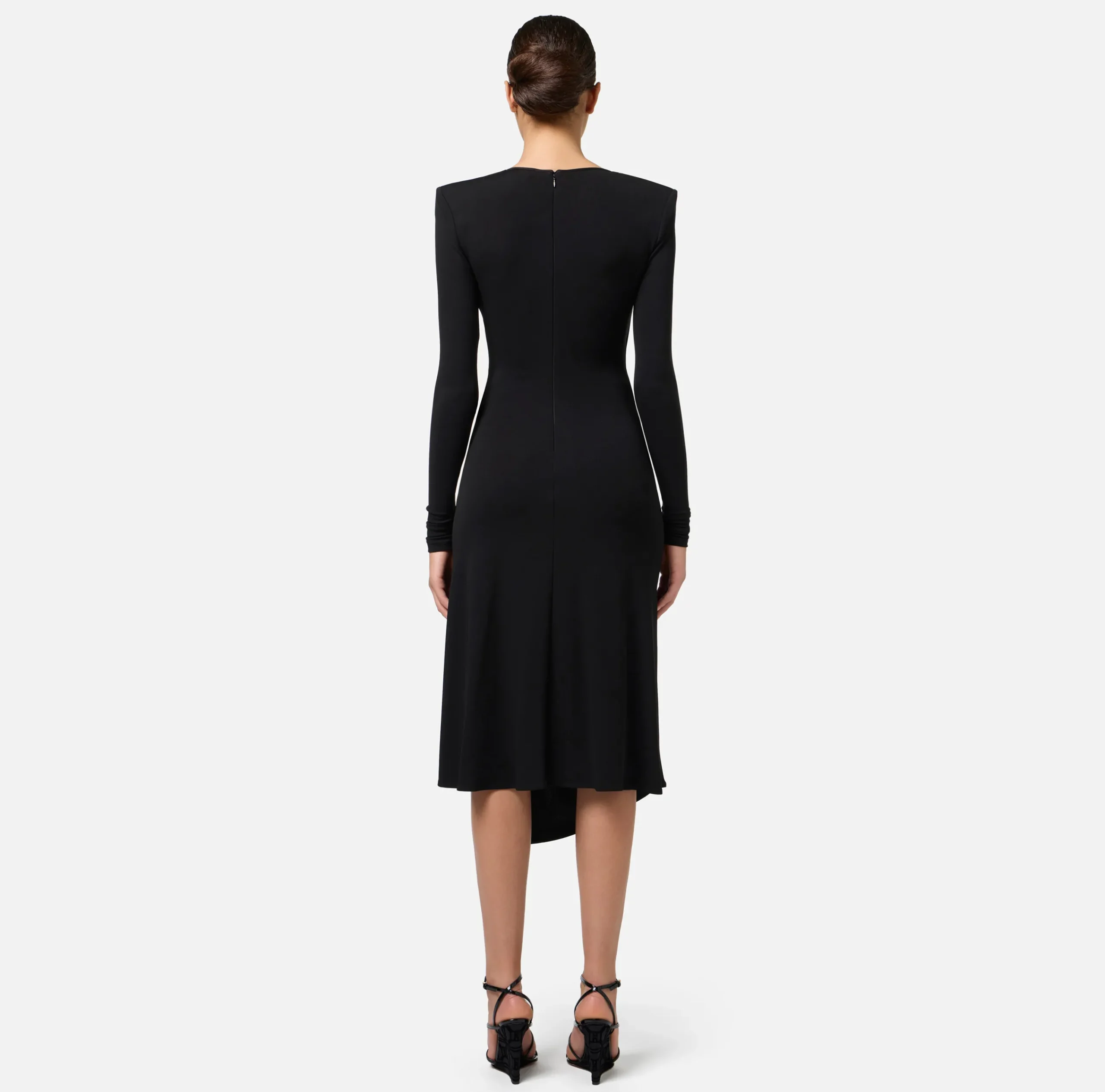 Abito midi in jersey opaco con maniche lunghe e scollo a V. Il punto vita è enfatizzato da drappeggio laterale che genera asimmetria alla gonna.