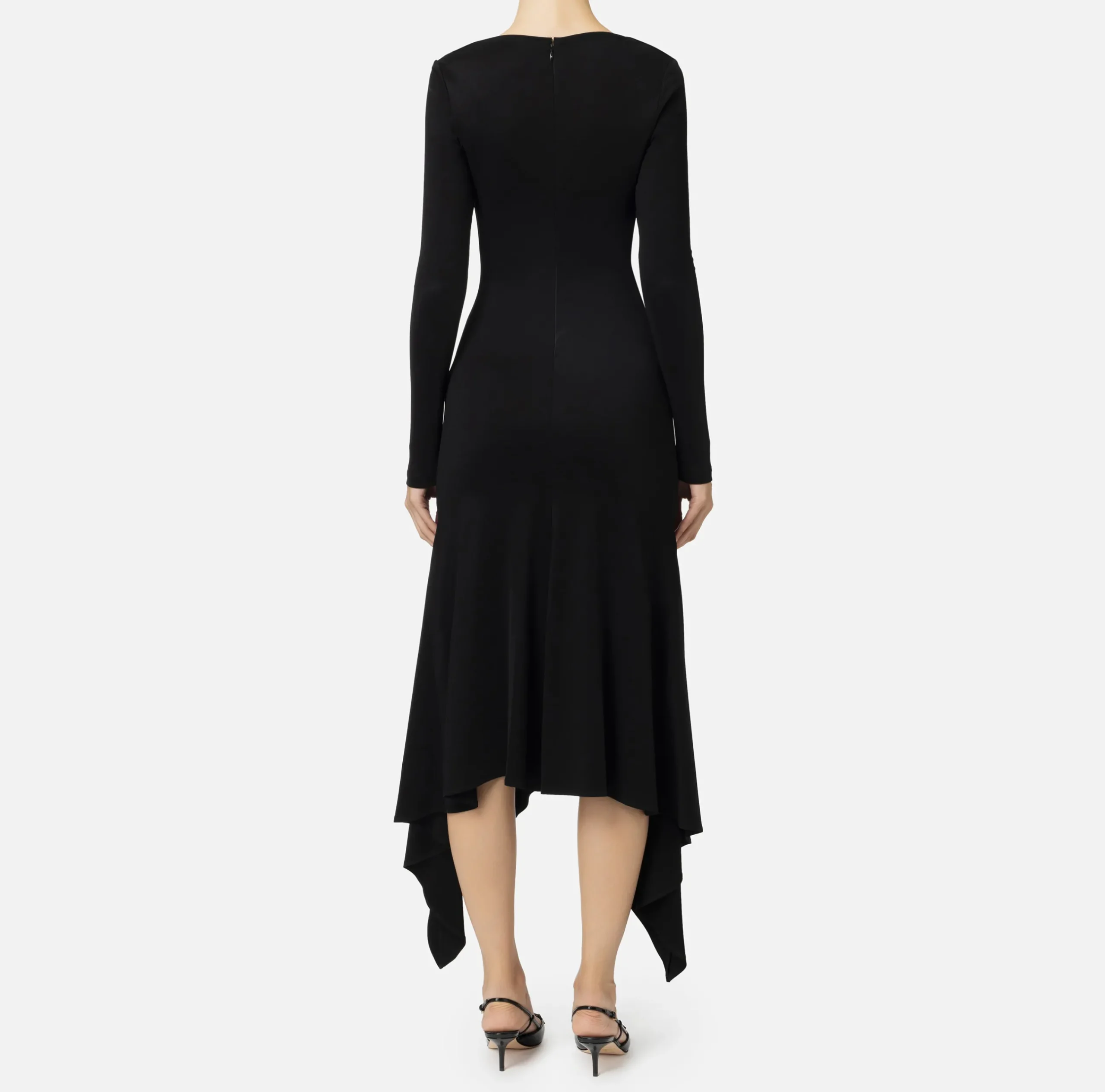 Abito midi in jersey fluido a maniche lunghe rifinite da placca logo in metallo dorato con scollo a giro drappeggiato. È caratterizzato da gonna asimmetrica con balza che rende il fondo svasato più lungo sui fianchi.