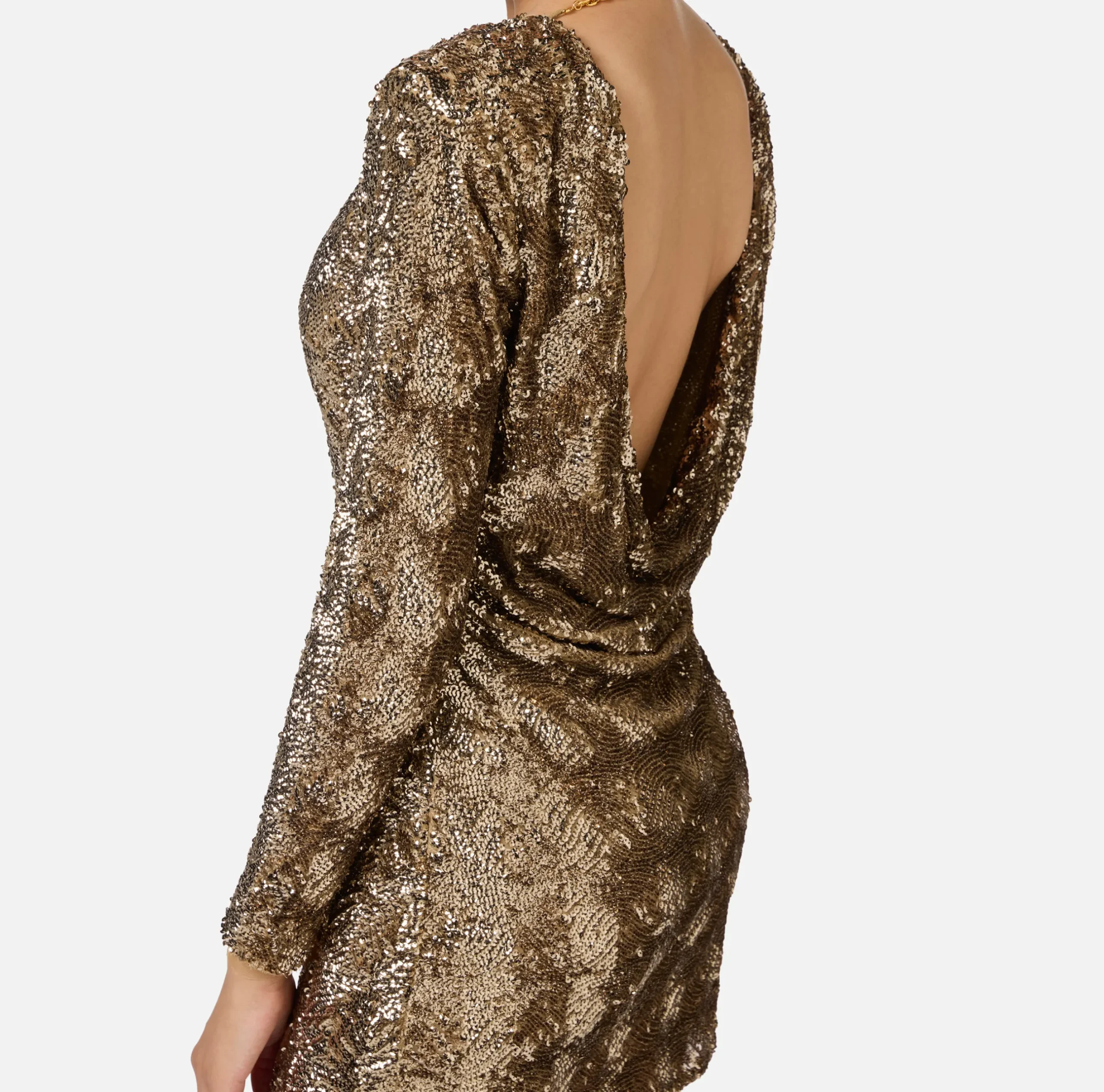 Miniabito boxy in tulle interamente ricamato a mano con paillettes cuvettes disegno chevron. È caratterizzato da scollo a goccia sulla schiena, maniche lunghe e spalle strutturate.