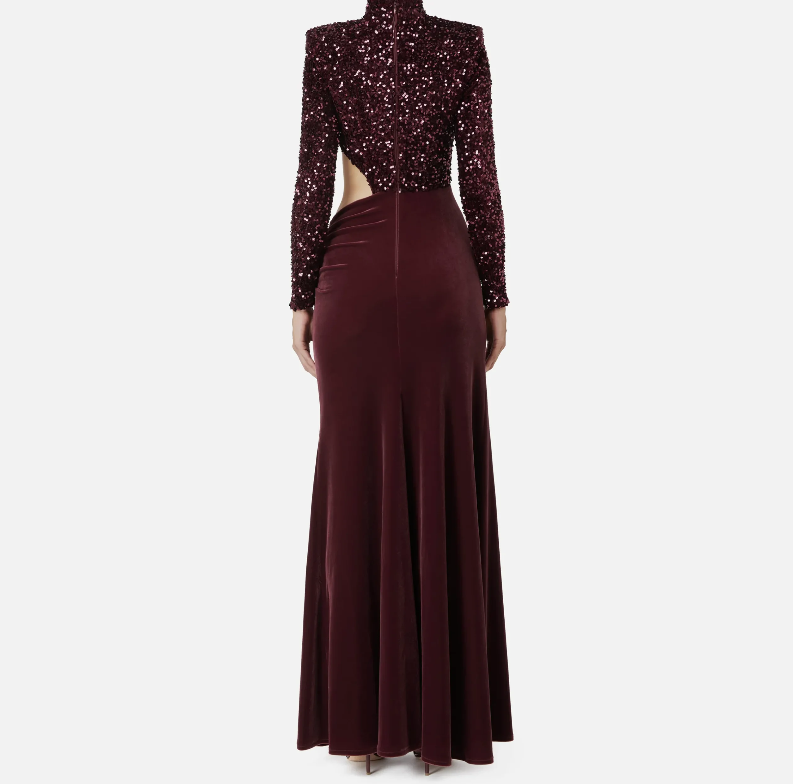Abito red carpet in ciniglia ricamata con pailettes e gonna a sirena in velluto fluido. È caratterizzato da cut-out in vita rifinito da una zip in metallo dorato con tiretto logato.