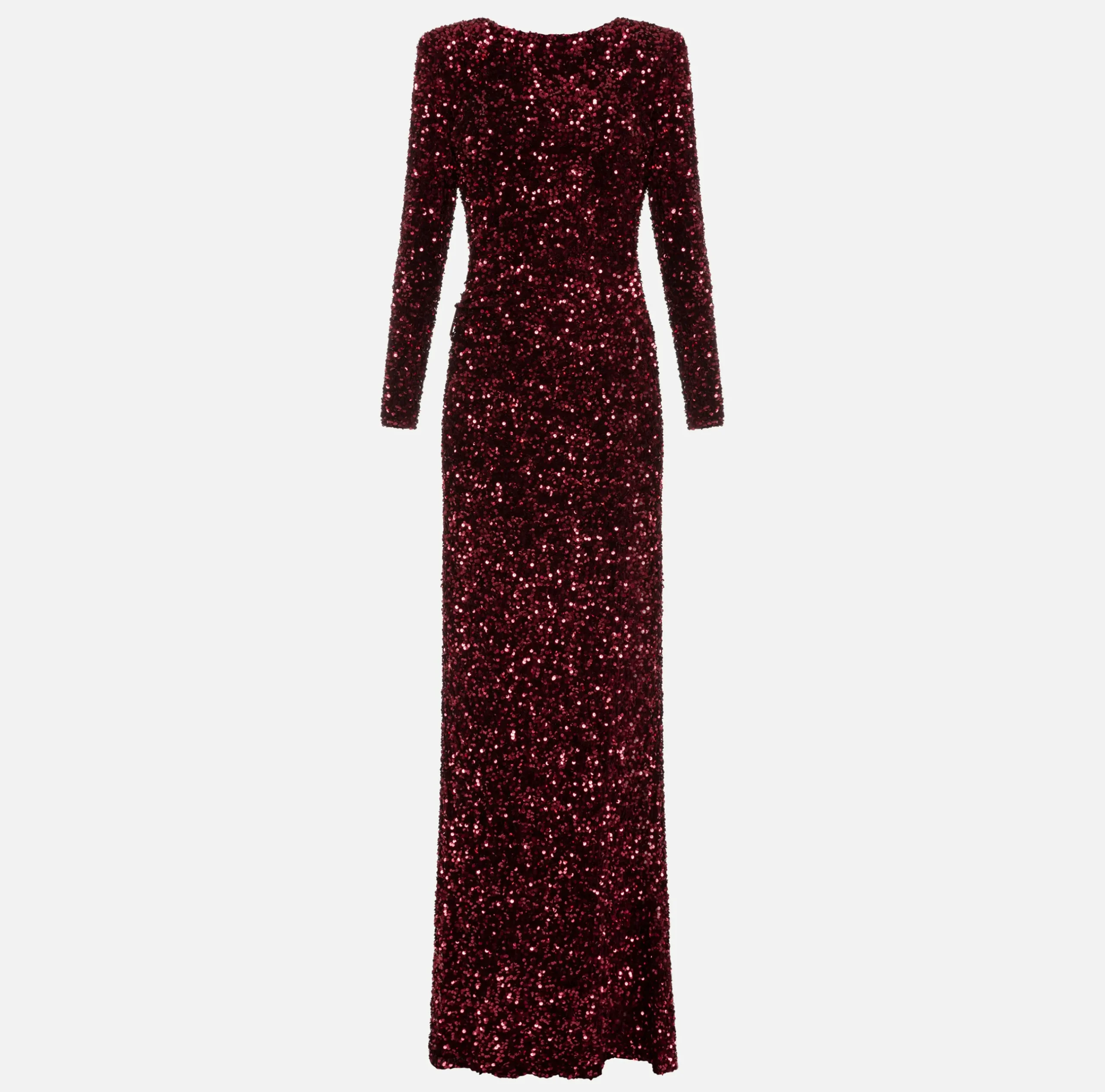 Abito red carpet in ciniglia ricamata con pailettes a maniche lunghe. È caratterizzato da scollatura asimmetrica sulla schiena, trattenuta da fibbia logo in metallo dorato e strass, e profondo spacco.