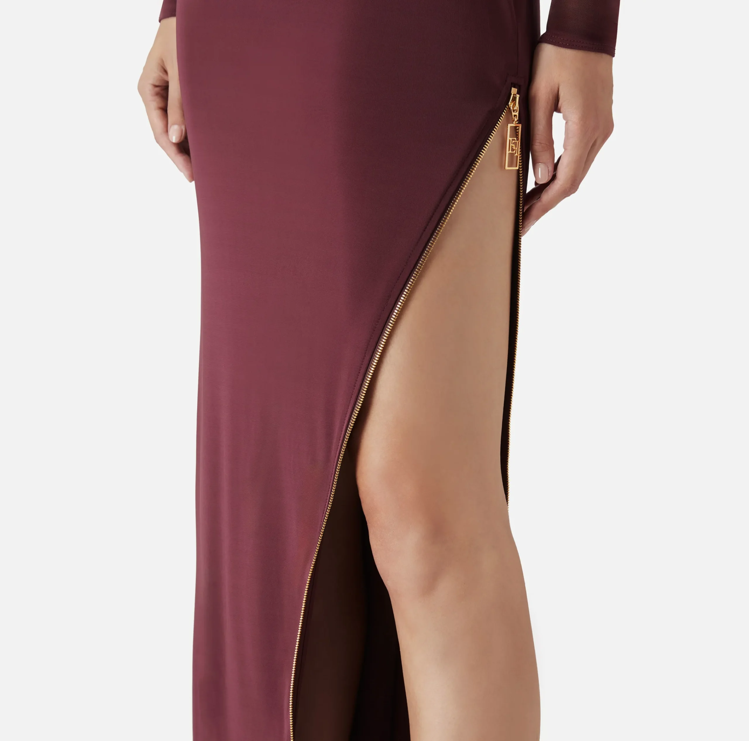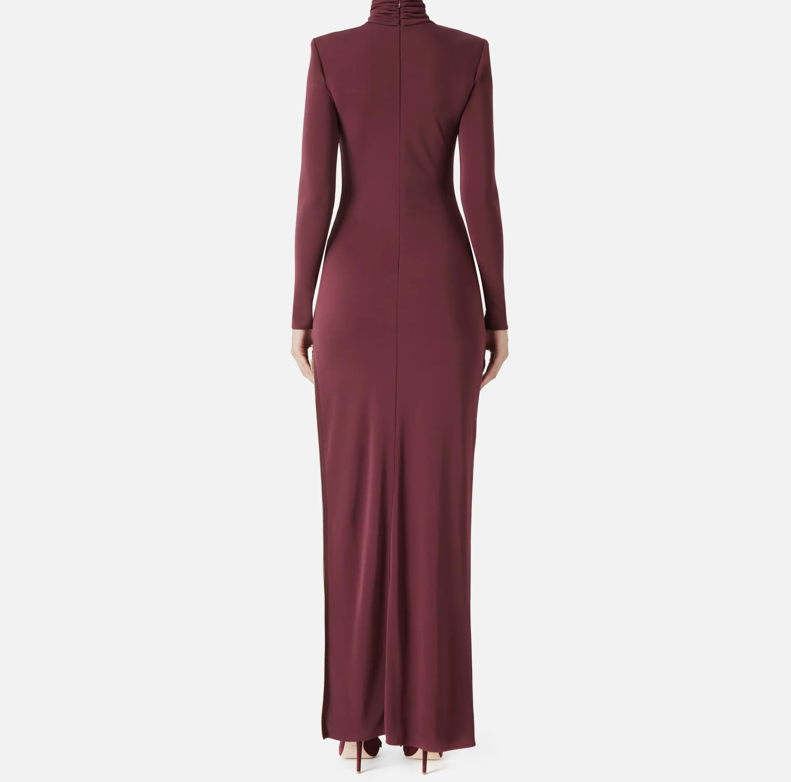 Abito red carpet in jersey crêpe con collo alto e maniche lunghe a guanto. È caratterizzato da profondo spacco laterale rifinito da zip in metallo dorato con tiretto logo.