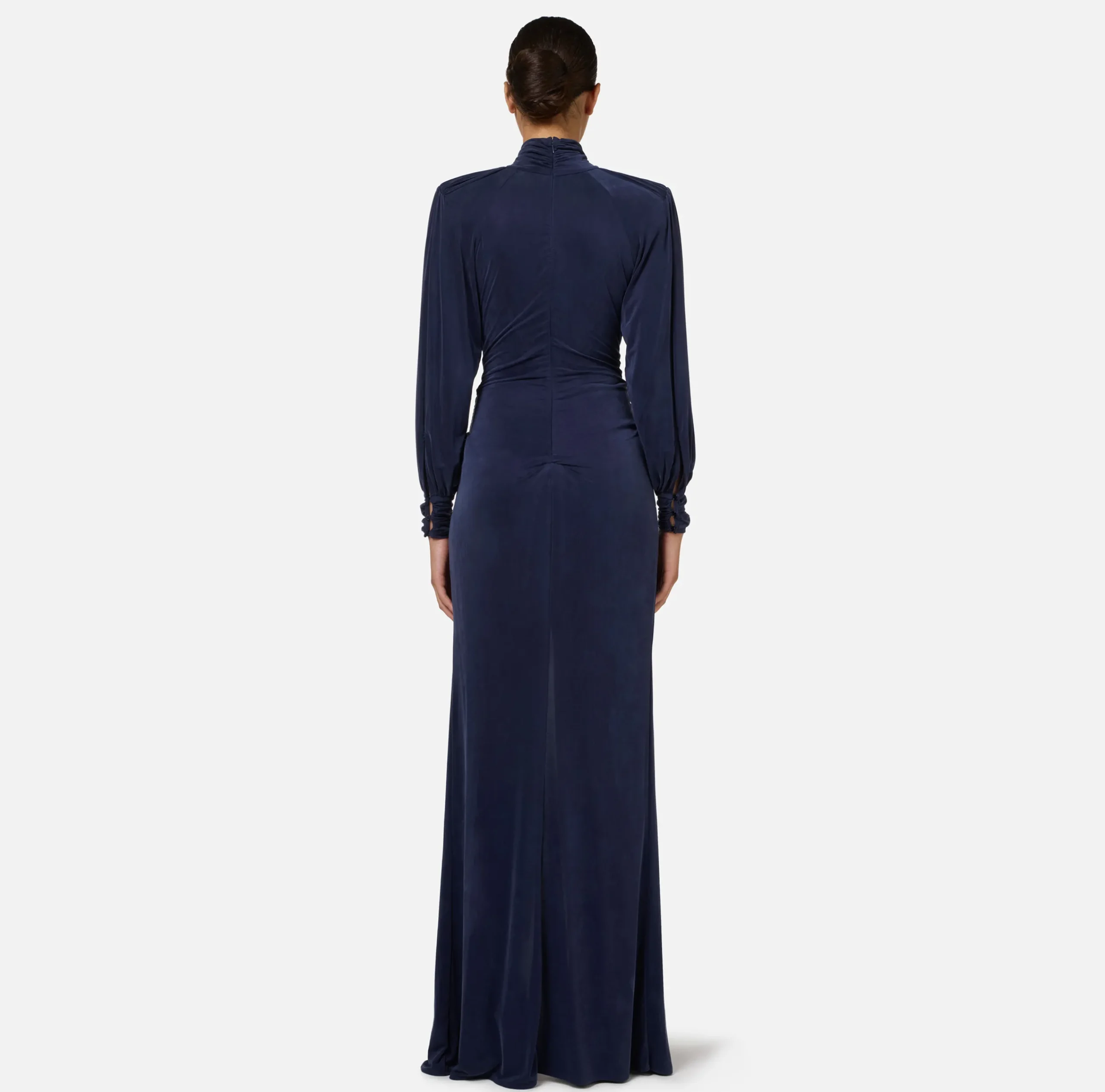 Abito red carpet in jersey cupro con collo alto e maniche lunghe ampie al fondo e arricciate sulle spalle. È caratterizzato da profonda scollatura trattenuta da un nodo drappeggiato e gonna con spacco nel centro davanti.