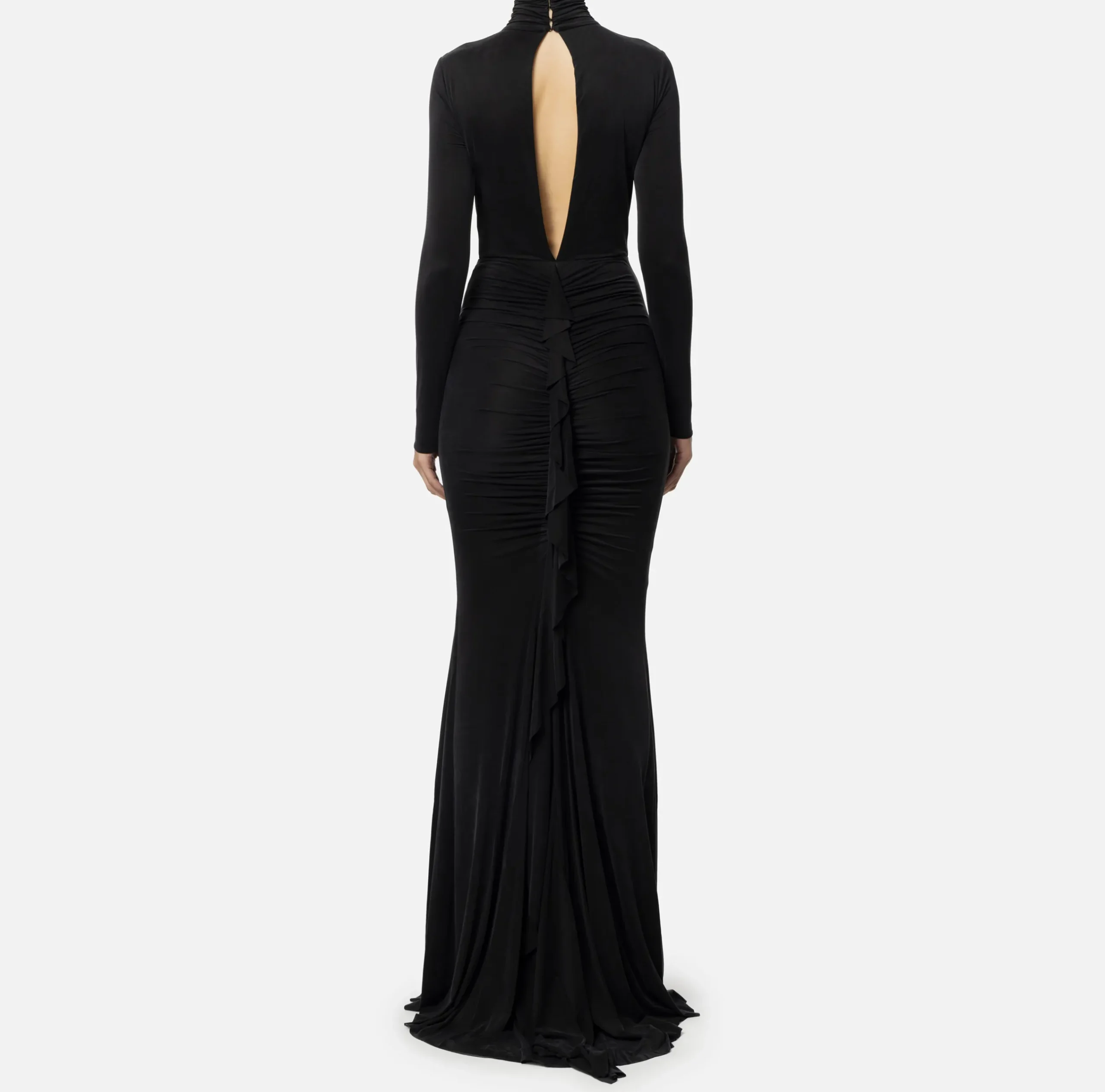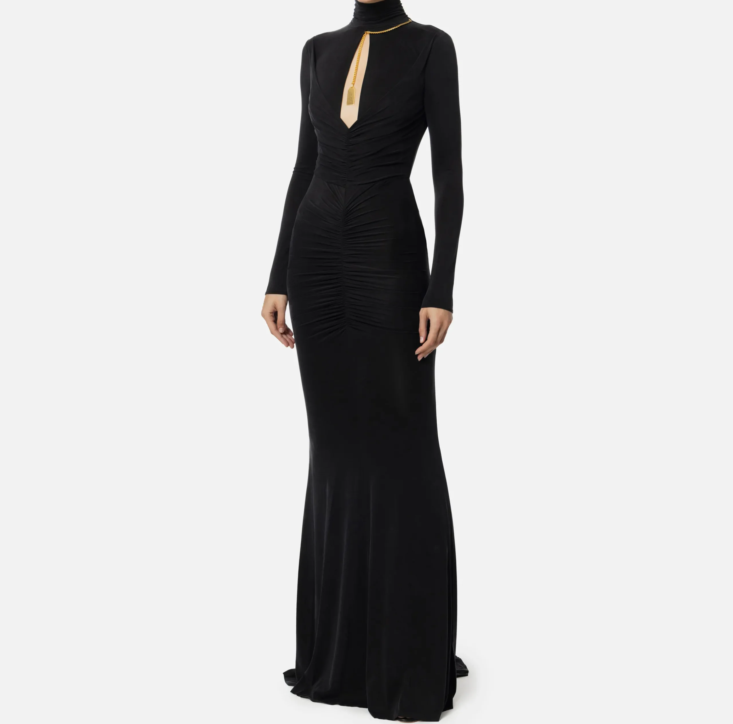 Abito red carpet in jersey cupro con maniche lunghe e gonna a sirena drappeggiata. È caratterizzato da top con collo alto impreziosito da un accessorio collana in metallo dorato e scollo a goccia che lascia la schiena nuda.