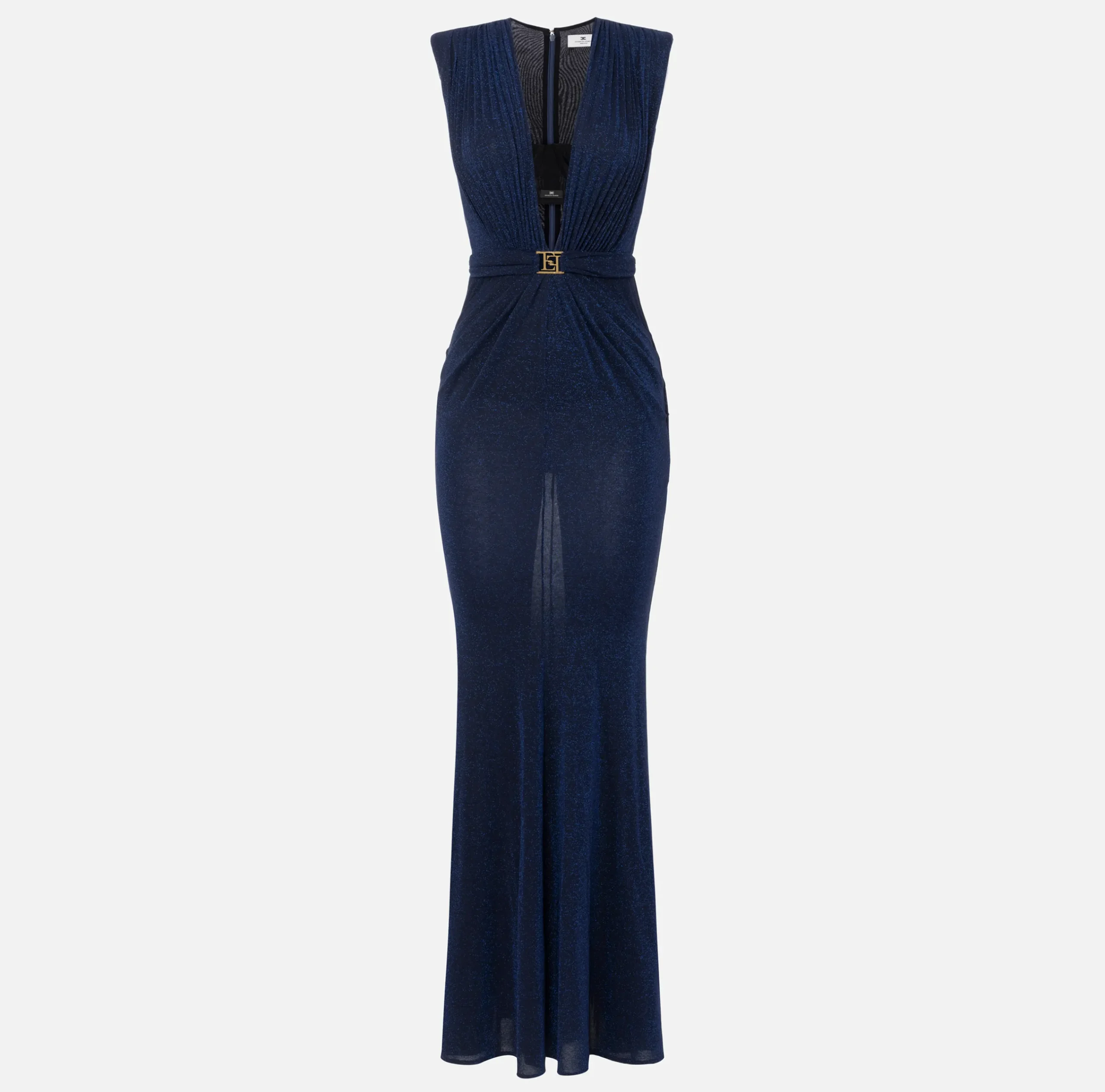 Abito red carpet in jersey lurex smanicato con profonda scollatura che lascia intravedere un reggiseno in tulle. Il punto vita è enfatizzato da un fascione personalizzato da placca logo in metallo dorato e da un drappeggio che abbraccia i fianchi e sovrasta la gonna a sirena.