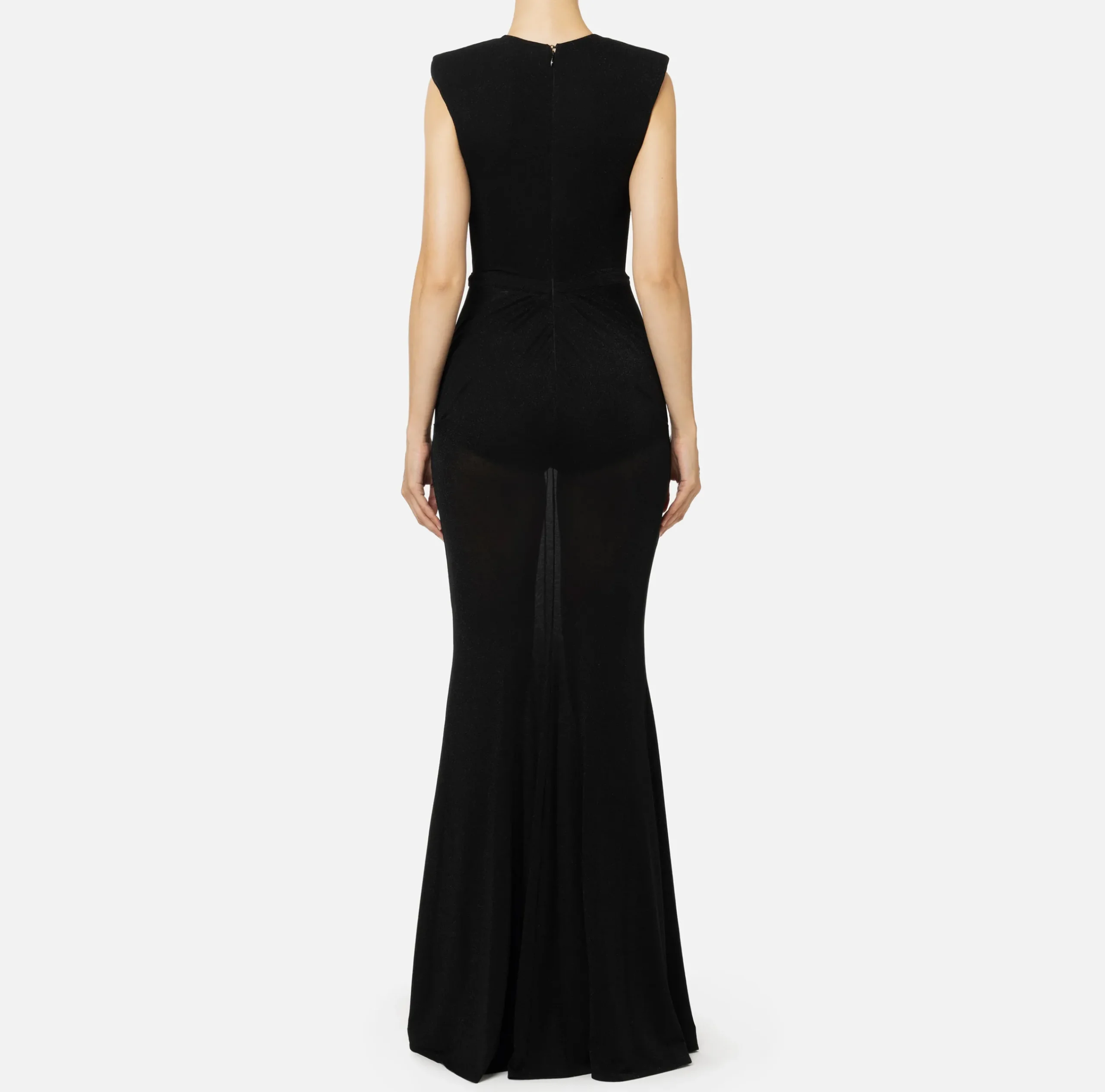 Abito red carpet in jersey lurex smanicato con profonda scollatura che lascia intravedere un reggiseno in tulle. Il punto vita è enfatizzato da un fascione personalizzato da placca logo in metallo dorato e da un drappeggio che abbraccia i fianchi e sovrasta la gonna a sirena.