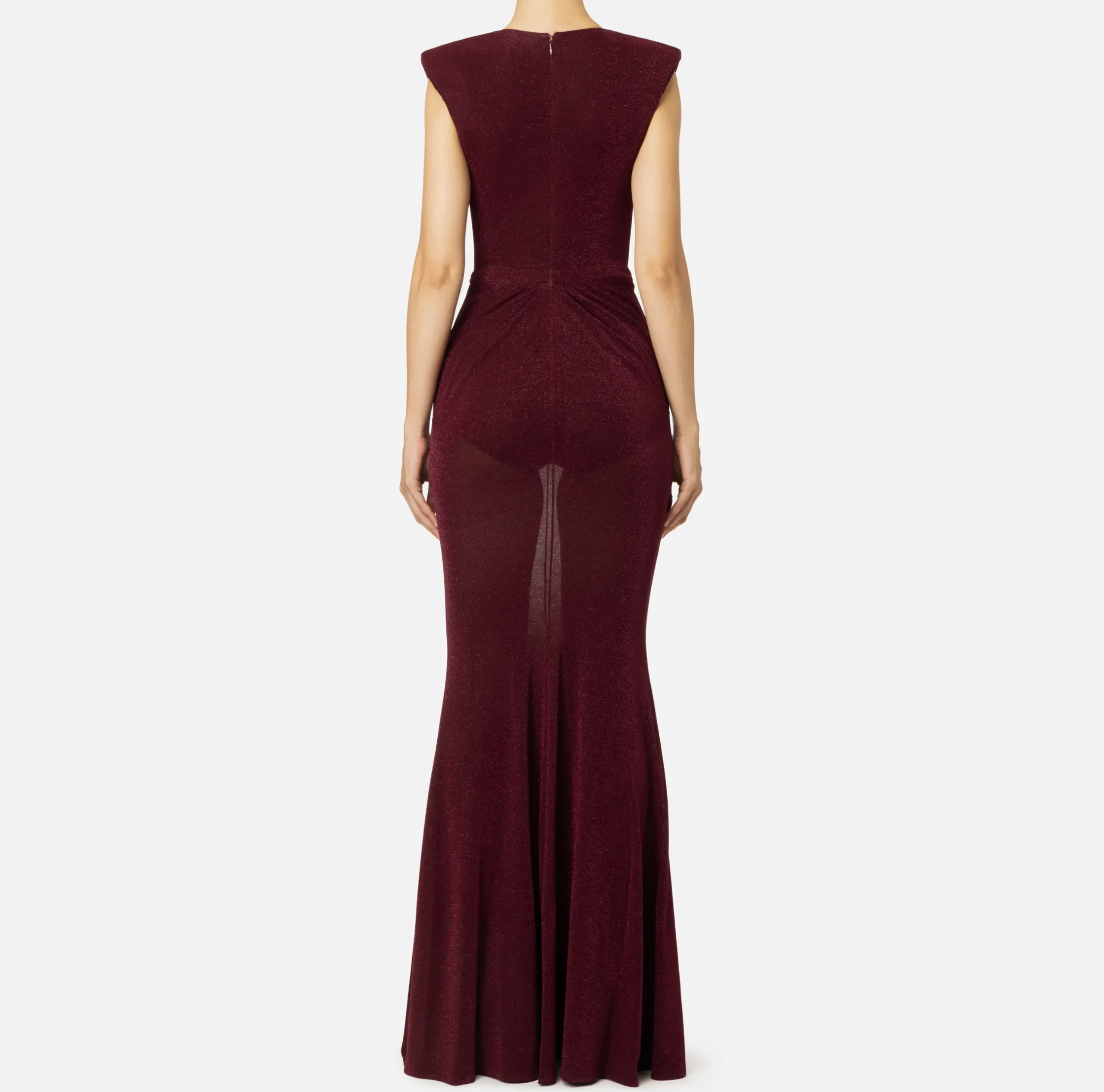 Abito red carpet in jersey lurex smanicato con profonda scollatura che lascia intravedere un reggiseno in tulle. Il punto vita è enfatizzato da un fascione personalizzato da placca logo in metallo dorato e da un drappeggio che abbraccia i fianchi e sovrasta la gonna a sirena.