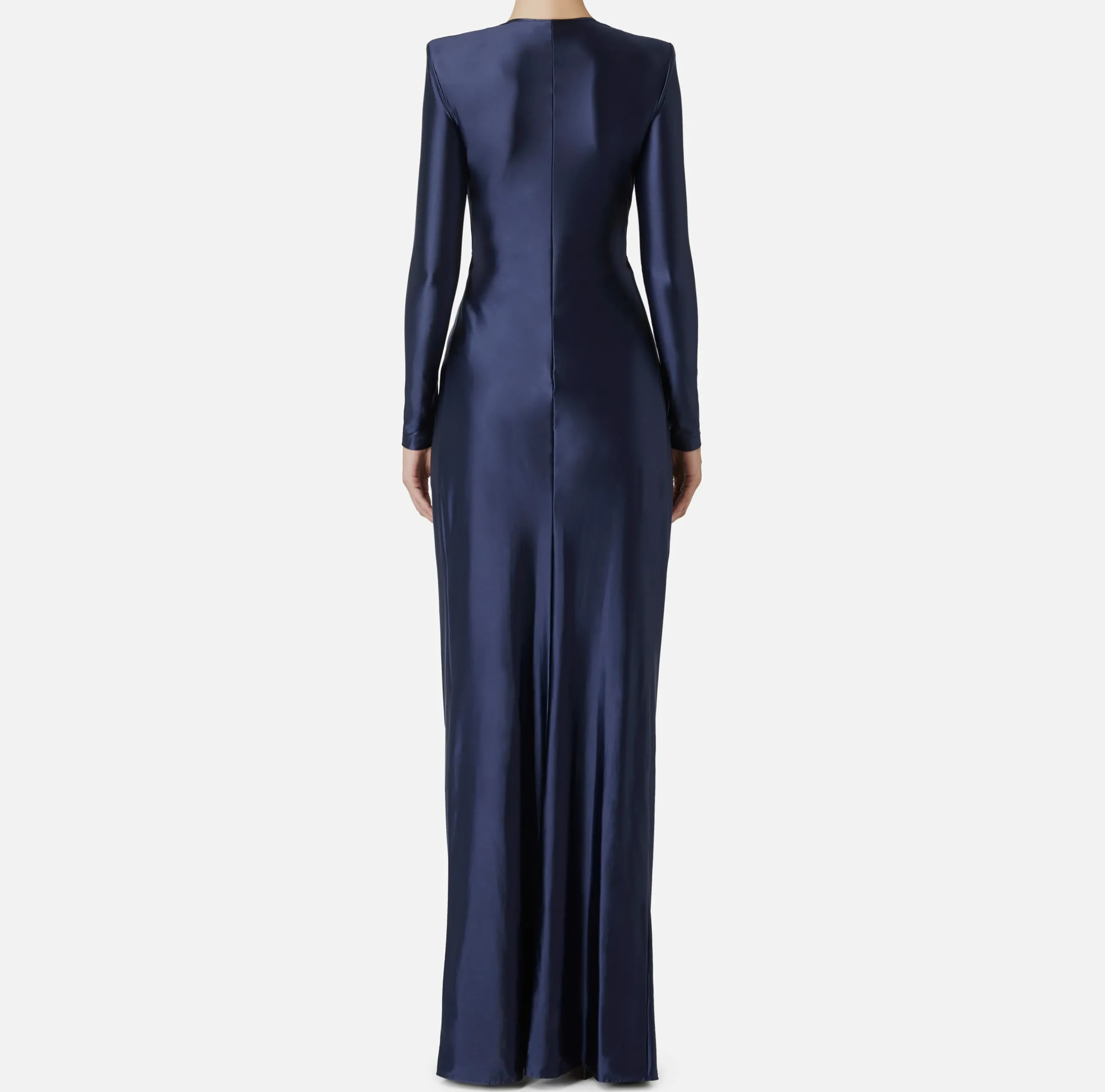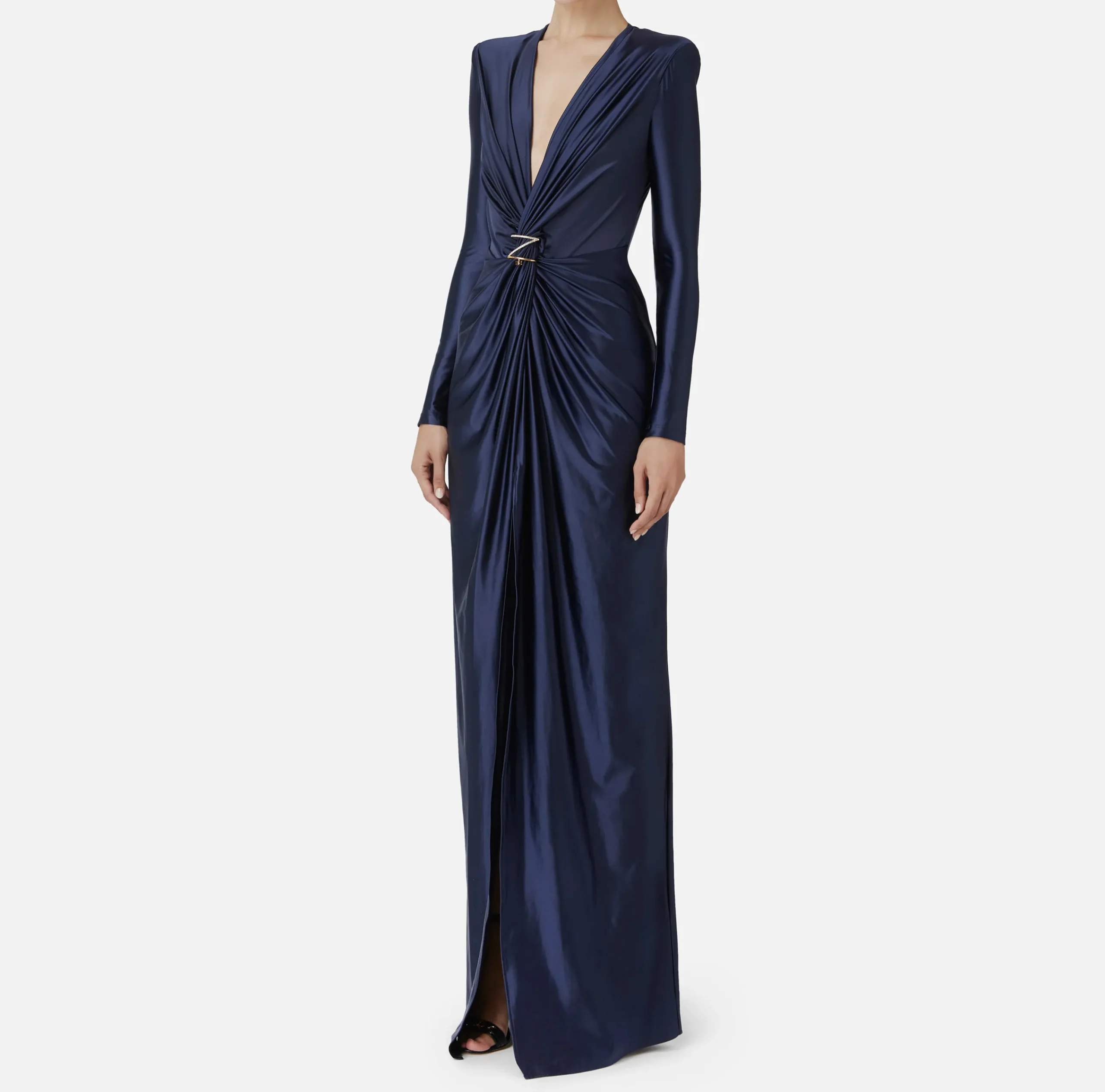 Abito red carpet in lycra lucida a maniche lunghe con gonna con spacco nel centro davanti. È caratterizzato da profonda scollatura trattenuta da un nodo drappeggiato e da un accessorio logo in metallo dorato e strass.
