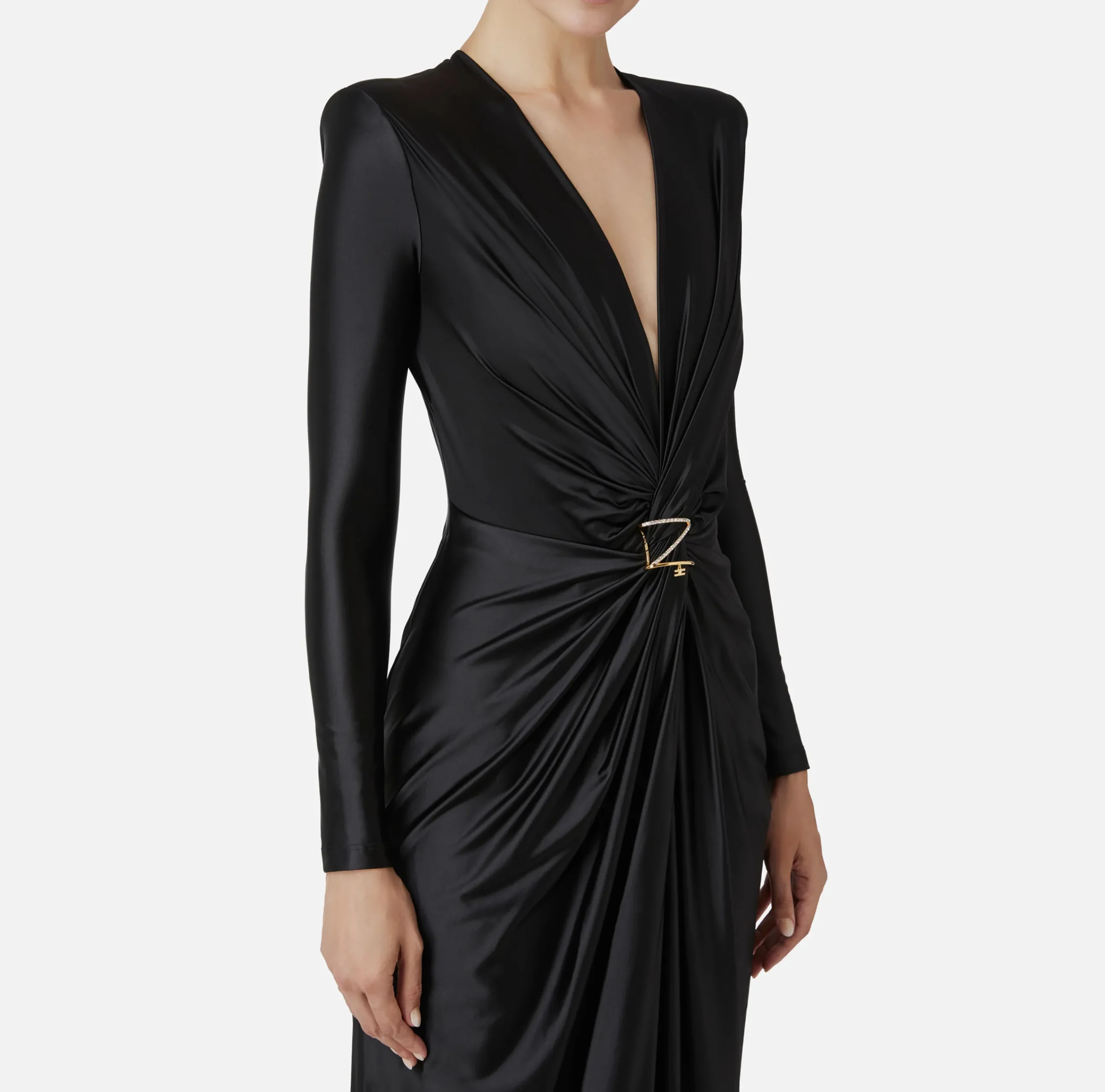 Abito red carpet in lycra lucida a maniche lunghe con gonna con spacco nel centro davanti. È caratterizzato da profonda scollatura trattenuta da un nodo drappeggiato e da un accessorio logo in metallo dorato e strass.