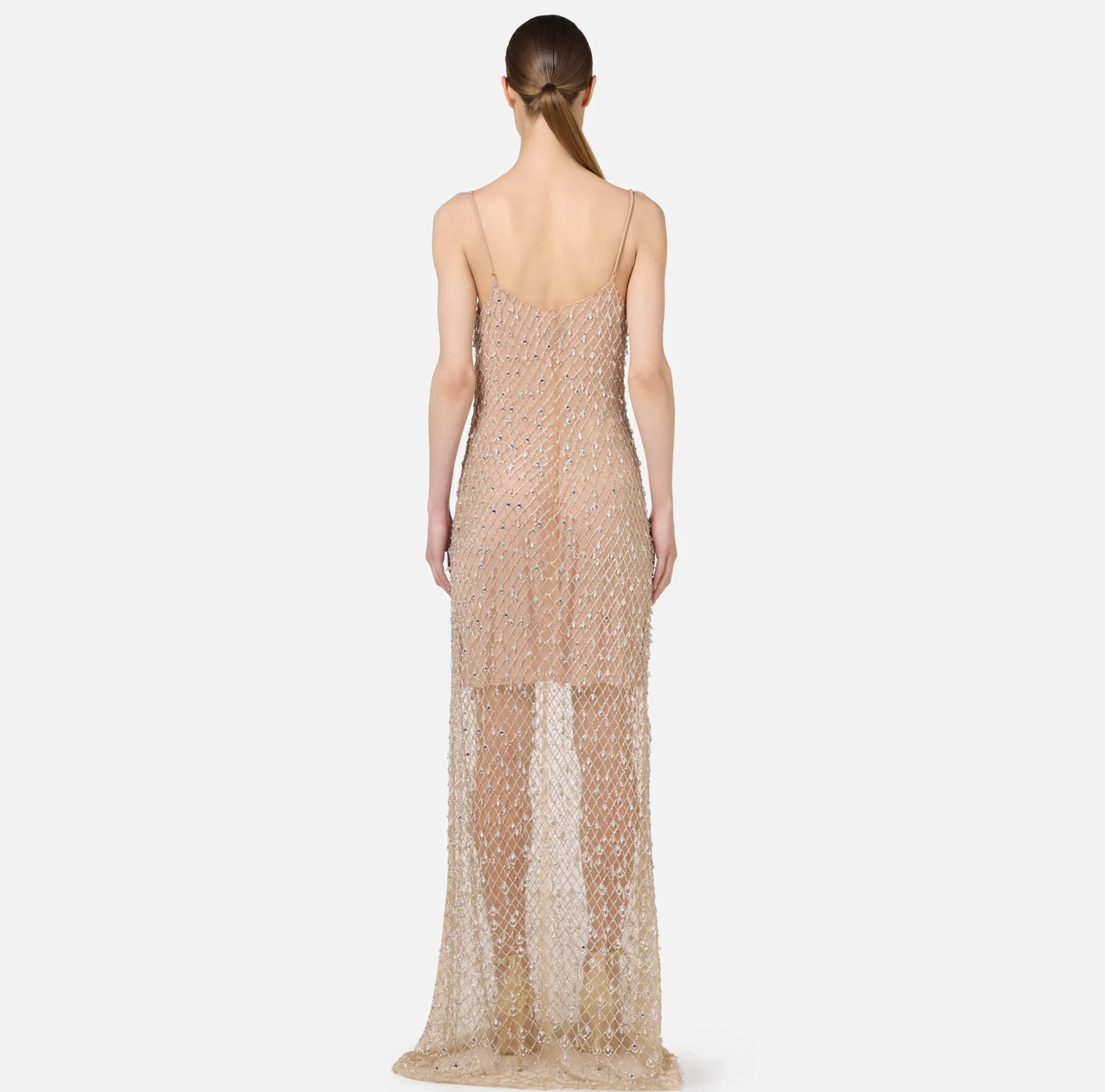 Abito red carpet in tulle interamente ricamato a mano con canottiglie e strass disegno losanga che crea un’alternanza di pieno e vuoto. È caratterizzato da spalline sottili e fodera lunghezza coscia che lascia scoperte le gambe.