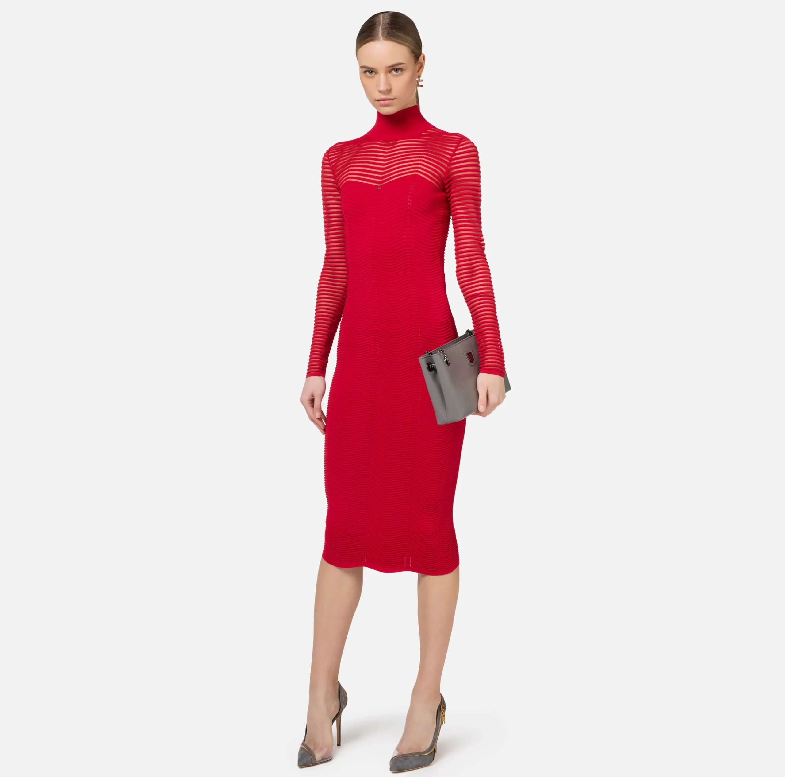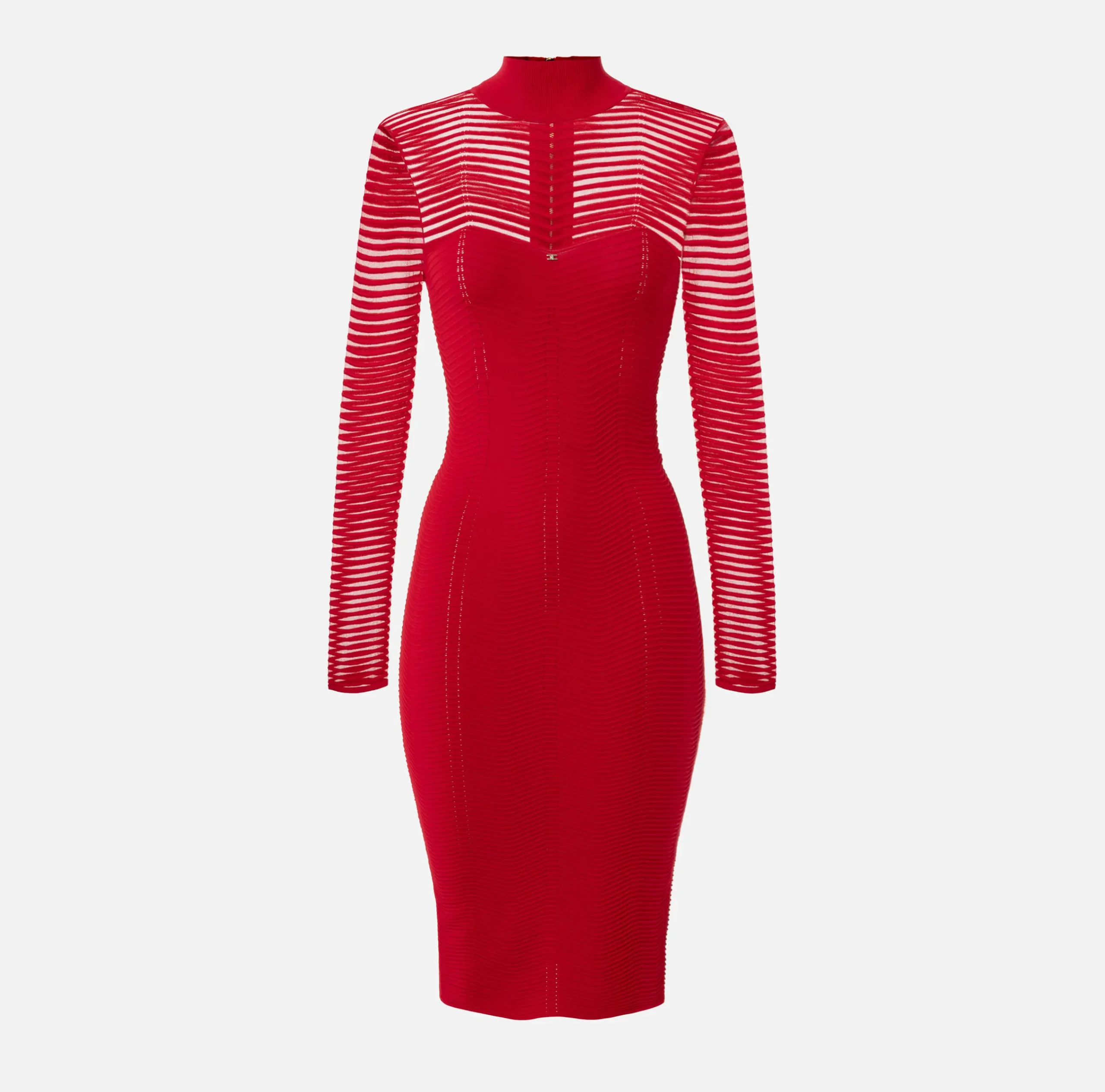Abito midi in viscosa motivo chevron tridimensionale alternato a un punto rete. È caratterizzato da maniche lunghe trasparenti e collo alto a costine.