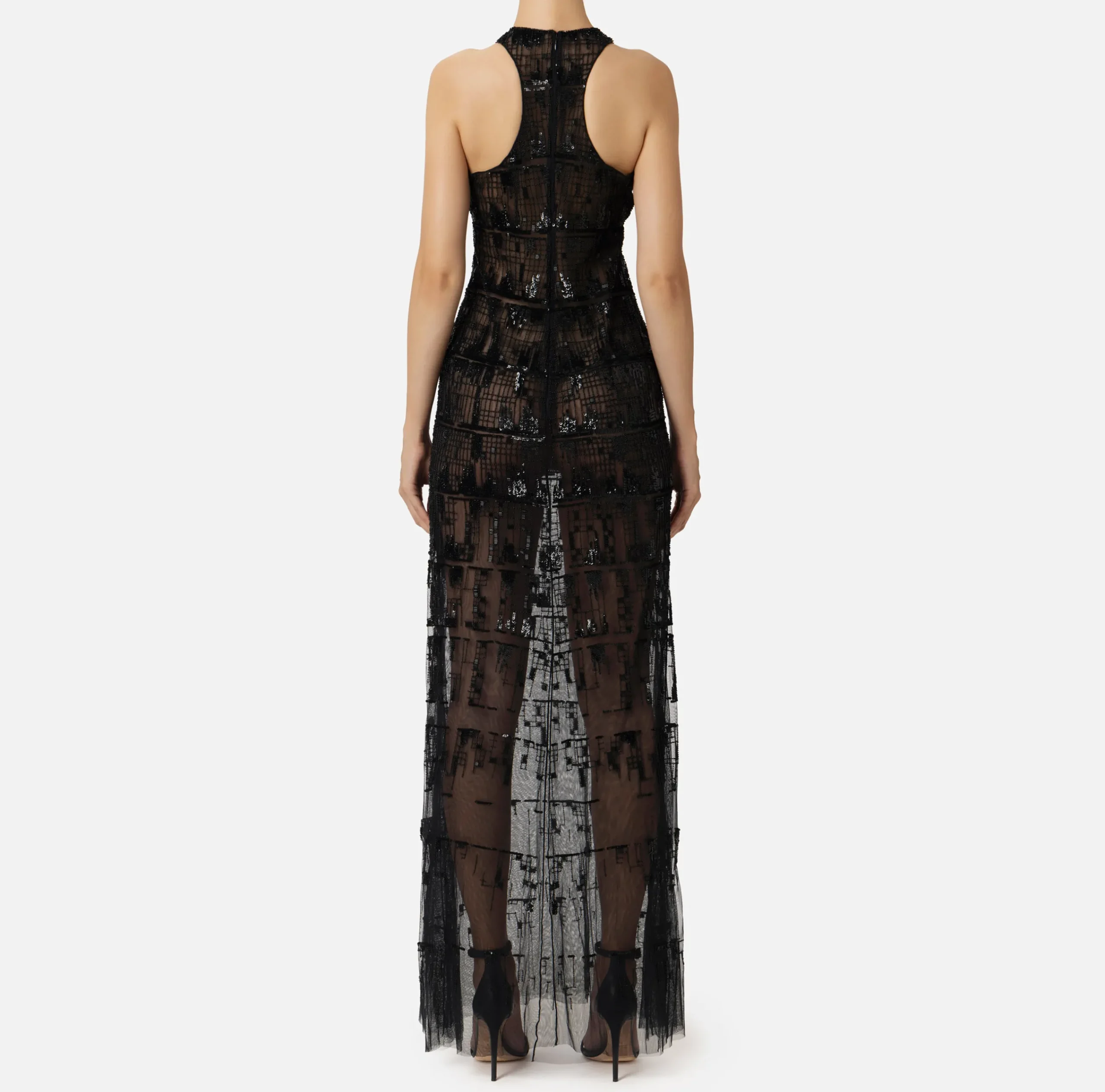 Abito red carpet in tulle interamente ricamato a mano con paillettes cuvettes e canottiglie orizzontali disegno effetto pixel. È caratterizzato da scollo all’americana e gonna svasata.
