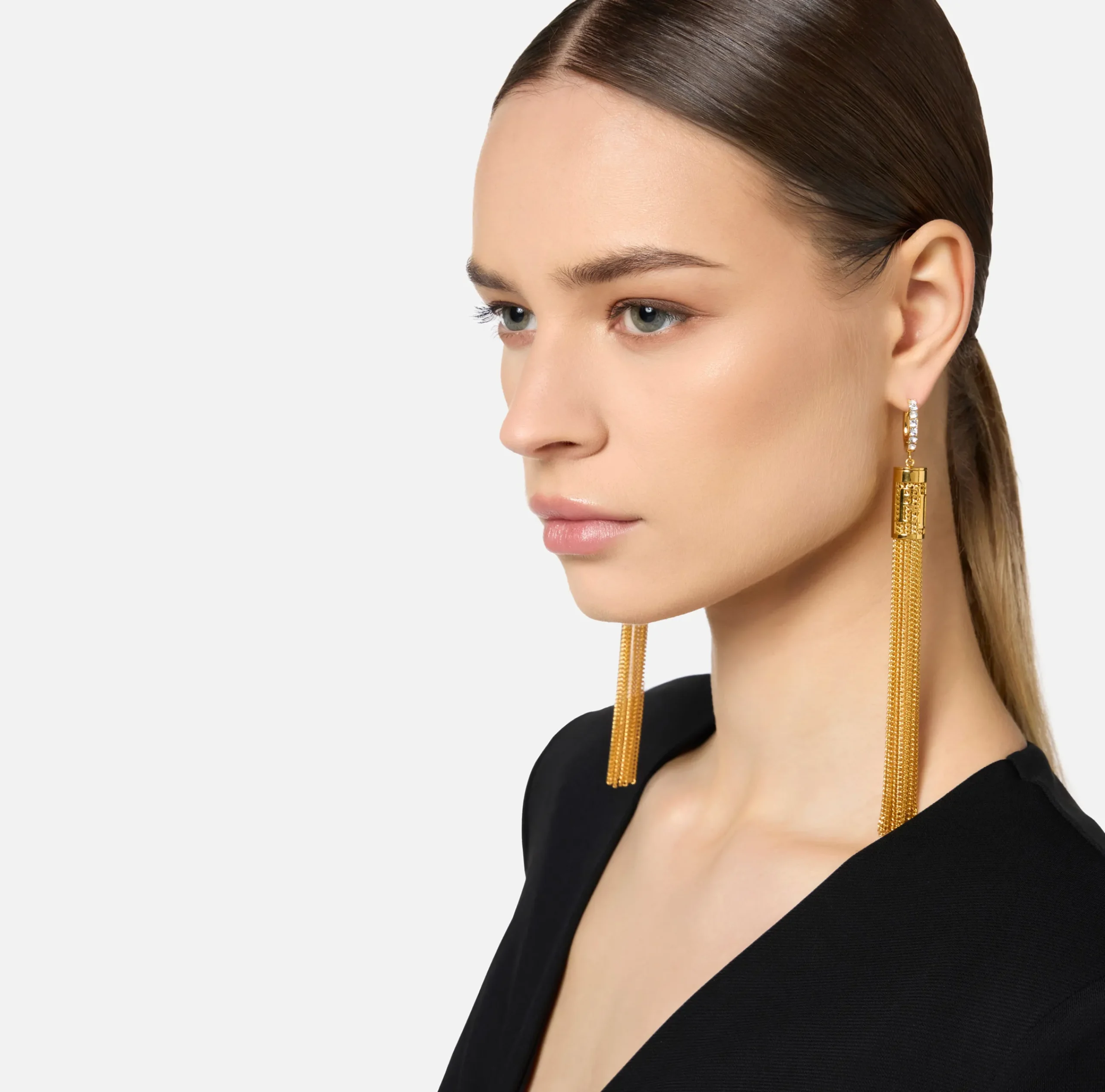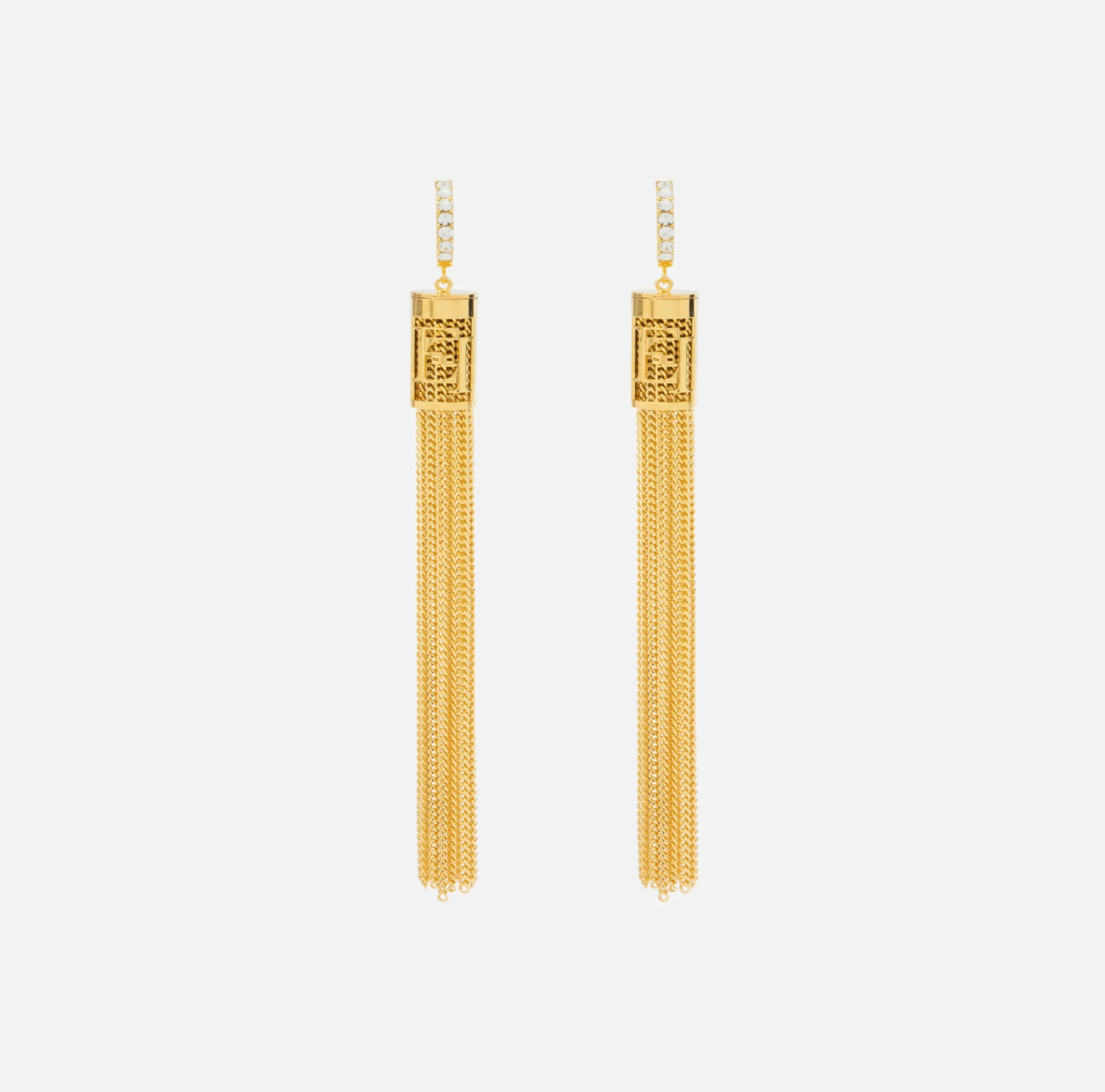 Orecchini in metallo dorato con anella impreziosita da strass, nappe in micro groumette e copri nappe logate. Sono caratterizzati da chiusura ad ago e farfallina.