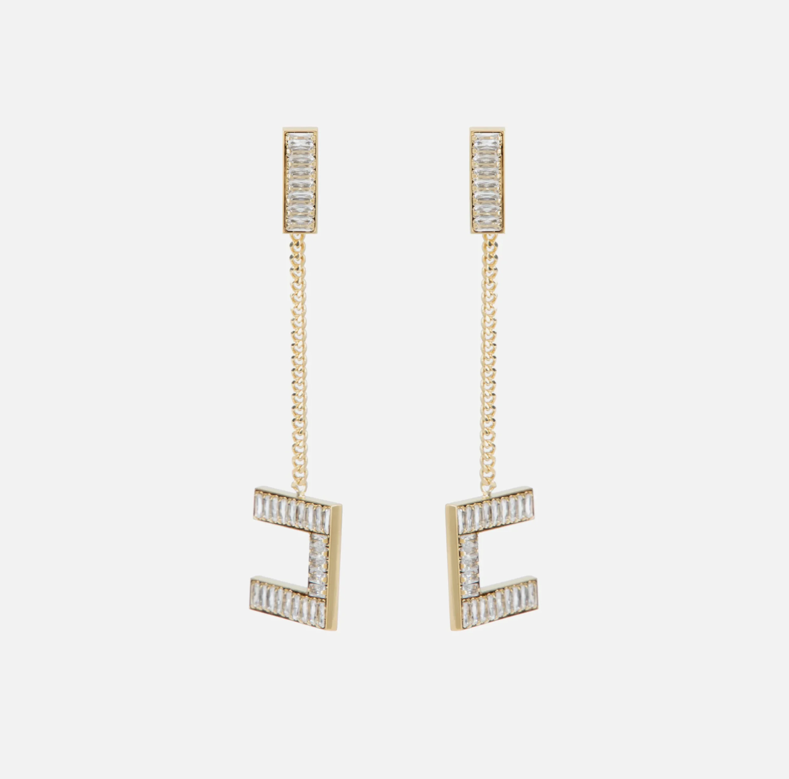 Orecchini logo in metallo dorato con pendente logo rifinito da strass baguette. Sono caratterizzati da chiusura ad ago e farfallina.