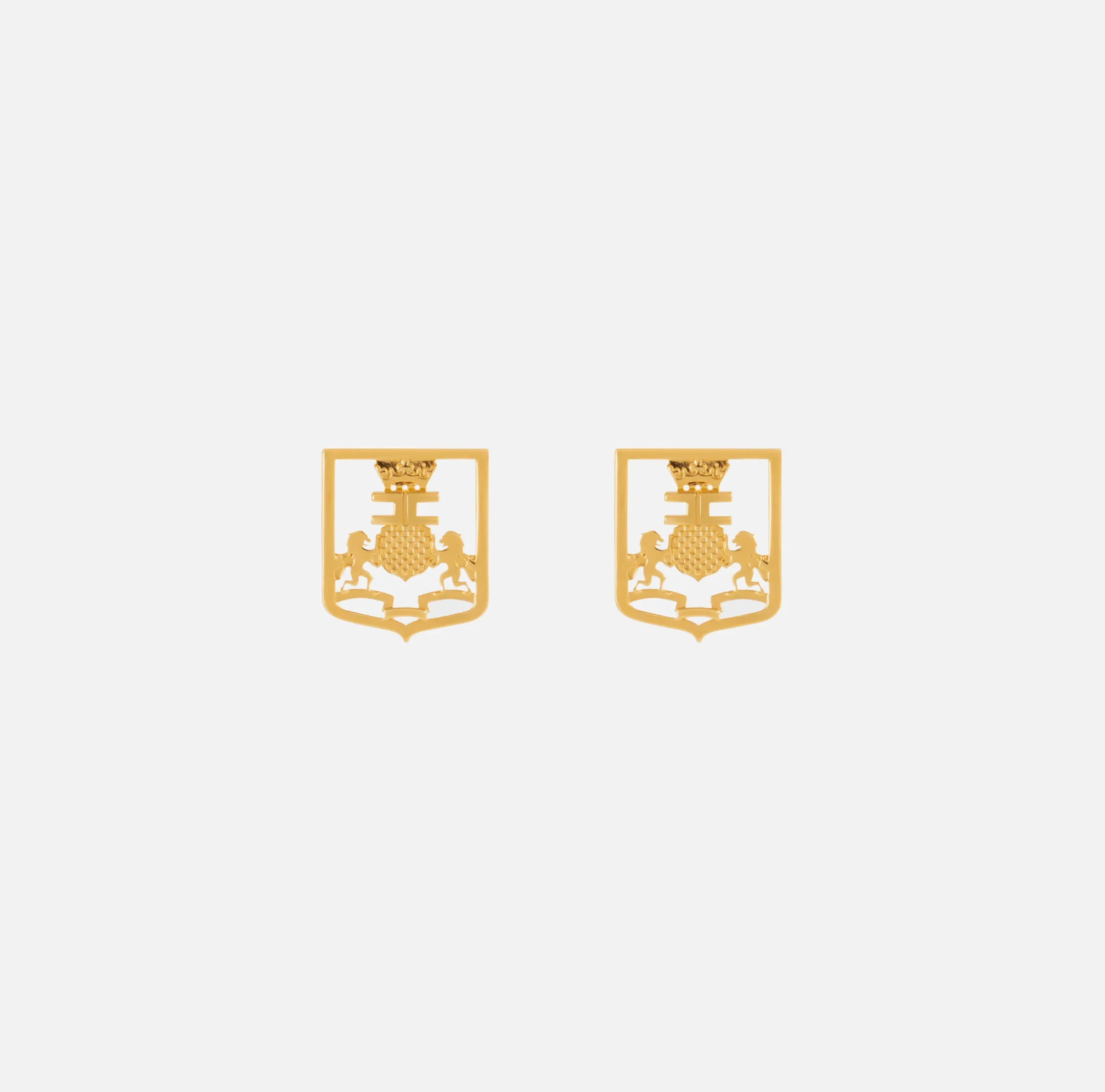 Orecchini clip in metallo dorato a forma di stemma logato.