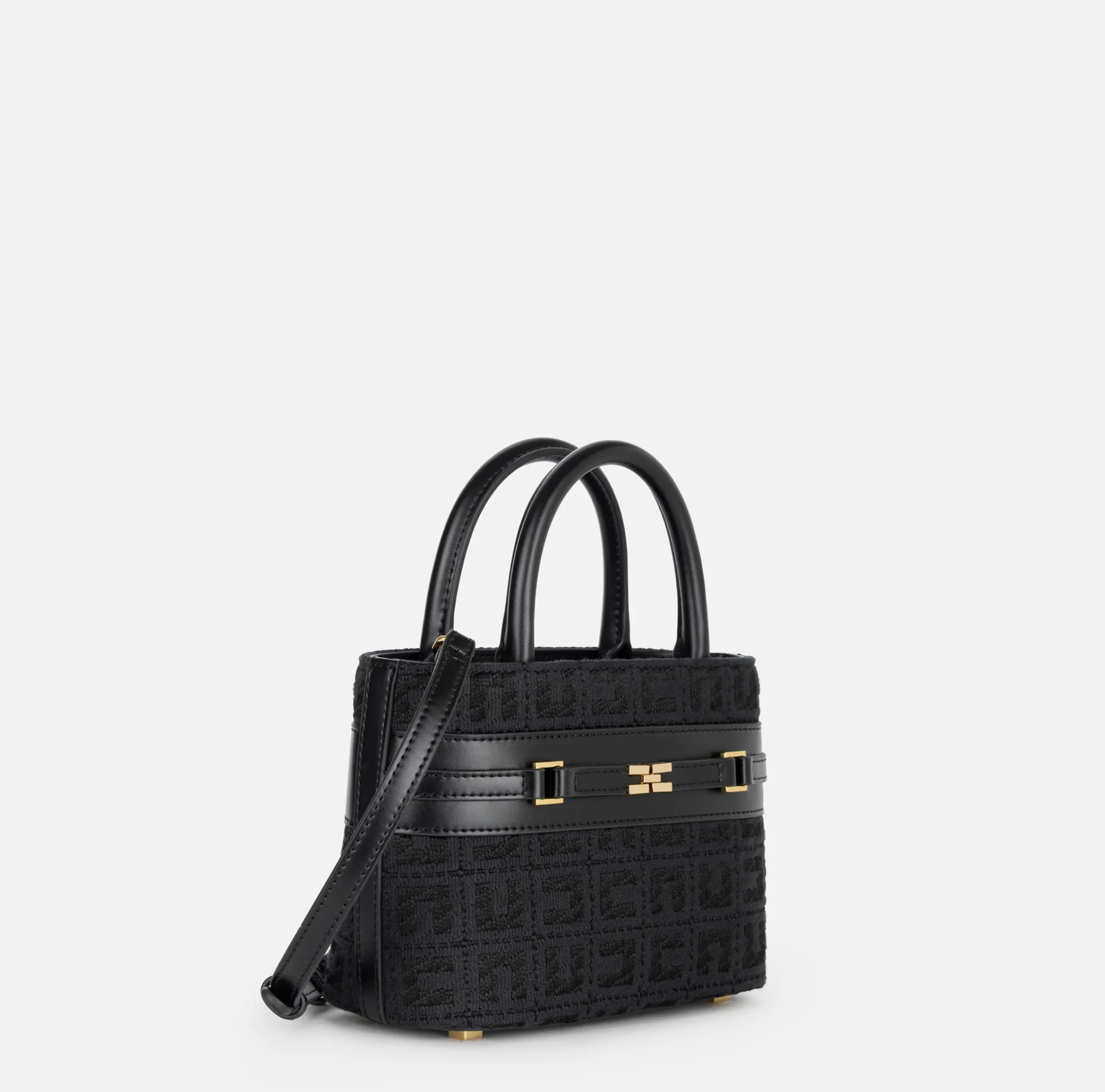 Shopper piccola in tessuto jacquard. È caratterizzata da morsetto logo in metallo dorato e tracolla removibile per portabilità a spalla.