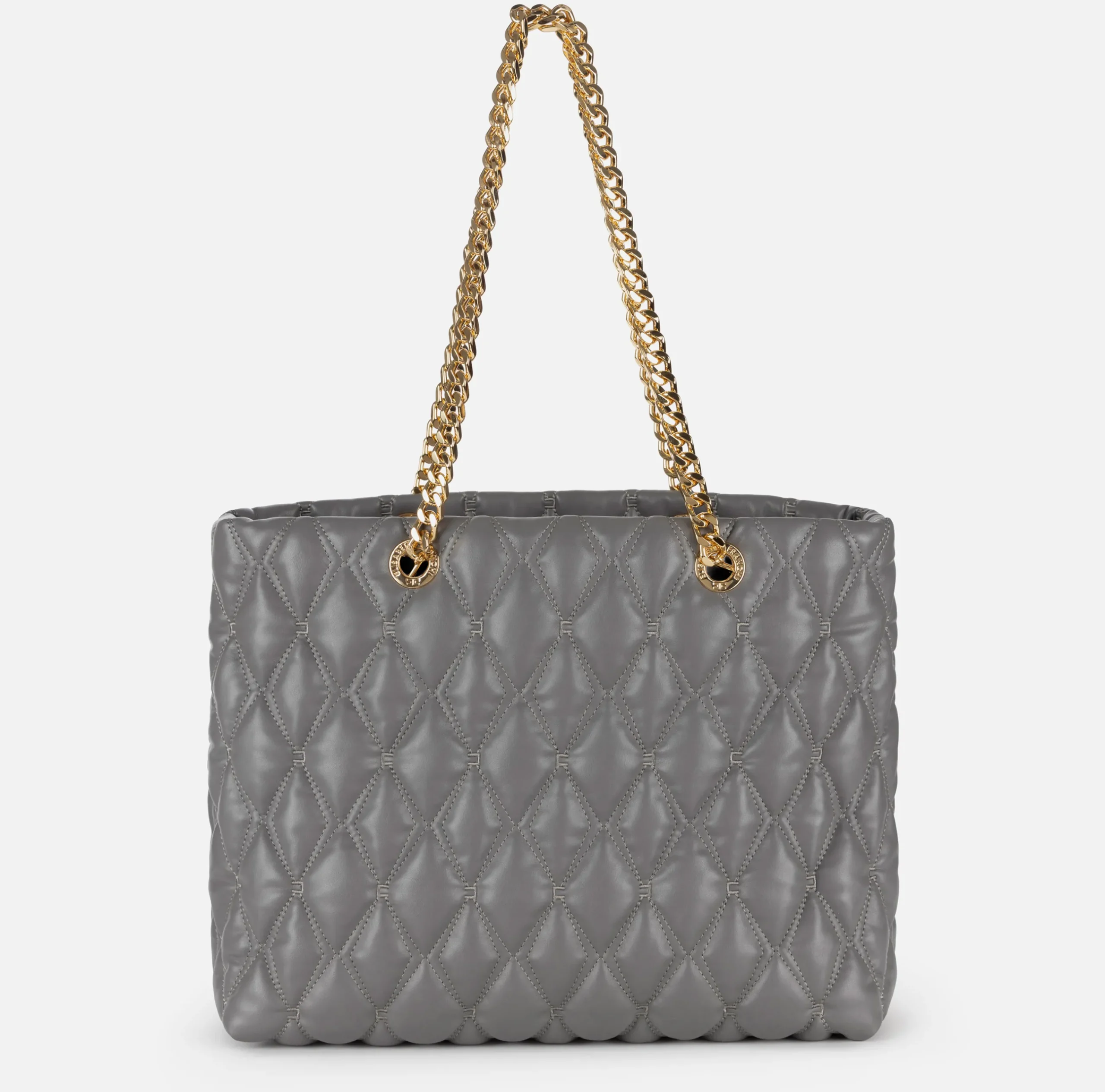 Shopper in materiale sintetico effetto pelle con lavorazione embossed con manici in catena in metallo dorato. È caratterizzata da placca logo in metallo dorato.