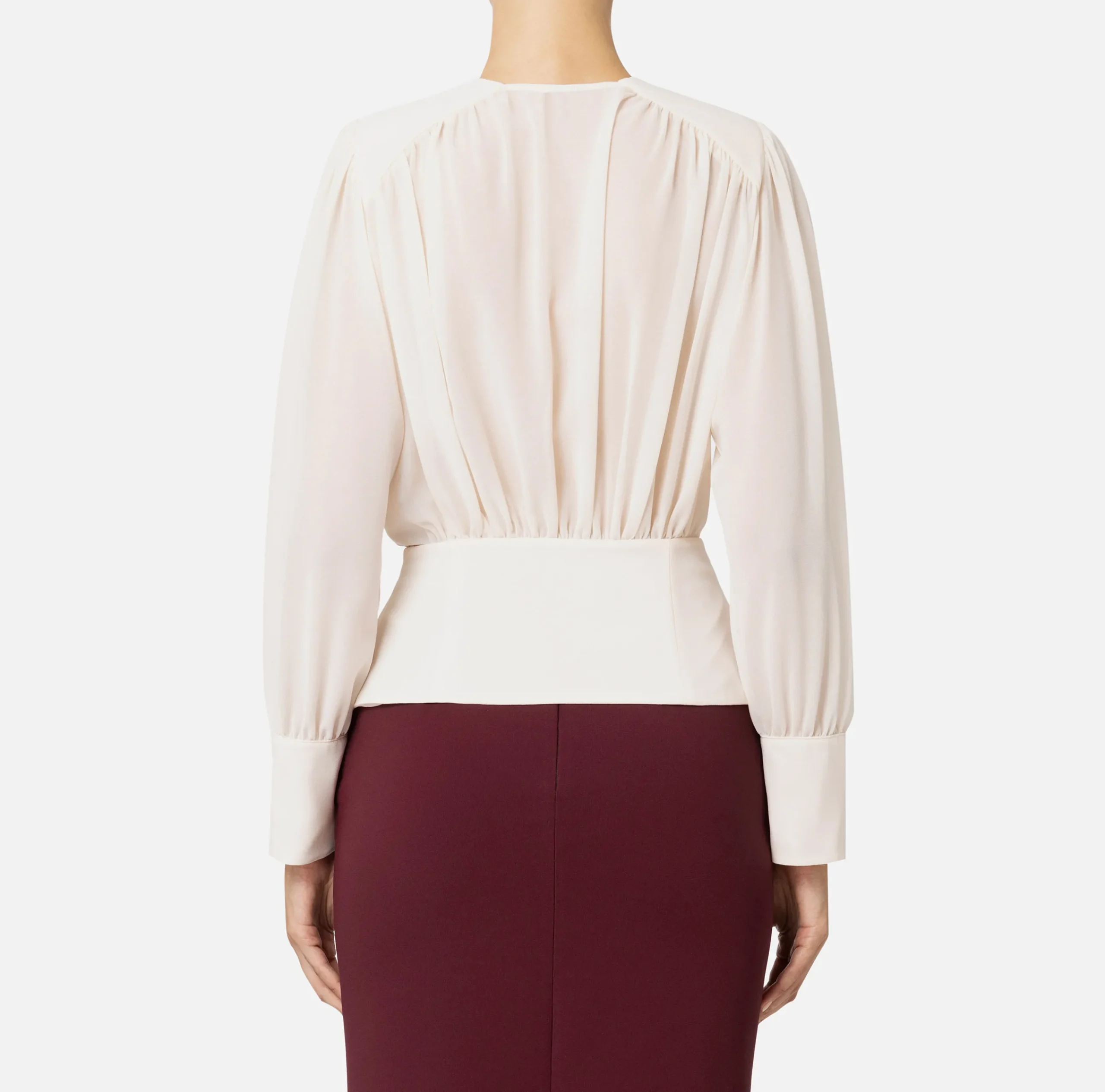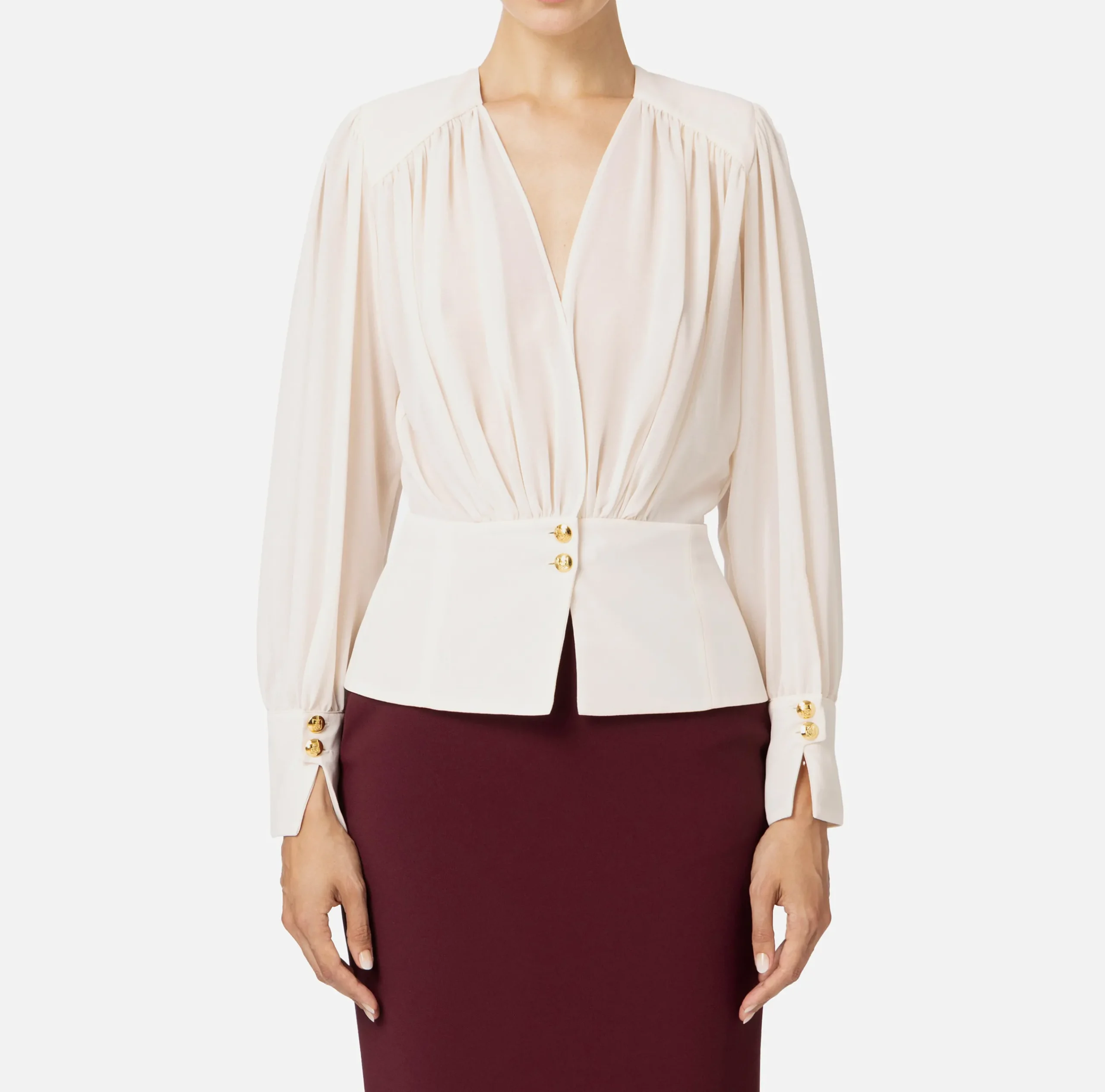 Blusa in georgette a maniche lunghe con alti polsi. È caratterizzata da profondo scollo incrociato trattenuto da baschina con bottoni in metallo dorato.