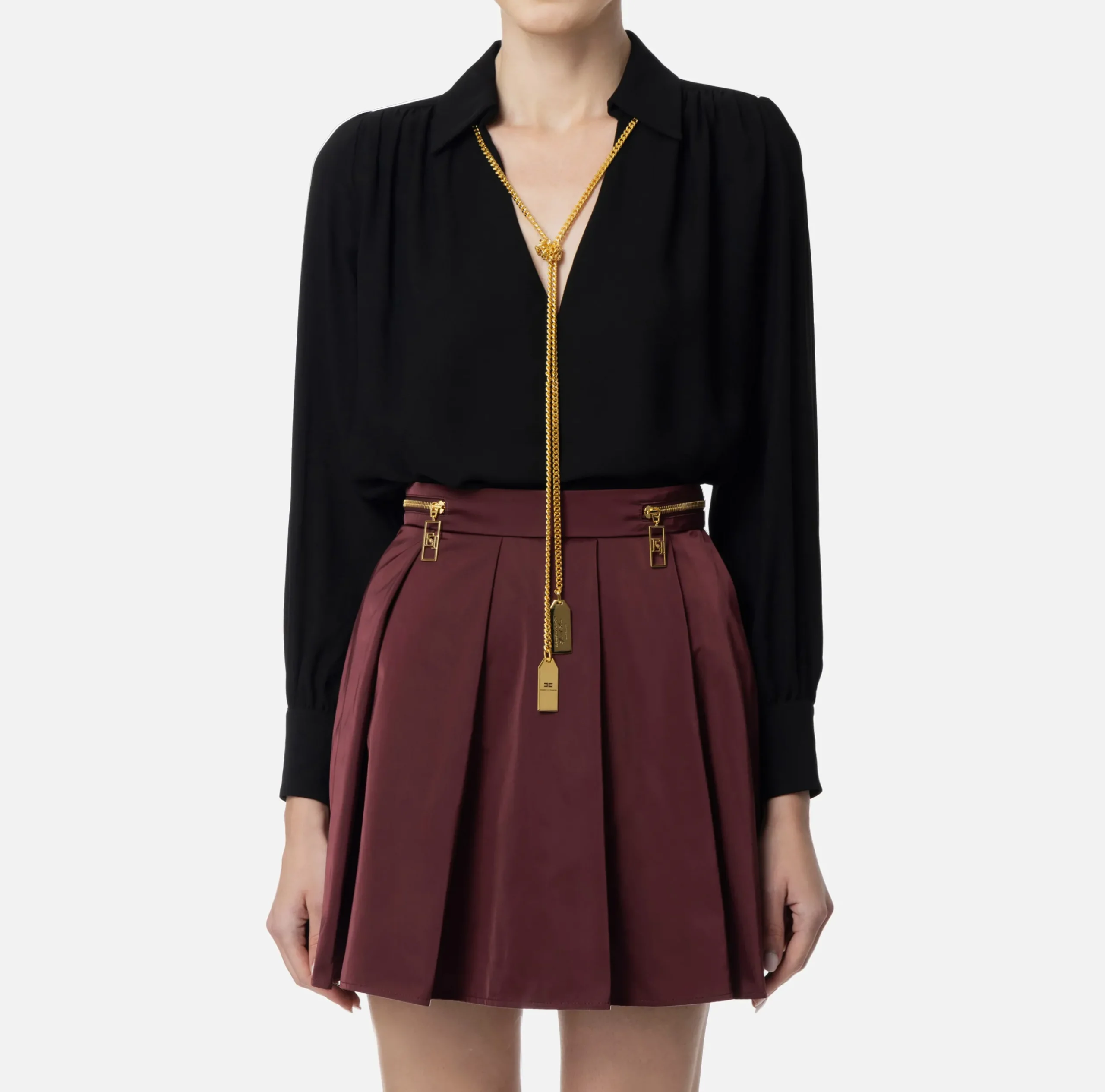 Camicia in doppia georgette a maniche lunghe con scollo a V e arricciatura sulle spalle. È caratterizzata da collana removibile con charms logo.