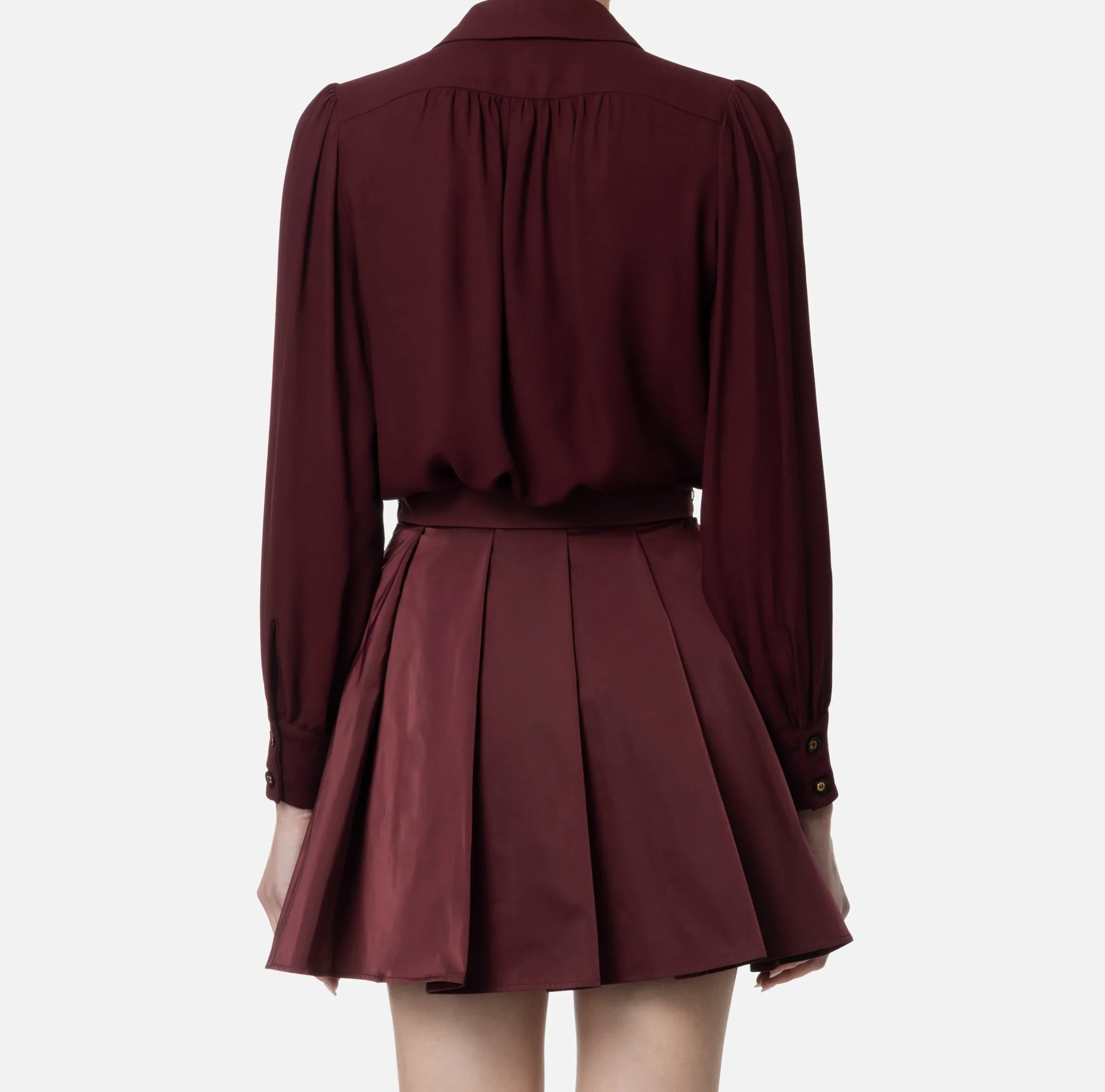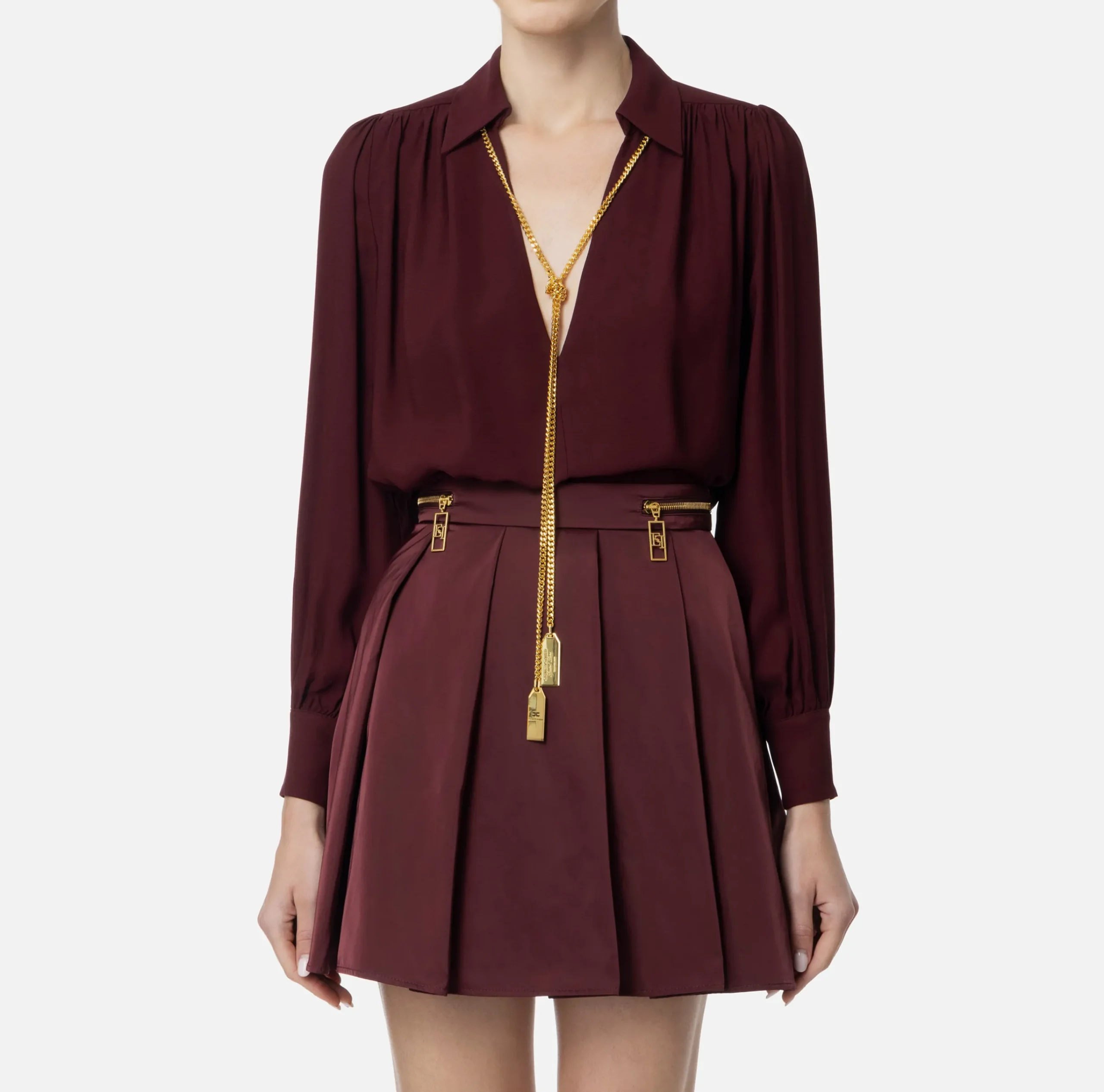 Camicia in doppia georgette a maniche lunghe con scollo a V e arricciatura sulle spalle. È caratterizzata da collana removibile con charms logo.