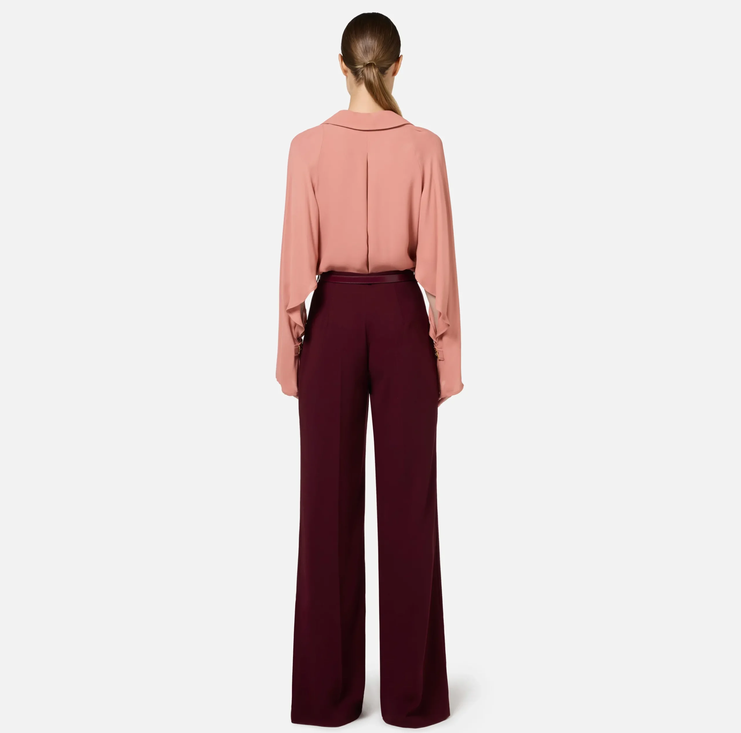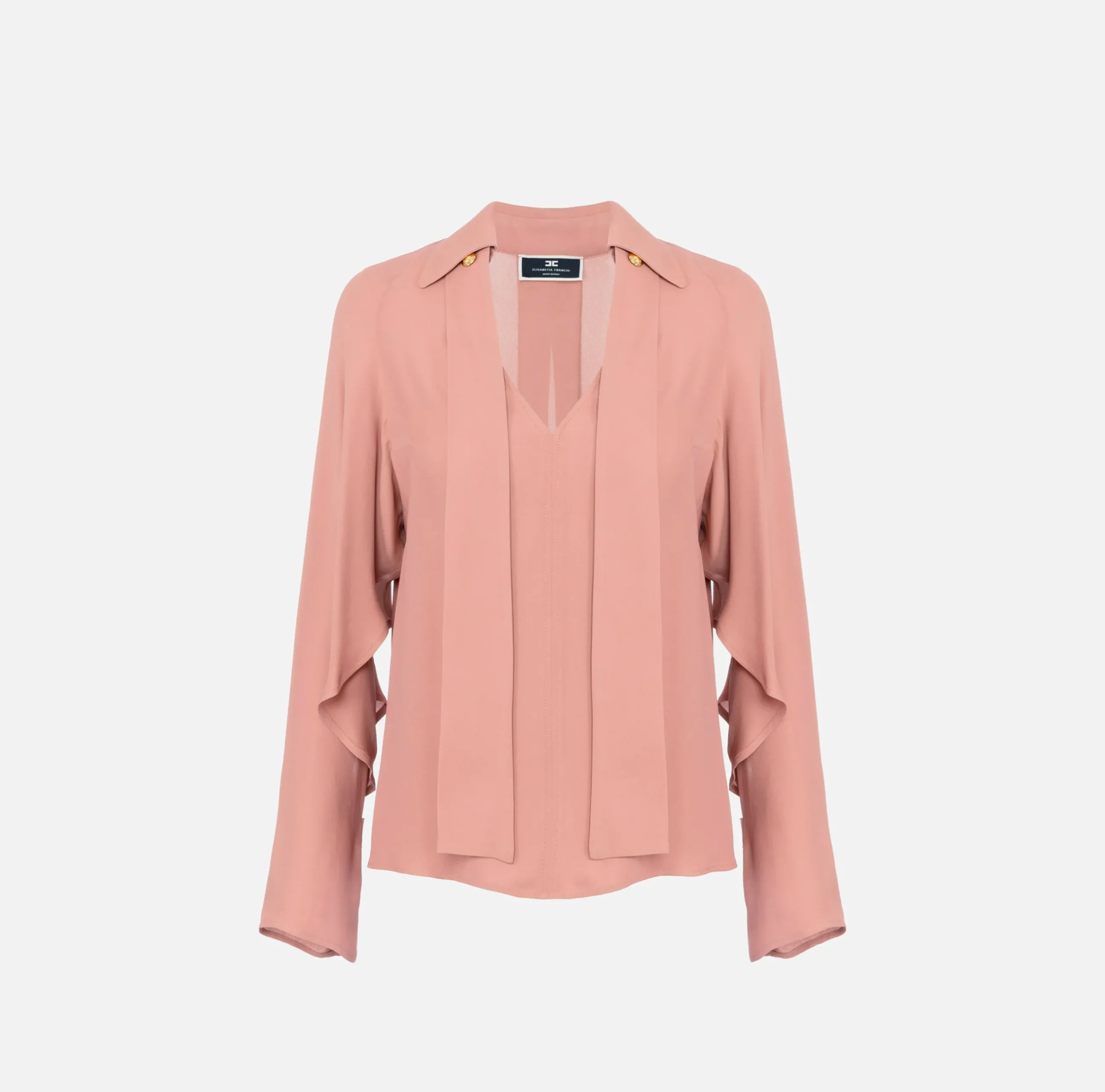 Blusa in doppia georgette con scollo a V, ampie maniche lunghe e polsi a passante con placca logo. È caratterizzata da foulard al collo trattenuta da bottoni logati.