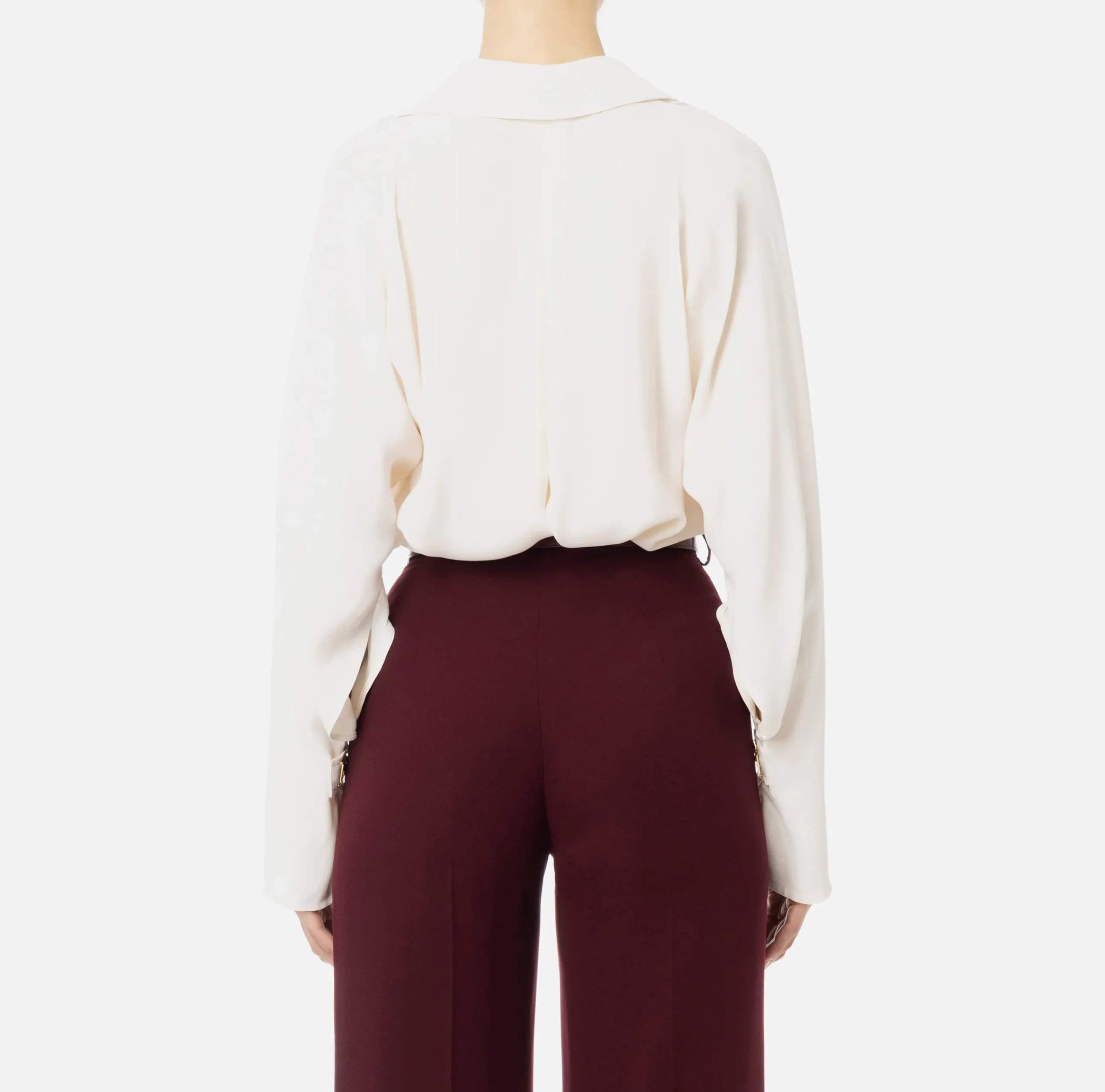 Blusa in doppia georgette con scollo a V, ampie maniche lunghe e polsi a passante con placca logo. È caratterizzata da foulard al collo trattenuta da bottoni logati.