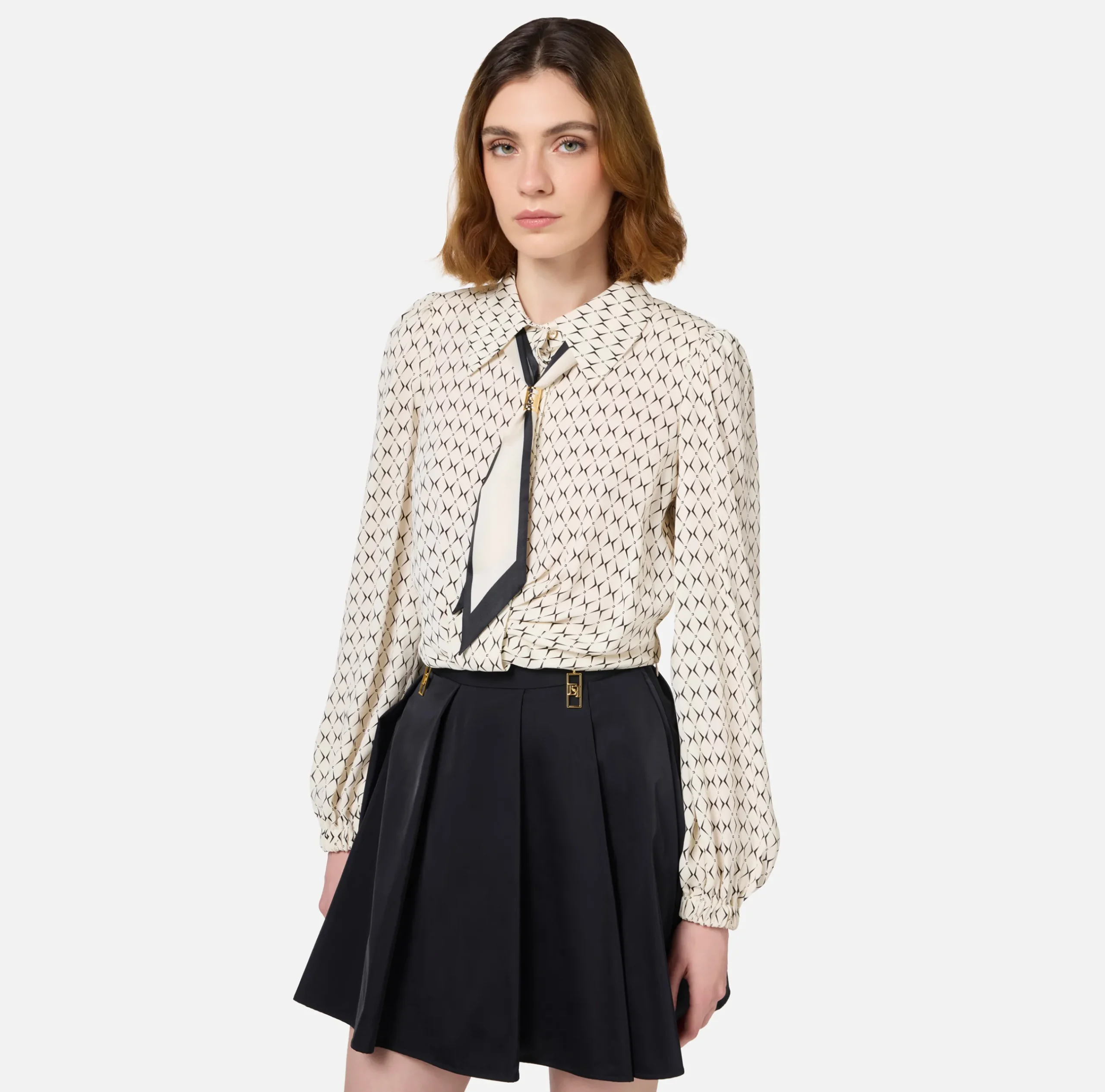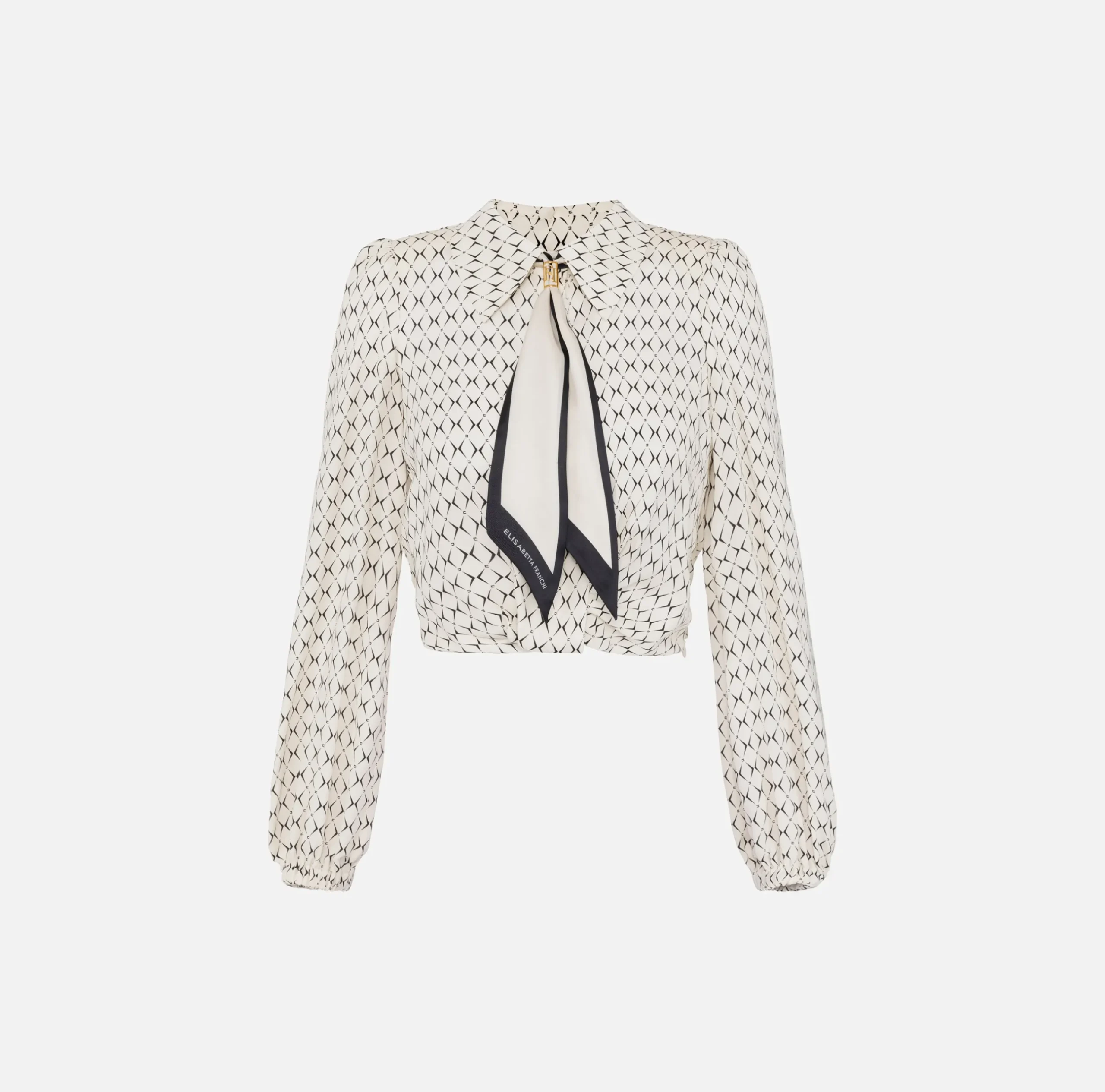 Camicia cropped in doppia georgette di viscosa stampa rombo a maniche lunghe con spalline arricciate. È caratterizzata da foulard in twill trattenuto al collo da femanodo logato in metallo dorato.