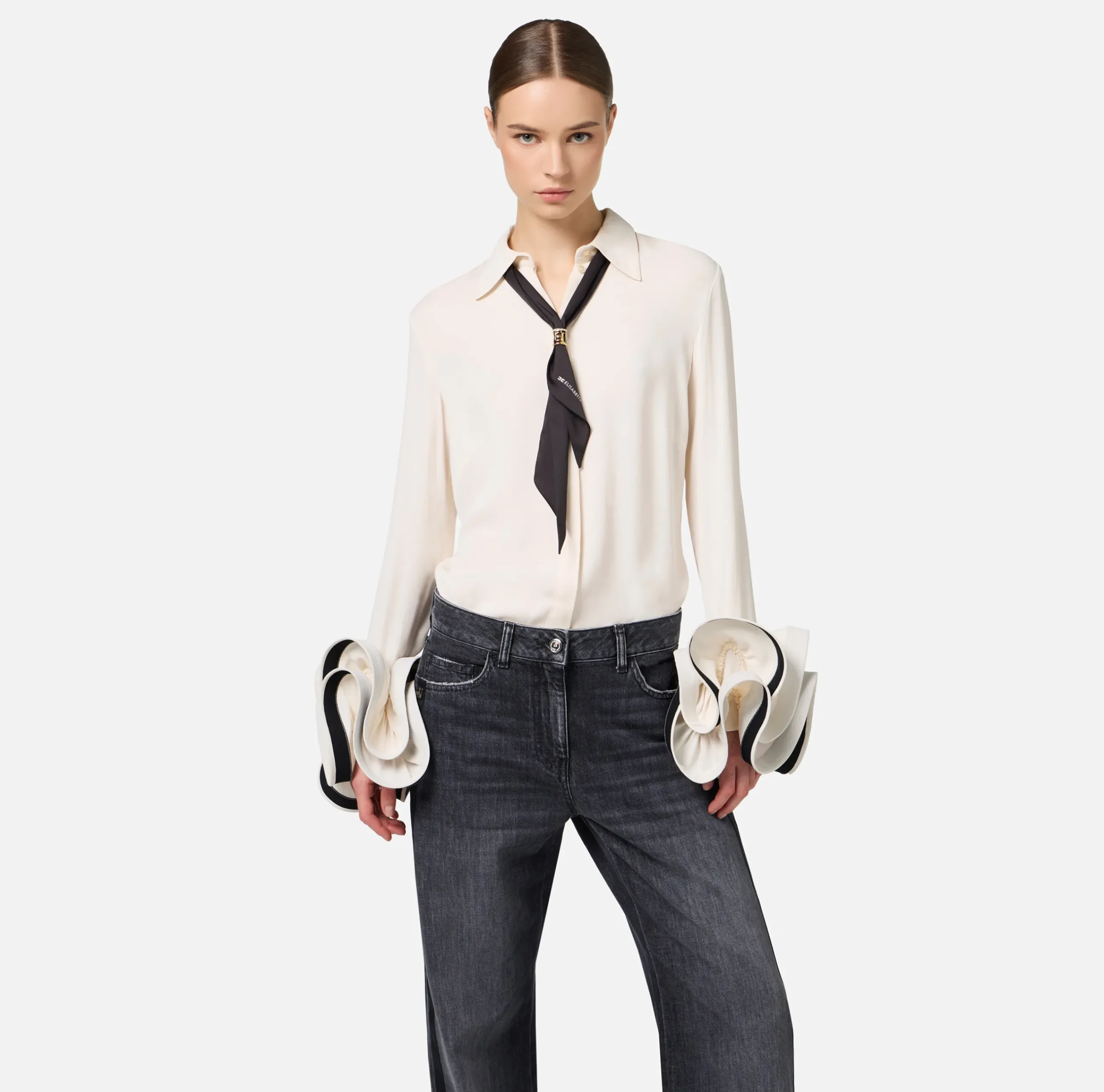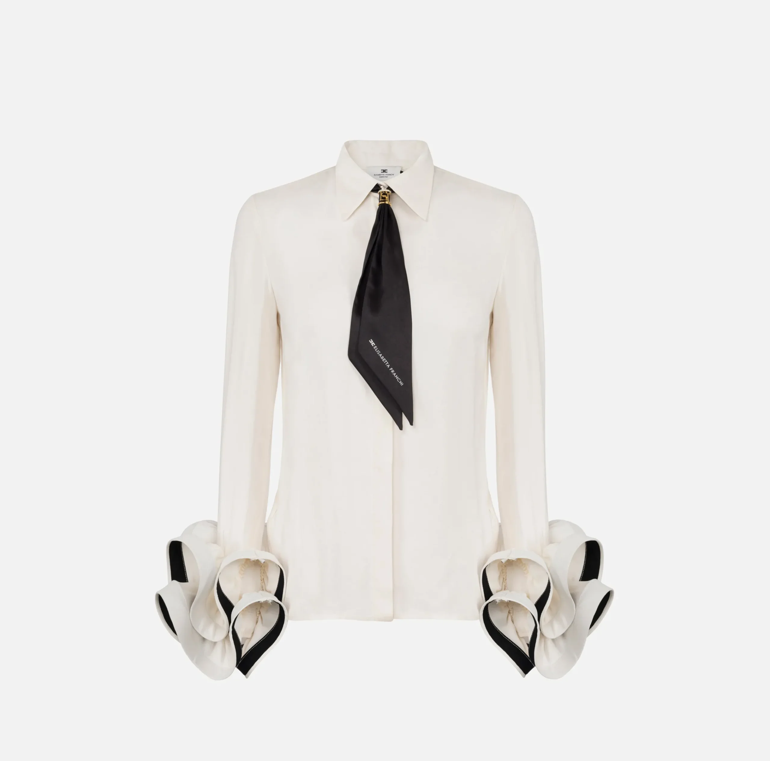 Camicia in georgette a maniche lunghe con doppia ruches al fondo con interno in contrasto colore. È caratterizzata da foulard in twill con accessorio gioiello in metallo dorato.