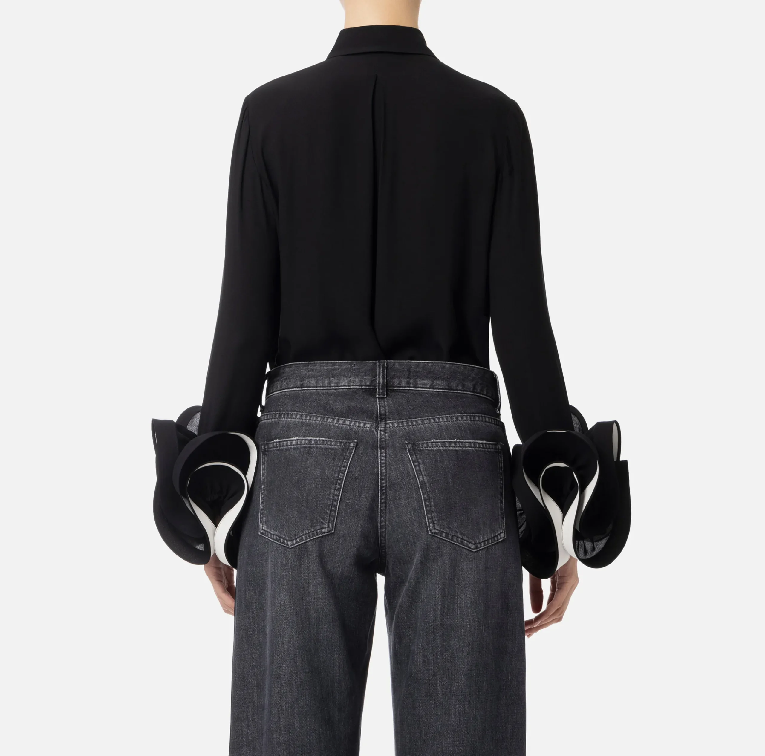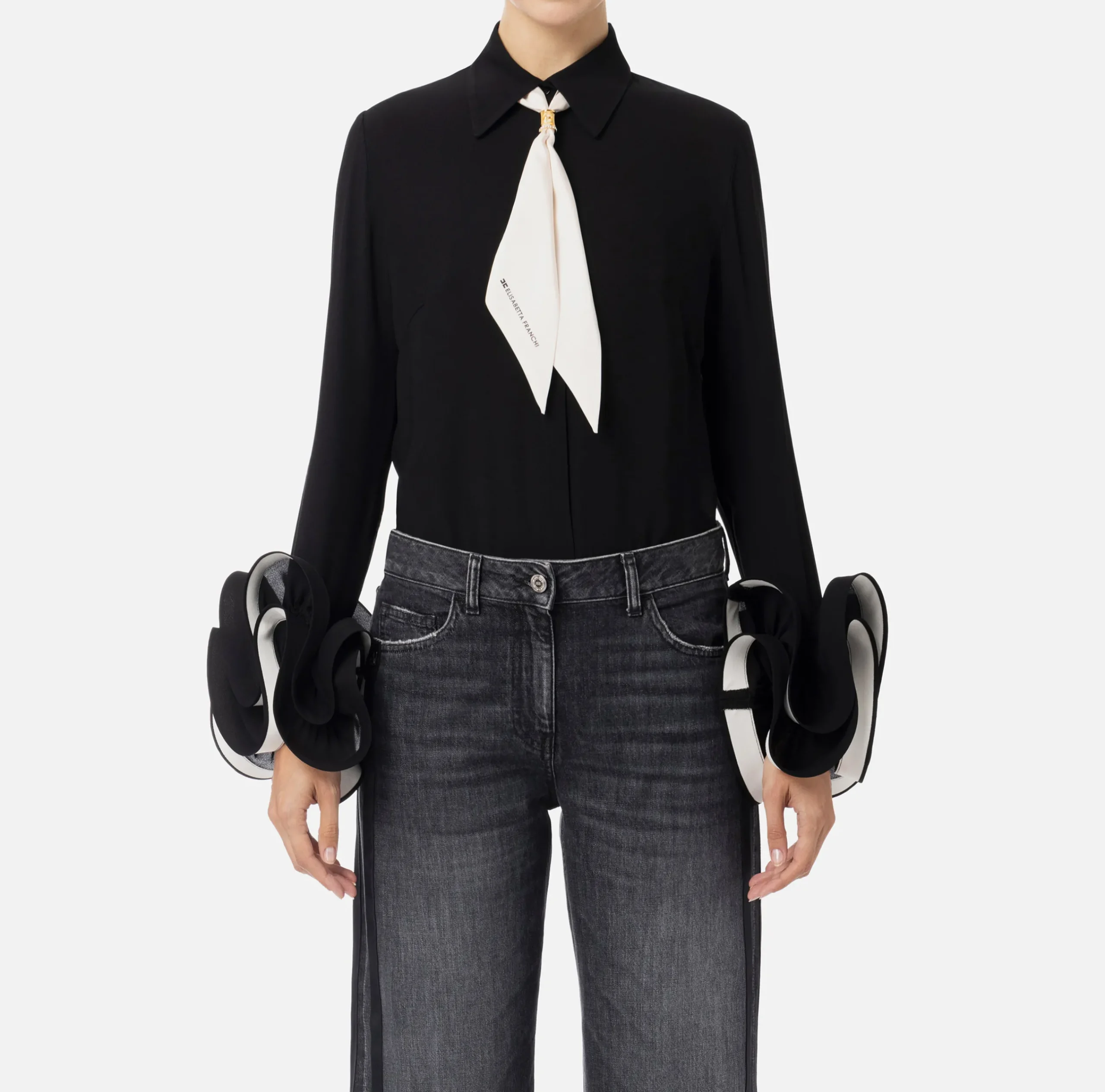 Camicia in georgette a maniche lunghe con doppia ruches al fondo con interno in contrasto colore. È caratterizzata da foulard in twill con accessorio gioiello in metallo dorato.