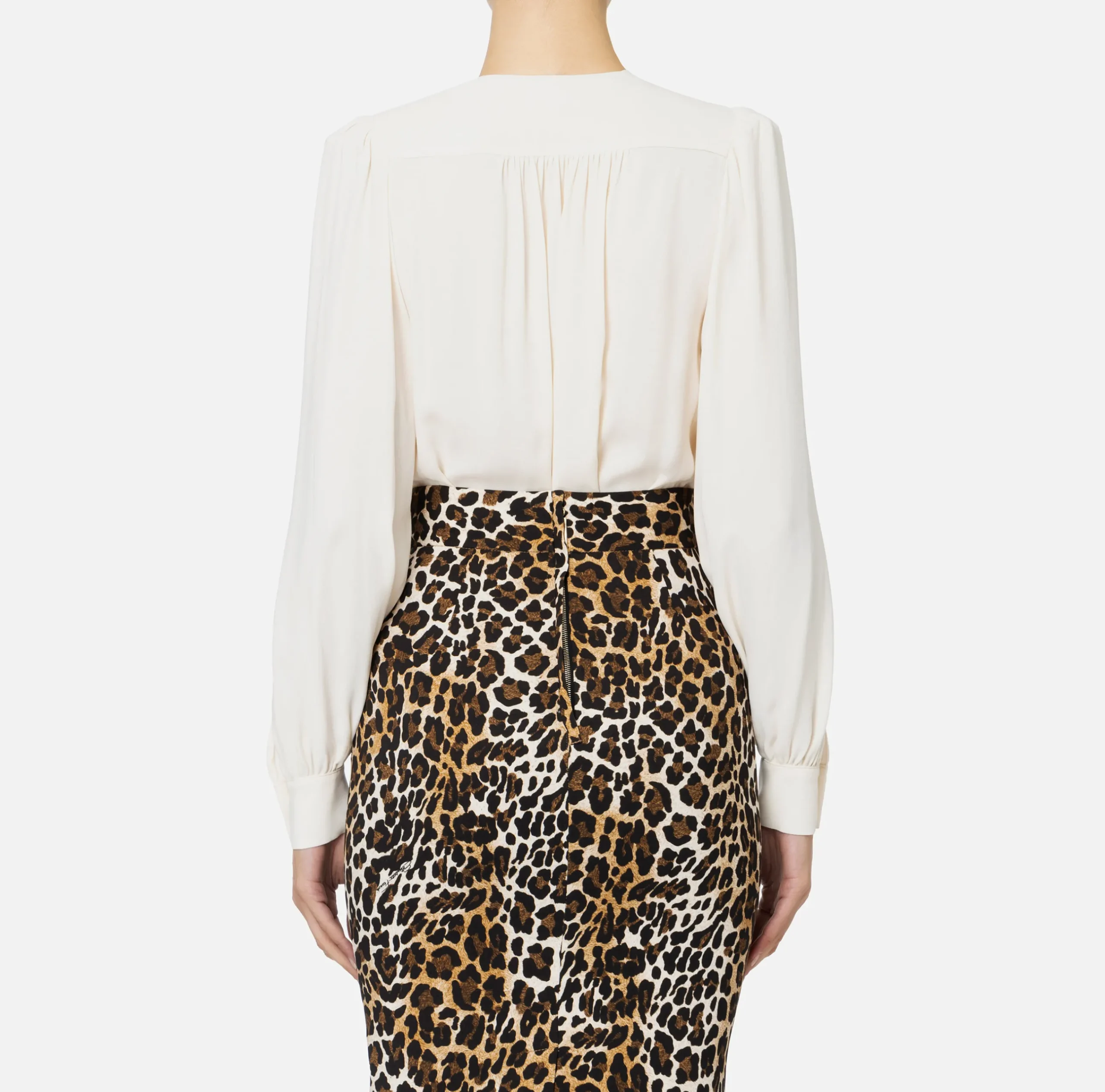 Camicia body in doppia georgette con maniche lunghe arricciate e scollo incrociato che genera un drappeggio. È caratterizzata da spallone con logo ricamato a filo in tono.