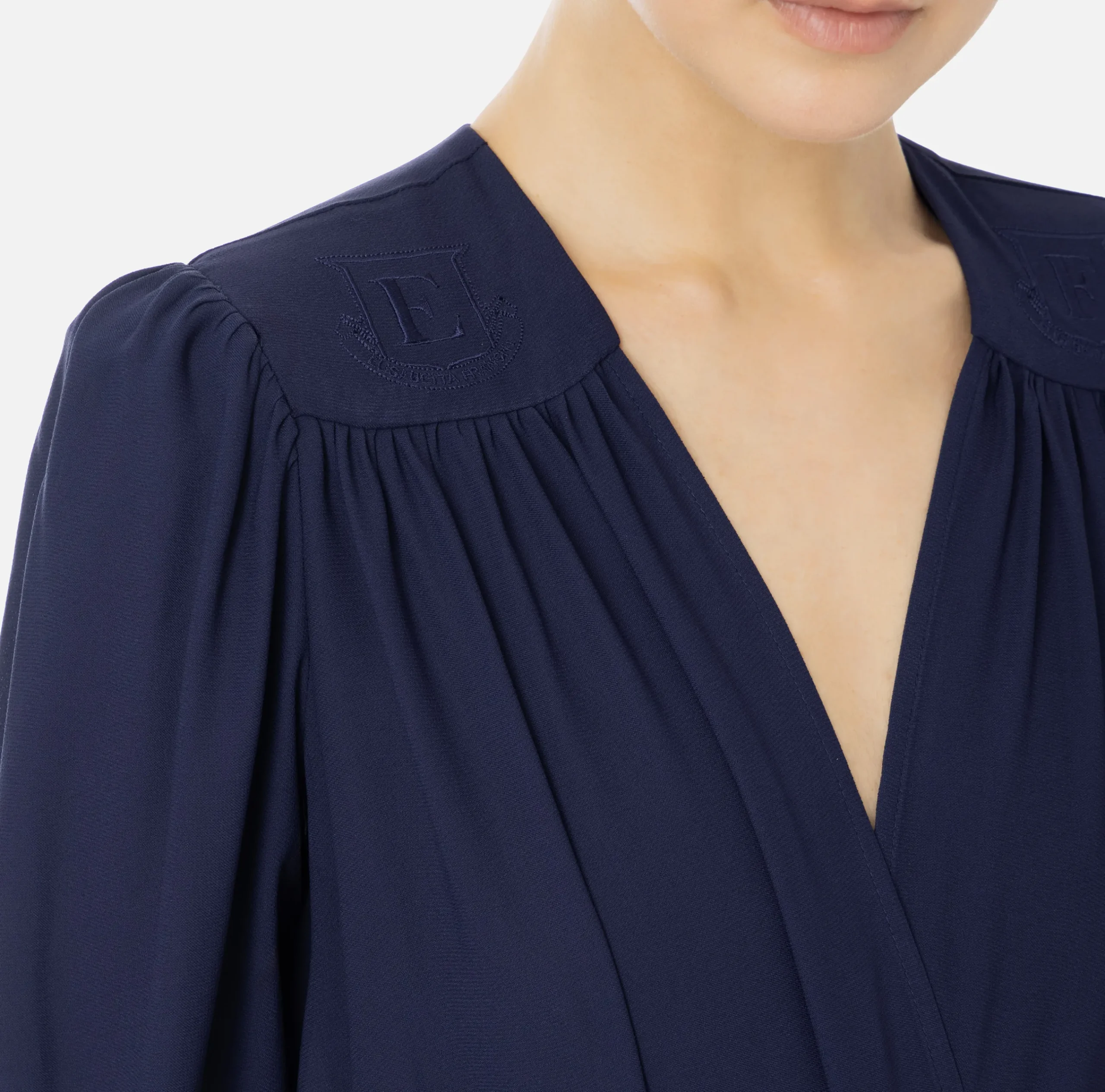 Camicia body in doppia georgette con maniche lunghe arricciate e scollo incrociato che genera un drappeggio. È caratterizzata da spallone con logo ricamato a filo in tono.