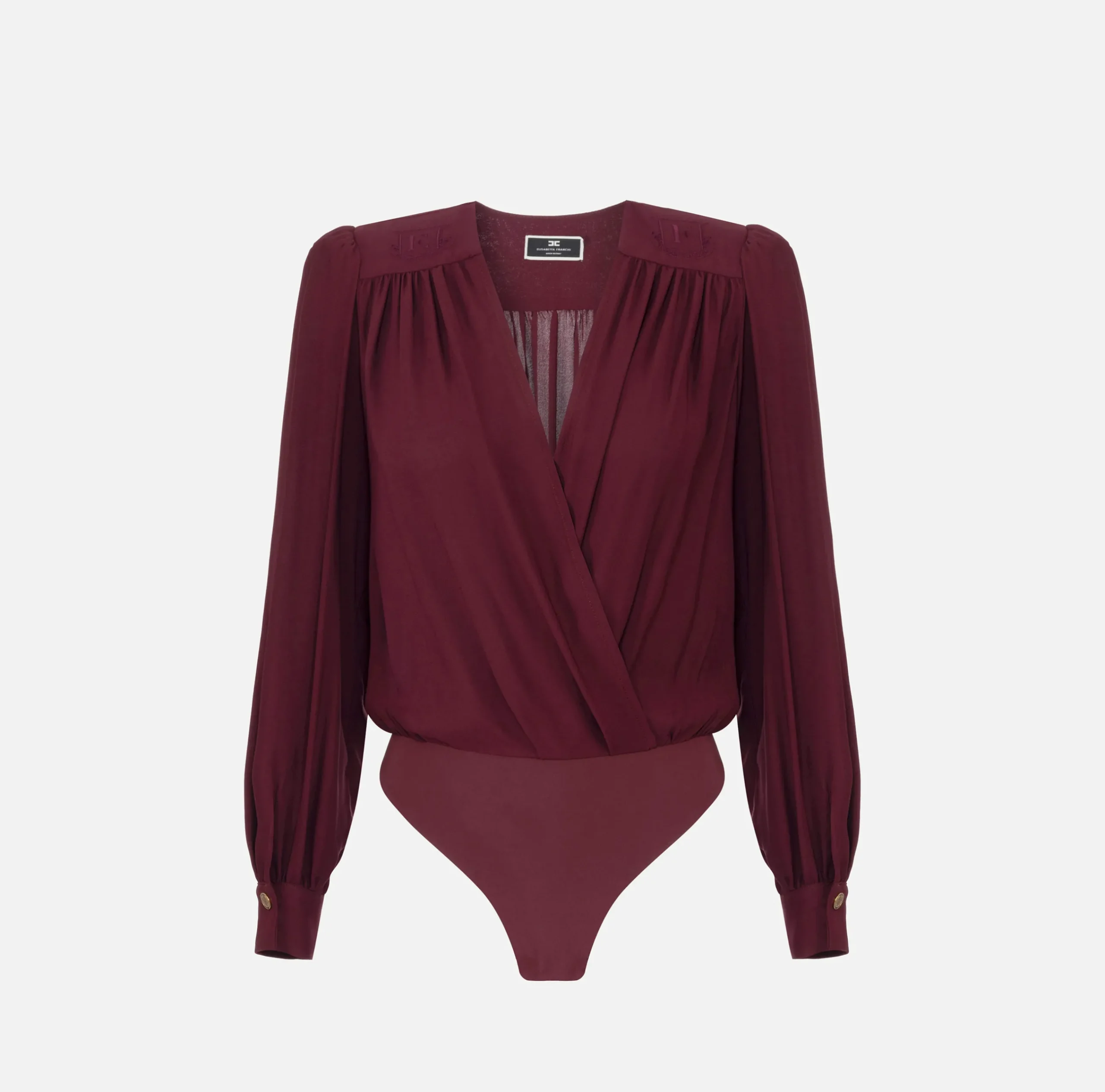 Camicia body in doppia georgette con maniche lunghe arricciate e scollo incrociato che genera un drappeggio. È caratterizzata da spallone con logo ricamato a filo in tono.