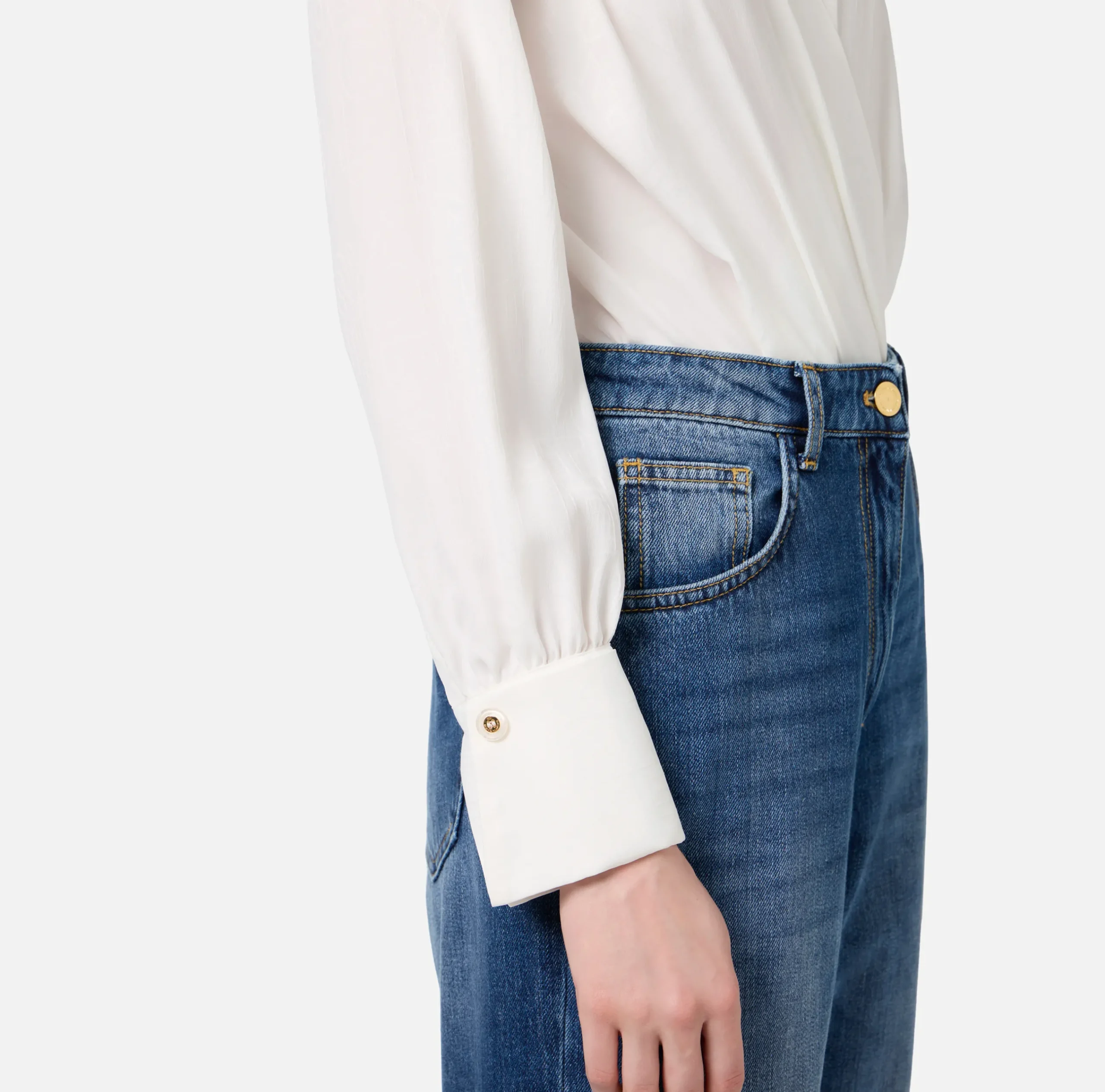 Camicia body in georgette jacquard lettering con maniche lunghe e alti polsi che si rigirano. È caratterizzata da scollo incrociato che genera un drappeggio.