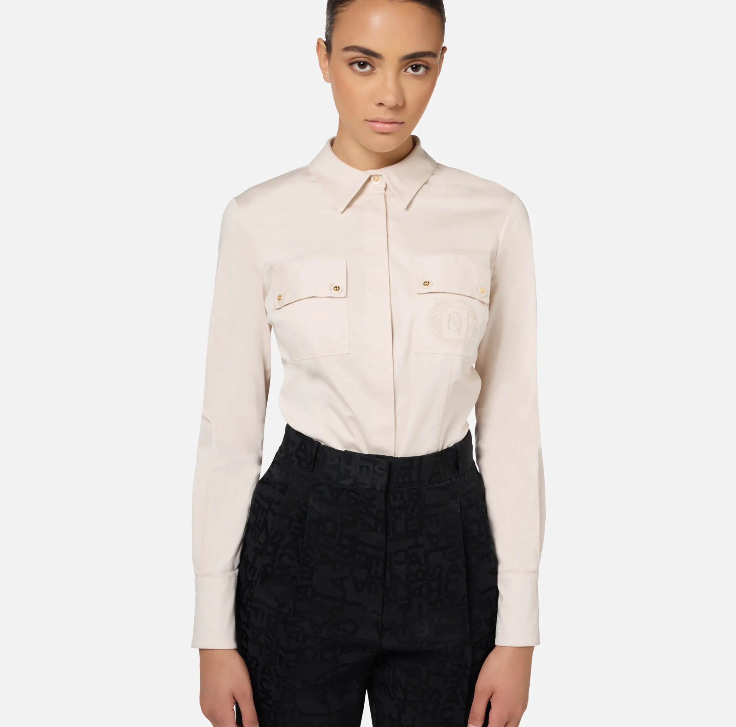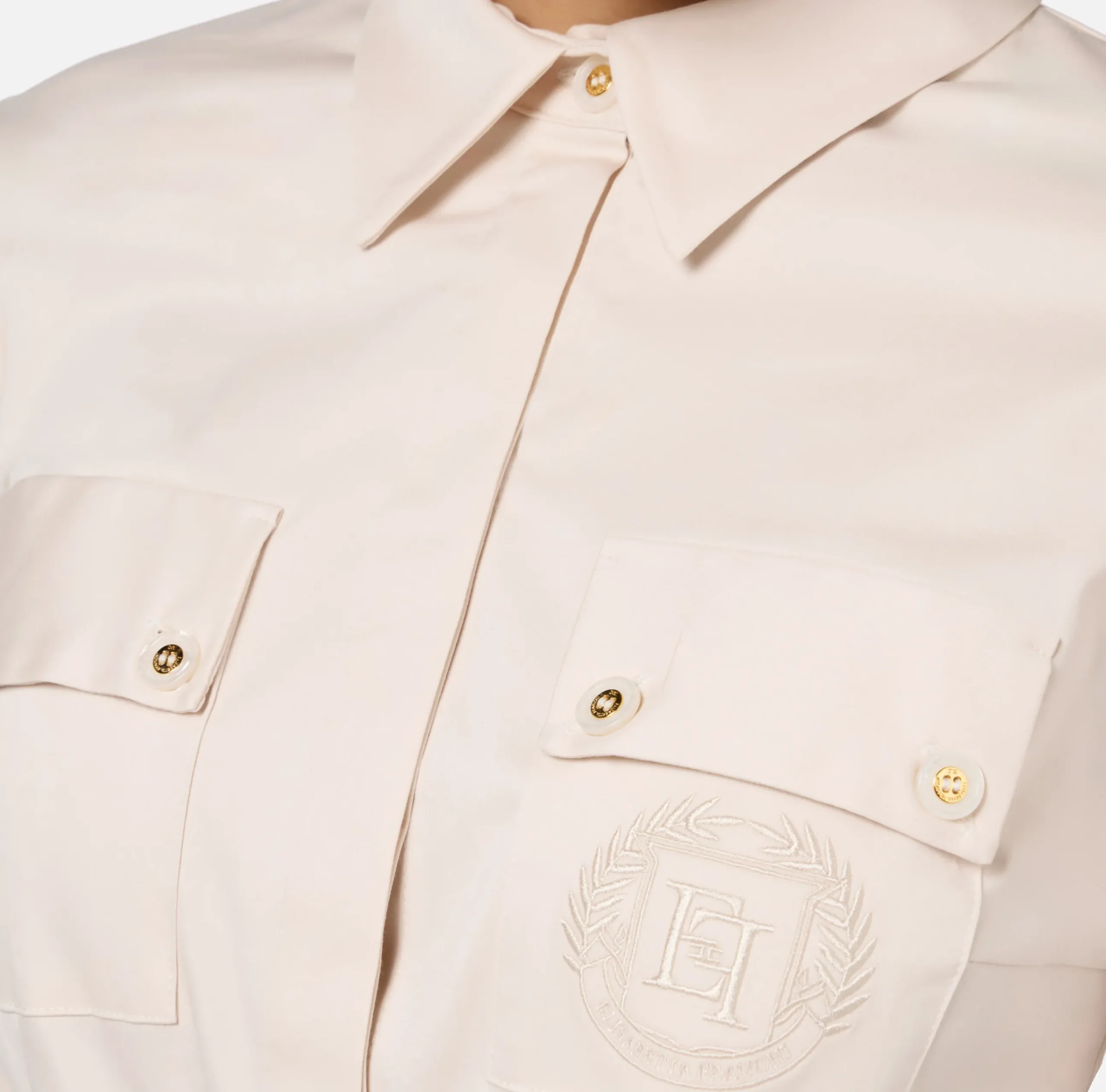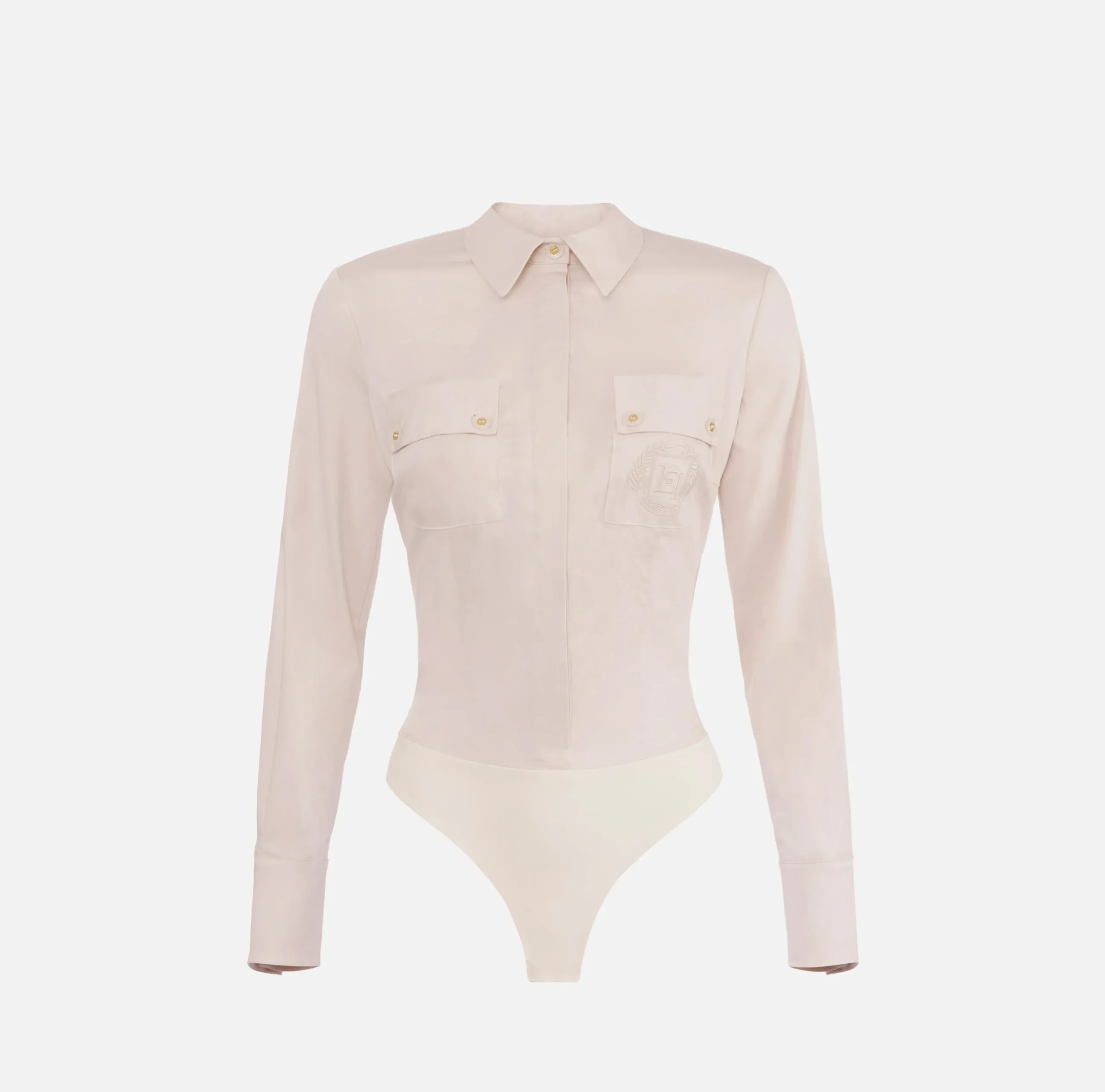 Camicia body in popeline stretch a maniche lunghe e cut-out sulla schiena. È caratterizzata da taschini sul davanti con ricamo logo a filo in tono.