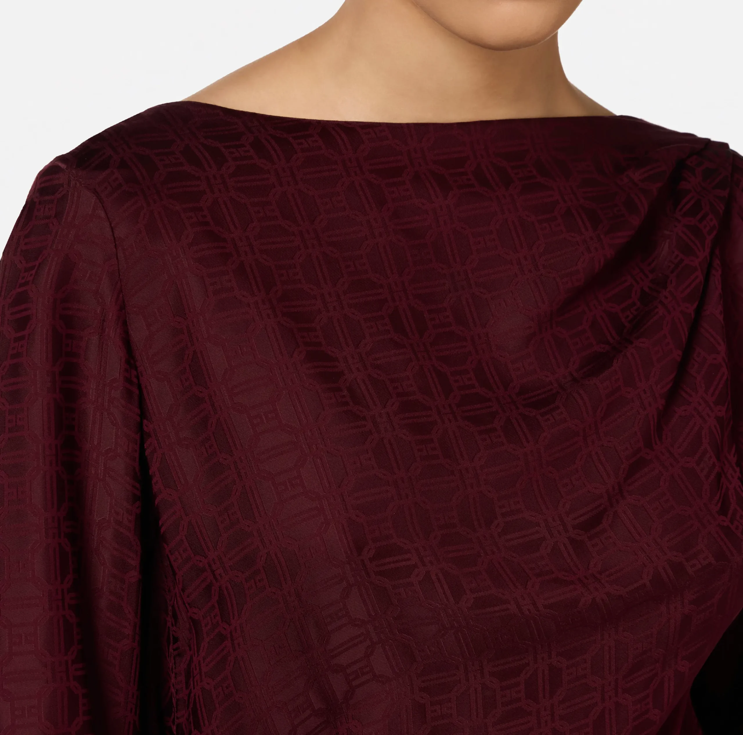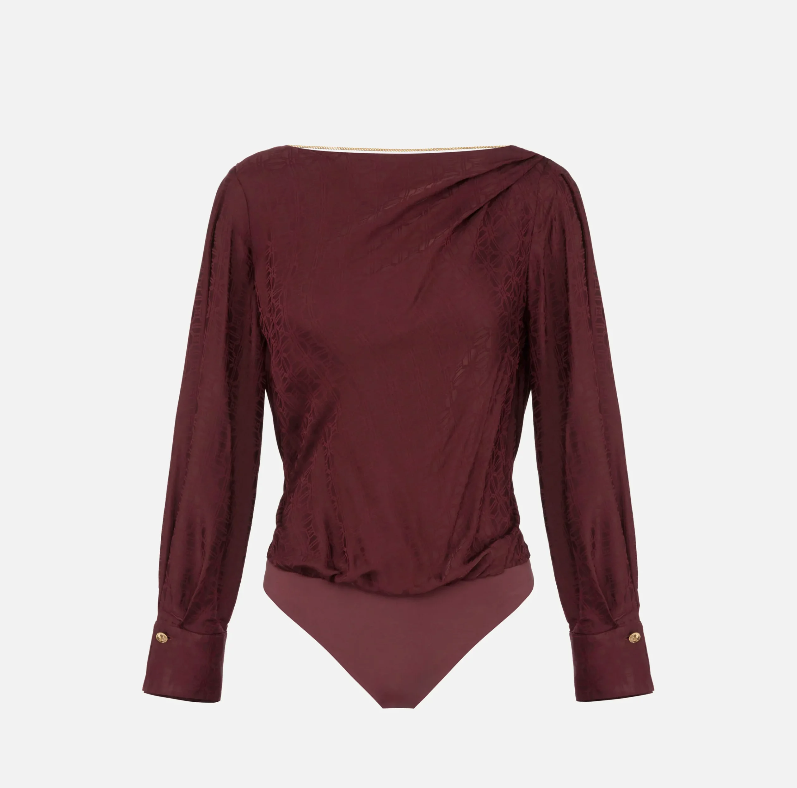 Camicia body in raso jacquard a maniche lunghe caratterizzate da contropieghe chiuse al polso da bottoni in metallo dorato. È caratterizzata da scollo a giro drappeggiato che lascia scoperta la schiena impreziosita da collana con charms logo.